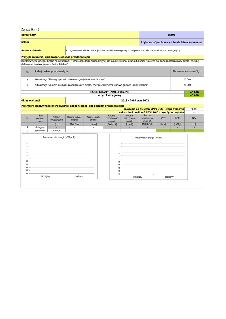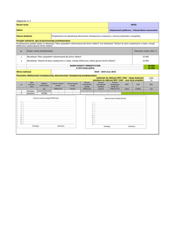 Załącznik nr 3 Numer karty IST01 Sektor Użyteczność publiczna / infrastruktura komunalna Nazwa działania Przygotowanie lub aktualizacja dokumentów strategicznych związanych z ochroną środowiska i energetyką Przyjęte założenia, opis proponowanego przedsięwzięcia Przedsięwzięcie polegać będzie na aktualizacji "Planu gospodarki niskoemisyjnej dla Gminy Istebna" oraz aktualizacji "Założeń do planu zaopatrzenia w ciepło, energię elektryczną i paliwa gazowe Gminy Istebna" lp. Rodzaj i zakres przedsięwzięcia Planowane koszty robót, zł 1 Aktualizacja "Planu gospodarki niskoemisyjnej dla Gminy Istebna" 20 000 2 Aktualizacja "Założeń do planu zaopatrzenia w ciepło, energię elektryczną i paliwa gazowe Gminy Istebna" 20 000 RAZEM KOSZTY INWESTYCYJNE w tym koszy gminy Okres realizacji 40 000 40 000 2018 - 2019 oraz 2022 Parametry efektywności energetycznej, ekonomicznej i ekologicznej przedsięwzięcia założenia do obliczeń NPV i DGC - stopa dyskonta założenia do obliczeń NPV i DGC - czas życia projektu Lp. 1 2 Stan porównywany istniejący docelowy Roczna oszczędność kosztów [zł/rok] Roczne zmniejszenie emisji CO2 [MgCO2/rok] SPBT DGC NPV [zł/rok] Roczna oszczędność energii [MWh/rok] [lata] [zł/Mg] [zł] - - - - - - - Nakłady inwestycyjne Roczne zużycie energii Roczne koszty energii [zł] [MWh/rok] 40 000 - Roczne zużycie energii [MWh/rok] 1 1 1 1 1 1 0 0 0 0 0 istniejący docelowy 3,0% 15 Roczny koszt energii [zł/rok] 1 1 1 1 1 1 0 0 0 0 0 istniejący docelowy Numer karty IST02 Użyteczność publiczna / infrastruktura komunalna Sektor Nazwa działania Poprawa efektywności energetycznej oraz wykorzystanie odnawialnych źródeł energii w budynkach użyteczności publicznej Przyjęte założenia, opis proponowanego przedsięwzięcia Projekt zakłada modernizację energetyczną budynków użyteczności publicznej w zakresie określonym jako wariant optymalny w audycie energetycznym wykonanym odrębnie dla każdego z 2 obiektów (ocieplenie ścian, ocieplenie dachów, wymiana stolarki otworowej, modernizacja instalacji centralnego ogrzewania, modernizacja systemu ciepłej wody użytkowej, zastosowanie odnawialnych źródeł energii w tym układów PV oraz pomp ciepła itp.). Planowane koszty termomodernizacji (koszt kwalifikowany), zł Rodzaj i zakres przedsięwzięcia lp. 520 000 1 Budynek Ośrodka Zdrowia w Jaworzynce 2 Termomodernizacja budynku Szkoły Podstawowej nr 2 w Istebnej Zaolziu RAZEM KOSZTY INWESTYCYJNE w tym koszy gminy Okres realizacji 1 197 000 1 717 000 1 717 000 2016-2018 Parametry efektywności energetycznej, ekonomicznej i ekologicznej przedsięwzięcia założenia do obliczeń NPV i DGC - stopa dyskonta założenia do obliczeń NPV i DGC - czas życia projektu Lp. 1 2 Stan porównywany istniejący docelowy Nakłady inwestycyjne Roczne zużycie energii Roczne koszty energii [zł] [MWh/rok] [zł/rok] 1 717 000 2 860 2 717 715 000 679 250 Roczna oszczędność energii [MWh/rok] Roczna oszczędność kosztów [zł/rok] 143,0 Roczne zużycie energii [MWh/rok] 35 750,0 Roczne zmniejszenie emisji CO2 [MgCO2/rok] SPBT DGC NPV [lata] [zł/Mg] [zł] 57,2 48,0 Roczny koszt energii [zł/rok] 3 500 800 000 3 000 700 000 2 500 600 000 2 000 500 000 400 000 1 500 300 000 1 000 200 000 500 100 000 0 istniejący docelowy 0 istniejący 3,0% 15 docelowy 1 889,5 -1 290 219 Numer karty IST03 Użyteczność publiczna / infrastruktura komunalna Sektor Poprawa efektywności energetycznej oraz wykorzystanie odnawialnych źródeł energii w budynkach użyteczności publicznej pozostałe budynki gminne Nazwa działania Przyjęte założenia, opis proponowanego przedsięwzięcia Projekt zakłada modernizację energetyczną budynków użyteczności publicznej w zakresie określonym jako wariant optymalny w audycie energetycznym wykonanym odrębnie dla budynków przy postawionych warunkach brzegowych: - konieczności zwiększenia efektywności energetycznej nie mniej niż o 25% dla każdego obiektu; - wykorzystania w jak największym stopniu OZE lp. 1 Rodzaj i zakres przedsięwzięcia Planowane koszty robót, zł Poprawa efektywności energetycznej oraz wykorzystanie odnawialnych źródeł energii w budynkach użyteczności publicznej pozostałe budynki gminne RAZEM KOSZTY INWESTYCYJNE w tym koszy gminy Okres realizacji 1 500 000 1 500 000 1 500 000 2016-2020 Parametry efektywności energetycznej, ekonomicznej i ekologicznej przedsięwzięcia założenia do obliczeń NPV i DGC - stopa dyskonta założenia do obliczeń NPV i DGC - czas życia projektu Lp. 1 2 Stan porównywany istniejący docelowy Nakłady inwestycyjne Roczne zużycie energii Roczne koszty energii [zł] [MWh/rok] [zł/rok] 1 500 000 2 860 2 574 715 000 643 500 Roczna oszczędność energii [MWh/rok] Roczna oszczędność kosztów [zł/rok] 286,0 Roczne zużycie energii [MWh/rok] 71 500,0 Roczne zmniejszenie emisji CO2 [MgCO2/rok] SPBT DGC NPV [lata] [zł/Mg] [zł] 114,4 21,0 Roczny koszt energii [zł/rok] 3 500 800 000 3 000 700 000 2 500 600 000 2 000 500 000 400 000 1 500 300 000 1 000 200 000 500 100 000 0 istniejący docelowy 0 istniejący 3,0% 15 docelowy 473,3 -646 438 Numer karty IST04 Sektor Użyteczność publiczna / infrastruktura komunalna Monitoring zużycia paliw i nośników energii w budynkach użyteczności publicznej, system zarządzania energią w budynkach użyteczności publicznej Nazwa działania Przyjęte założenia, opis proponowanego przedsięwzięcia Szacuje się wykorzystanie systemu przyniesie zmniejszenie zużycia energii na poziomie ok. 10% zużycia we wszystkich budynków. lp. 1 Rodzaj i zakres przedsięwzięcia Planowane koszty robót, zł 30 000 Projekt polegać będzie na monitoringu nośników energii oraz wody. Dla obiektów należy wykonywać raporty z eksploatacji. RAZEM KOSZTY INWESTYCYJNE w tym koszy gminy Okres realizacji 30 000 30 000 2016 - 2020 Parametry efektywności energetycznej, ekonomicznej i ekologicznej przedsięwzięcia założenia do 