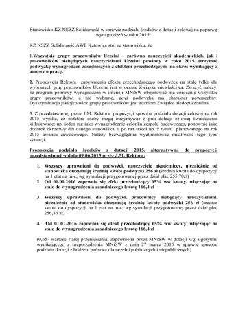 Stanowisko KZ NSZZ Solidarność w sprawie podziału środków z dotacji celowej na poprawę wynagrodzeń w roku 2015r KZ NSZZ Solidarność AWF Katowice stoi na stanowisku, że 1.Wszystkie grupy pracowników Uczelni – zarówno nauczycieli akademickich, jak i pracowników niebędących nauczycielami Uczelni powinny w roku 2015 otrzymać podwyżkę wynagrodzeń zasadniczych z efektem przechodzącym na okres wynikający z umowy o pracę. 2. Propozycja Rektora zapewnienia efektu przechodzącego podwyżek na stałe tylko dla wybranych grup pracowników Uczelni jest w ocenie Związku niewłaściwa. Zważyć należy, że program poprawy wynagrodzeń w intencji MNiSW obejmować ma corocznie wszystkie grupy pracowników, a nie wybrane, gdyż podwyżka ma charakter powszechny. Dyskryminacja jakiejkolwiek grupy pracowników jest zdaniem Związku niedopuszczalna. 3. Z przedstawionej przez J.M. Rektora propozycji sposobu podziału dotacji celowej na rok 2015 wynika, że niektóre osoby mogą otrzymywać z puli dotacji celowej świadczenia kilkukrotnie: np. jeden raz jako wynagrodzenie członka zespołu badawczego, ponownie jako dodatek okresowy dla danego stanowiska, a po raz trzeci np. z tytułu planowanego na rok 2015 awansu zawodowego. Należy bezwzględnie wyeliminować możliwość tego typu sytuacji. Propozycja podziału środków z dotacji 2015, przedstawionej w dniu 09.06.2015 przez J.M. Rektora: alternatywna do propozycji 1. Wszyscy uprawnieni do podwyżek nauczyciele akademiccy, niezależnie od stanowiska otrzymują średnią kwotę podwyżki 256 zł (średnia kwota do dyspozycji na 1 etat na m-c; wg symulacji przygotowanej przez dział płac 255,70zł) 2. Od 01.01.2016 zapewnia się efekt przechodzący 65% ww kwoty, włączając na stałe do wynagrodzenia zasadniczego kwotę 166,4 zł 3. Wszyscy uprawnieni do podwyżek pracownicy niebędący nauczycielami, niezależnie od stanowiska otrzymują średnią kwotę podwyżki 256 zł (średnia kwota do dyspozycji na 1 etat na m-c; wg symulacji przygotowanej przez dział płac 256,36 zł) 4. Od 01.01.2016 zapewnia się efekt przechodzący 65% ww kwoty, włączając na stałe do wynagrodzenia zasadniczego kwotę 166,4 zł (0,65- wartość stałej przeniesienia, zapewniona przez MNiSW w dotacji wg algorytmu wynikającego z rozporządzenia MNiSW z dnia 27 marca 2015 w sprawie sposobu podziału dotacji z budżetu państwa dla uczelni publicznych i niepublicznych)