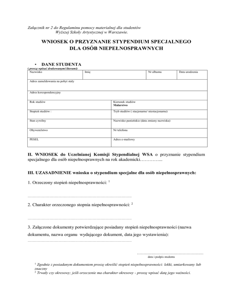 Załącznik nr 2 do Regulaminu pomocy materialnej dla studentów Wyższej Szkoły Artystycznej w Warszawie. WNIOSEK O PRZYZNANIE STYPENDIUM SPECJALNEGO DLA OSÓB NIEPEŁNOSPRAWNYCH • DANE STUDENTA ( proszę wpisać drukowanymi literami) Nazwisko Imię Nr albumu Data urodzenia Adres zameldowania na pobyt stały Adres korespondencyjny Rok studiów Kierunek studiów Malarstwo Stopień studiów : Tryb studiów ( stacjonarne/ niestacjonarne) Stan cywilny Nazwisko panieńskie (data zmiany nazwiska) Obywatelstwo Nr telefonu PESEL Adres e-mailowy II. WNIOSEK do Uczelnianej Komisji Stypendialnej WSA o przyznanie stypendium specjalnego dla osób niepełnosprawnych na rok akademicki…………... III. UZASADNIENIE wniosku o stypendium specjalne dla osób niepełnosprawnych: 1. Orzeczony stopień niepełnosprawności: 1 ………………………………………………………………………………………. 2. Charakter orzeczonego stopnia niepełnosprawności: 2 ………………………………………………………………………………………. 3. Załączone dokumenty potwierdzające posiadany stopień niepełnosprawności (nazwa dokumentu, nazwa organu wydającego dokument, data jego wystawienia): ………………………………………………………………………………………. …………………………………………… data i podpis studenta 1 Zgodnie z posiadanym dokumentem proszę określić stopień niepełnosprawności: lekki, umiarkowany lub znaczny 2 Trwały czy okresowy; jeśli orzeczenie ma charakter okresowy - proszę wpisać datę jego ważności.