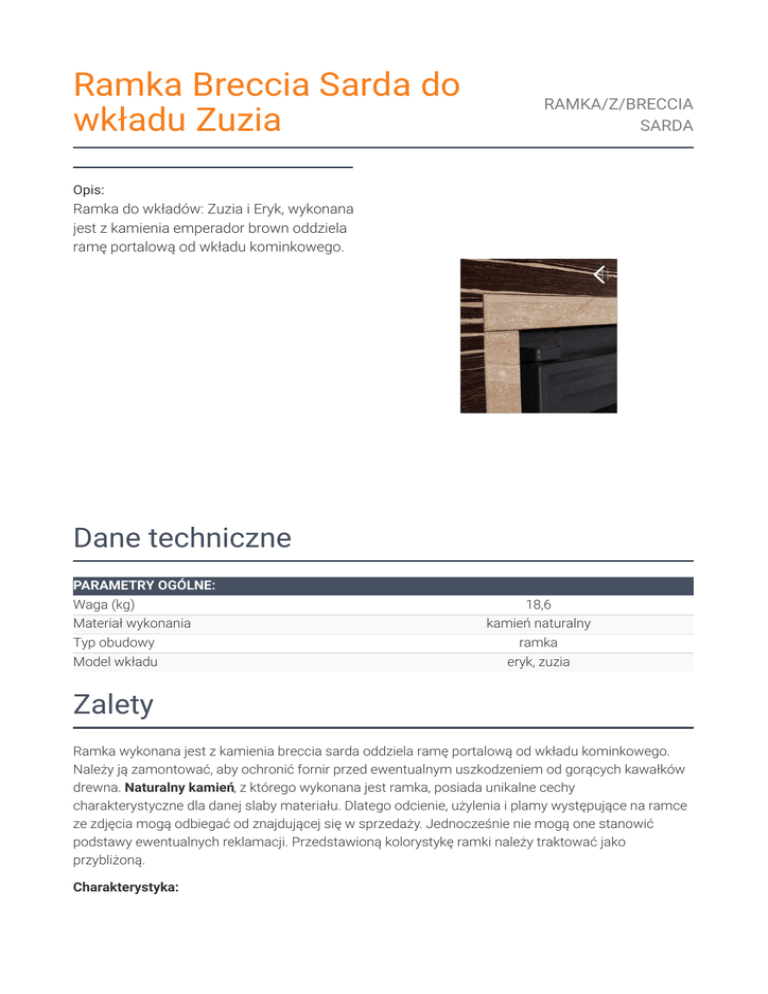 Ramka Breccia Sarda do wkładu Zuzia RAMKA/Z/BRECCIA SARDA Opis: Ramka do wkładów: Zuzia i Eryk, wykonana jest z kamienia emperador brown oddziela ramę portalową od wkładu kominkowego. Dane techniczne PARAMETRY OGÓLNE: Waga (kg) Materiał wykonania 18,6 kamień naturalny Typ obudowy ramka Model wkładu eryk, zuzia Zalety Ramka wykonana jest z kamienia breccia sarda oddziela ramę portalową od wkładu kominkowego. Należy ją zamontować, aby ochronić fornir przed ewentualnym uszkodzeniem od gorących kawałków drewna. Naturalny kamień, z którego wykonana jest ramka, posiada unikalne cechy charakterystyczne dla danej slaby materiału. Dlatego odcienie, użylenia i plamy występujące na ramce ze zdjęcia mogą odbiegać od znajdującej się w sprzedaży. Jednocześnie nie mogą one stanowić podstawy ewentualnych reklamacji. Przedstawioną kolorystykę ramki należy traktować jako przybliżoną. Charakterystyka: grubość ramki: 30mm głębokość: 80mm UWAGA!!!! Czas realizacji zamówienia do 7 dni roboczych Ramka do wkładów: Zuzia i Eryk Rysunek techniczny Zwrot Klient będący Konsumentem, który zawarł Umowę sprzedaży, może w terminie 14 dni odstąpić od niej bez podawania przyczyny. Bieg terminu na odstąpienie od Umowy sprzedaży rozpoczyna się od chwili objęcia Towaru w posiadanie przez Klienta lub wskazaną przez niego osobę trzecią inną niż przewoźnik. Oświadczenie można złożyć na formularzu, którego wzór został zamieszczony przez Sprzedawcę na Stronie Internetowej Sklepu pod adresem: formularz odstąpienia. Kratki.pl Marek Bal ul. W. Gombrowicza 4 26-660 Wsola/Jedlińsk www.kratki.com tel. 48 340 10 00 Data publikacji: 25.11.2016
