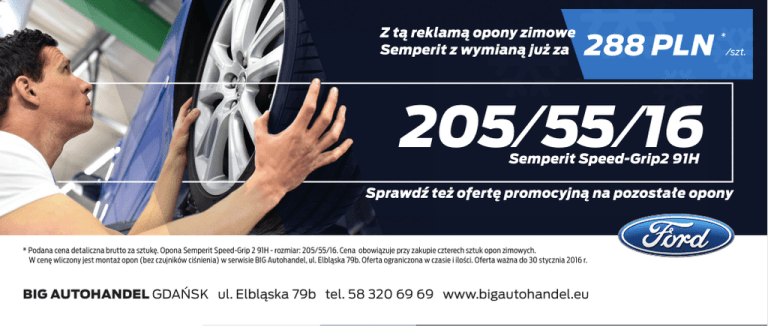 Z tą reklamą opony zimowe Semperit z wymianą już za 288 PLN * /szt. 205/55/16 Semperit Speed-Grip2 91H Sprawdź też ofertę promocyjną na pozostałe opony * Podana cena detaliczna brutto za sztukę. Opona Semperit Speed-Grip 2 91H - rozmiar: 205/55/16. Cena obowiązuje przy zakupie czterech sztuk opon zimowych. W cenę wliczony jest montaż opon (bez czujników ciśnienia) w serwisie BIG Autohandel, ul. Elbląska 79b. Oferta ograniczona w czasie i ilości. Oferta ważna do 30 stycznia 2016 r. BIG AUTOHANDEL GDAŃSK ul. Elbląska 79b tel. 58 320 69 69 www.bigautohandel.eu