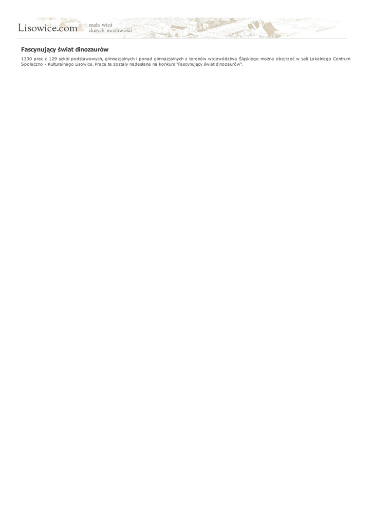 Fascynujący świat dinozaurów 1330 prac z 129 szkół podstawowych, gimnazjalnych i ponad gimnazjalnych z terenów województwa Śląskiego można obejrzeć w sali Lokalnego Centrum Społeczno - Kulturalnego Lisowice. Prace te zostały nadesłane na konkurs "Fascynujący świat dinozaurów".