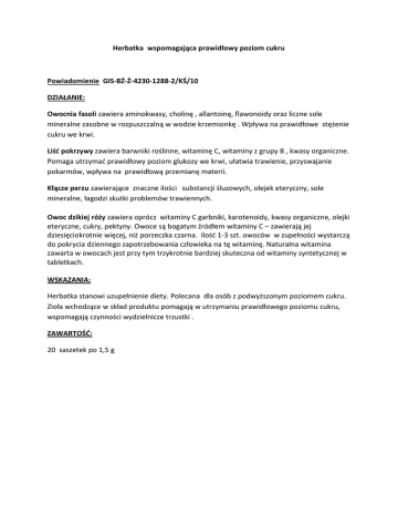 Herbatka wspomagająca prawidłowy poziom cukru Powiadomienie GIS-BŻ-Ż-4230-1288-2/KŚ/10 DZIAŁANIE: Owocnia fasoli zawiera aminokwasy, cholinę , allantoinę, flawonoidy oraz liczne sole mineralne zasobne w rozpuszczalną w wodzie krzemionkę . Wpływa na prawidłowe stężenie cukru we krwi. Liść pokrzywy zawiera barwniki roślinne, witaminę C, witaminy z grupy B , kwasy organiczne. Pomaga utrzymad prawidłowy poziom glukozy we krwi, ułatwia trawienie, przyswajanie pokarmów, wpływa na prawidłową przemianę materii. Kłącze perzu zawierające znaczne ilości substancji śluzowych, olejek eteryczny, sole mineralne, łagodzi skutki problemów trawiennych. Owoc dzikiej róży zawiera oprócz witaminy C garbniki, karotenoidy, kwasy organiczne, olejki eteryczne, cukry, pektyny. Owoce są bogatym źródłem witaminy C – zawierają jej dziesięciokrotnie więcej, niż porzeczka czarna. Ilośd 1-3 szt. owoców w zupełności wystarczą do pokrycia dziennego zapotrzebowania człowieka na tę witaminę. Naturalna witamina zawarta w owocach jest przy tym trzykrotnie bardziej skuteczna od witaminy syntetycznej w tabletkach. WSKAZANIA: Herbatka stanowi uzupełnienie diety. Polecana dla osób z podwyższonym poziomem cukru. Zioła wchodzące w skład produktu pomagają w utrzymaniu prawidłowego poziomu cukru, wspomagają czynności wydzielnicze trzustki . ZAWARTOŚĆ: 20 saszetek po 1,5 g