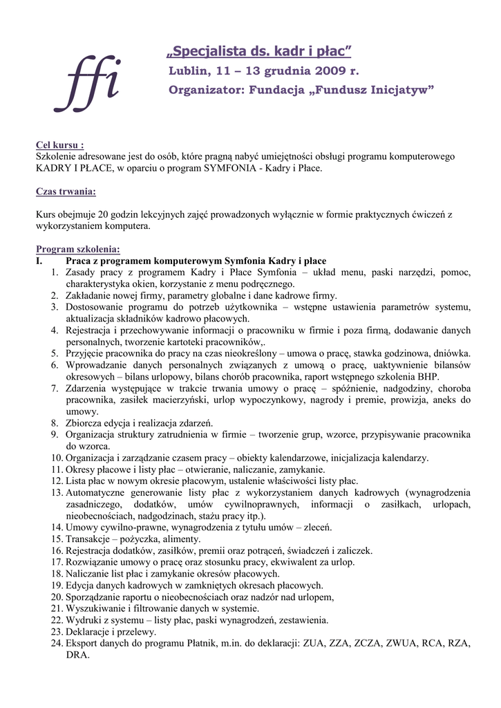 ffi „Specjalista ds. kadr i płac” Lublin, 11 – 13 grudnia 2009 r. Organizator: Fundacja „Fundusz Inicjatyw” Cel kursu : Szkolenie adresowane jest do osób, które pragną nabyć umiejętności obsługi programu komputerowego KADRY I PŁACE, w oparciu o program SYMFONIA - Kadry i Płace. Czas trwania: Kurs obejmuje 20 godzin lekcyjnych zajęć prowadzonych wyłącznie w formie praktycznych ćwiczeń z wykorzystaniem komputera. Program szkolenia: I. Praca z programem komputerowym Symfonia Kadry i płace 1. Zasady pracy z programem Kadry i Płace Symfonia – układ menu, paski narzędzi, pomoc, charakterystyka okien, korzystanie z menu podręcznego. 2. Zakładanie nowej firmy, parametry globalne i dane kadrowe firmy. 3. Dostosowanie programu do potrzeb użytkownika – wstępne ustawienia parametrów systemu, aktualizacja składników kadrowo płacowych. 4. Rejestracja i przechowywanie informacji o pracowniku w firmie i poza firmą, dodawanie danych personalnych, tworzenie kartoteki pracowników,. 5. Przyjęcie pracownika do pracy na czas nieokreślony – umowa o pracę, stawka godzinowa, dniówka. 6. Wprowadzanie danych personalnych związanych z umową o pracę, uaktywnienie bilansów okresowych – bilans urlopowy, bilans chorób pracownika, raport wstępnego szkolenia BHP. 7. Zdarzenia występujące w trakcie trwania umowy o pracę – spóźnienie, nadgodziny, choroba pracownika, zasiłek macierzyński, urlop wypoczynkowy, nagrody i premie, prowizja, aneks do umowy. 8. Zbiorcza edycja i realizacja zdarzeń. 9. Organizacja struktury zatrudnienia w firmie – tworzenie grup, wzorce, przypisywanie pracownika do wzorca. 10. Organizacja i zarządzanie czasem pracy – obiekty kalendarzowe, inicjalizacja kalendarzy. 11. Okresy płacowe i listy płac – otwieranie, naliczanie, zamykanie. 12. Lista płac w nowym okresie płacowym, ustalenie właściwości listy płac. 13. Automatyczne generowanie listy płac z wykorzystaniem danych kadrowych (wynagrodzenia zasadniczego, dodatków, umów cywilnoprawnych, informacji o zasiłkach, urlopach, nieobecnościach, nadgodzinach, stażu pracy itp.). 14. Umowy cywilno-prawne, wynagrodzenia z tytułu umów – zleceń. 15. Transakcje – pożyczka, alimenty. 16. Rejestracja dodatków, zasiłków, premii oraz potrąceń, świadczeń i zaliczek. 17. Rozwiązanie umowy o pracę oraz stosunku pracy, ekwiwalent za urlop. 18. Naliczanie list płac i zamykanie okresów płacowych. 19. Edycja danych kadrowych w zamkniętych okresach płacowych. 20. Sporządzanie raportu o nieobecnościach oraz nadzór nad urlopem, 21. Wyszukiwanie i filtrowanie danych w systemie. 22. Wydruki z systemu – listy płac, paski wynagrodzeń, zestawienia. 23. Deklaracje i przelewy. 24. Eksport danych do programu Płatnik, m.in. do deklaracji: ZUA, ZZA, ZCZA, ZWUA, RCA, RZA, DRA. 25. Organizacja zabezpieczenia danych – ochrona antywirusowa, kopie bezpieczeństwa, archiwizacja i odtwarzanie danych. 26. Użytkownicy systemu - uprawnienia i prawa dostępu, hasła. Cena szkolenia: 350 zł Cena zawiera: zajęcia w pracowni komputerowej, konsultacje, materiały szkoleniowe, przerwy kawowe, obiad, zaświadczenie o ukończeniu szkolenia Uwaga! Organizator zastrzega sobie prawo wprowadzenia niewielkich zmian w programie. Serdecznie zapraszamy Fundacja „Fundusz Inicjatyw” ffi Adres korespondencyjny: ul. Narutowicza 57/6, 20-016 Lublin Tel./fax: 081 532 10 30; [email protected]; www.ffi.org.pl FORMULARZ ZGŁOSZENIOWY Zgłoszenie prosimy wysłać faxem: 081 532 10 30 lub e-mailem: [email protected] Nazwa firmy/instytucji : Adres: NIP: Lp. Imię i nazwisko Nr 1. 2. 3. Należność z tytułu uczestnictwa: s z k o l e n i a Telefon Fax. E-mail Stanowisko służbowe Cena szkolenia ………………… zł Przekażemy przelewem na konto: ING Bank Śląski S.A. nr: 30 1050 1461 1000 0090 6240 9462 Prosimy o wpisanie nazwy szkolenia na przelewie bankowym. Upoważniamy Fundację „Fundusz Inicjatyw” do wystawienia faktury VAT bez naszego podpisu. Warunki uczestnictwa w szkoleniu: 1. Podstawą udziału w szkoleniu jest przekazanie faksem, pocztą lub e-mailem wypełnionego formularza zgłoszeniowego w terminie 7 dni przed rozpoczęciem szkolenia oraz dokonanie zapłaty po otrzymaniu potwierdzenia uczestnictwa w szkoleniu. 2. Każdy z uczestników otrzyma potwierdzenie o uczestnictwie w szkoleniu najpóźniej na 5 dni przed datą jego rozpoczęcia. Prosimy o zabranie ze sobą dowodu wpłaty za szkolenie. 3. Organizator zastrzega sobie prawo do zmiany terminu szkolenia lub wyznaczenia równoważnego zastępstwa w przypadku gdy wykładowca nie będzie mógł prowadzić zajęć z przyczyn losowych. 4. Rezygnacje przyjmowane będą wyłącznie w formie pisemnej najpóźniej na 7 dni przed rozpoczęciem szkolenia. W przypadku nie zgłoszenia rezygnacji, Zgłaszający poniesie pełne koszty szkolenia. W przypadku otrzymania rezygnacji w terminie krótszym niż 7 dni przed szkoleniem, Zgłaszający poniesie 50 % kosztów szkolenia. 5. W przypadku gdyby szkolenie nie odbyło się z przyczyn niezależnych od organizatora uczestnicy otrzymają pisemne odwołanie ora z zwrot zapłaty w terminie 7 dni od daty odwołania szkolenia. 6. Wysyłając formularz zgłoszeniowy akceptuje powyższe warunki. * Wyrażam zgodę na wykorzystanie i przetwarzanie powyższych danych (z zapewnieniem prawa wglądu i aktualizacji) zgodnie z ustawą z dnia 29 sierpnia 1997 r. o ochronie danych osobowych (Dz. U. 101 poz. 926, z późn. zm.) oraz w rozumieniu ustawy z dnia 26 sierpnia 2002 r. o świadczeniu usług drogą elektroniczną (Dz. U. 144, poz. 1294) do celów informacyjnych i marketingowych przez Fundację „Fundusz Inicjatyw” z siedzibą w Lublinie. Data……………………. Podpis i pieczęć osoby uprawnionej………………………………………………. Fundacja „Fundusz Inicjatyw” NIP 9462553005, REGON 060368615, XI Wydział Gospodarczy Krajowego Rejestru Sądowego, nr KRS 0000306907 