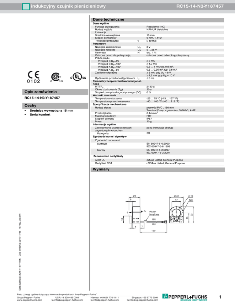 indukcyjny czujnik pierścieniowy RC15-14-N3-Y187457 Dane techniczne Dane ogólne Funkcja przełączania Rodzaj wyjścia Instalacja Średnica wewnętrzna Stożek pomiarowy Prędkość przejazdu Parametry Napięcie znamionowe Napięcie robocze histereza Ochrona przed złą polaryzacją Pobór prądu Przejazd B UB=8V Przejazd B UB=10V Przejazd A UB=10V Przejazd A UB=8V Zasilanie włączone 0102 Opis zamówienia RC15-14-N3-Y187457 Cechy • • Średnica wewnętrzna 15 mm Seria komfort Rozwierne (NC) NAMUR bistabilny 15 mm 6 mm, 1.4401 ≤ 10 m/s v Uo UB H 8V 5 ... 25 V typ. 1 % ochrona przed odwrotną polaryzacją ≥ 3 mA ≥ 4,2 mA 0,5 ... 1 mA typ. 0,9 mA 0,5 ... 0,95 mA typ. 0,8 mA ≥ 3 mA gdy UB = 8 V ≥ 4,2 mA gdy UB = 10 V ≤ 5 ms Opóźnienie przed udostępnieniem tv Parametry bezpieczeństwa funkcjonalnego MTTFd Okres użytkowania (TM) Stopień pokrycia diagnostycznego (DC) Warunki otoczenia Temperatura otoczenia Temperatura przechowywania Specyfikacja mechaniczna Rodzaj złącza 2130 a 20 a 0% -25 ... 75 °C (-13 ... 167 °F) -40 ... 100 °C (-40 ... 212 °F) przewód PVC , 150 mm Terminal Crimp z gniazdem 60888-3, AMP 0,14 mm2 PBT IP67 20 g Przekrój kabla Materiał obudowy Stopień ochrony Masa Informacje ogólne Zastosowanie w przestrzeniach zagrożonych wybuchem Kategoria Zgodność norm i dyrektyw patrz instrukcja obsługi 2G Zgodność z normami NAMUR EN 60947-5-6:2000 IEC 60947-5-6:1999 EN 60947-5-2:2007 IEC 60947-5-2:2007 Normy Zezwolenia i certyfikaty Atest UL Certyfikat CSA cULus Listed, General Purpose cCSAus Listed, General Purpose Wymiary 20 6 13 Rdzeń ferrytowy BN 32 187457_pol.xml M3 BU 1 7 150 Data publikacji: 2016-11-07 10:05 Data wydania: 2016-11-08 ø 15 17 20 A B 25.3 Patrz „Uwagi ogólne dotyczące informacji o produktach firmy Pepperl+Fuchs”. USA: +1 330 486 0001 Grupa Pepperl+Fuchs Niemcy: +49 621 776-1111 www.pepperl-fuchs.com [email protected] [email protected] Singapur: +65 6779 9091 [email protected] 1 indukcyjny czujnik pierścieniowy RC15-14-N3-Y187457 Przyłącze BN L- Data publikacji: 2016-11-07 10:05 Data wydania: 2016-11-08 187457_pol.xml BU L+ 2 Patrz „Uwagi ogólne dotyczące informacji o produktach firmy Pepperl+Fuchs”. USA: +1 330 486 0001 Grupa Pepperl+Fuchs Niemcy: +49 621 776-1111 www.pepperl-fuchs.com [email protected] [email protected] Singapur: +65 6779 9091 [email protected] indukcyjny czujnik pierścieniowy RC15-14-N3-Y187457 Ochrona sprzętu — poziom Gb Instrukcja Urządzenia elektryczne dla przestrzeni zagrożonych wybuchem Urządzenie kategorii 2G do użytku w przestrzeniach zagrożonych wybuchem gazu, oparów i mgły. Certyfikat badania typu EC PTB 99 ATEX 2128 X Oznakowanie CE 0102 Oznaczenie ATEX ¬ II 2G Ex ia IIC T6…T1 Gb Normy EN 60079-0:2012, EN 60079-11:2012 Zabezpieczenie przed zapłonem - wykonanie iskrobezpieczne ograniczenie przez następujące warunki Odpowiedni typ RC15-...-N3... Skuteczna indukcyjność wewnętrzna Ci ≤ 90 nF ; Uwzględniona długość kabla 10 m. Informacje ogólne Urządzenie należy używać zgodnie z danymi katalogowymi oraz danymi zawartymi w tej instrukcji obsługi. Należy przestrzegać wymagań certyfikatu badania typu UE. Należy przestrzegać warunków szczególnych! Maksymalna dopuszczalna temperatura otoczenia Tamb Zakres temperatury, w zależności od klasy temperaturowej, podany jest w certyfikacie badania prototypu WE. Montaż, uruchomienie Należy przestrzegać przepisów prawnych i/lub rozporządzeń i norm regulujących użycie lub też użycia zgodnego z przeznaczeniem. Iskrobezpieczność urządzeń jest gwarantowana jedynie w przypadku podłączenia z urządzeniem przynależnym, które posiada zaświadczenie o wykonaniu iskrobezpiecznym. Zamontować urządzenie w taki sposób, aby powierzchnia pokryta żywicą nie była narażona na działanie czynników mechanicznych. Obsługa Nie wolno dokonywać żadnych zmian przy urządzeniach przeznaczonych do pracy w przestrzeniach zagrożonych wybuchem. Wykonywanie napraw tych urządzeń nie jest możliwe. ≤ 70 µH ; Uwzględniona długość kabla 10 m. Data publikacji: 2016-11-07 10:05 Data wydania: 2016-11-08 187457_pol.xml Skuteczna induktancja wewnętrzna Li Patrz „Uwagi ogólne dotyczące informacji o produktach firmy Pepperl+Fuchs”. USA: +1 330 486 0001 Grupa Pepperl+Fuchs Niemcy: +49 621 776-1111 www.pepperl-fuchs.com [email protected] [email protected] Singapur: +65 6779 9091 [email protected] 3