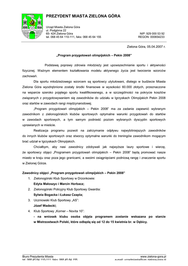 PREZYDENT MIASTA ZIELONA GÓRA Urząd Miasta Zielona Góra ul. Podgórna 22 65- 424 Zielona Góra tel. 068 45 64 110-111, faks: 068 45 64 155 NIP: 929 000 53 92 REGON: 000654233 Zielona Góra, 05.04.2007 r. „Program przygotowań olimpijskich – Pekin 2008” Podstawą poprawy zdrowia młodzieży jest upowszechnianie sportu i aktywności fizycznej. Ważnym elementem kształtowania modelu aktywnego życia jest tworzenie wzorców zachowań. Dla sportu młodzieżowego wzorcem są sportowcy utytułowani, dlatego w budżecie Miasta Zielona Góra wyodrębnione zostały środki finansowe w wysokości 60.000 złotych, przeznaczone na wsparcie szeroko pojętego sportu kwalifikowanego, a w szczególności na pokrycie kosztów związanych z przygotowywaniem się zawodników do udziału w Igrzyskach Olimpijskich Pekin 2008 oraz startów w zawodach rangi międzynarodowej. „Program przygotowań olimpijskich – Pekin 2008” ma za zadanie zapewnić wybranym zawodnikom z zielonogórskich klubów sportowych optymalne warunki przygotowań do startów w zawodach sportowych, a tym samym podnieść poziom wybranych dyscyplin sportowych uprawianych w mieście. Realizacja programu pozwoli na zatrzymanie odpływu najwybitniejszych zawodników do innych klubów sportowych oraz stworzy optymalne warunki do treningów zawodnikom mogącym brać udział w Igrzyskach Olimpijskich. Chciałbym, aby nasi zawodnicy zdobywali jak najwyższe laury sportowe i wierzę, że sportowcy objęci „Programem przygotowań olimpijskich – Pekin 2008” będą promować nasze miasto w kraju oraz poza jego granicami, a swoimi osiągnięciami podniosą rangę i znaczenie sportu w Zielonej Górze. Zawodnicy objęci „Program przygotowań olimpijskich – Pekin 2008” 1. Zielonogórski Klub Sportowy w Drzonkowie: Edyta Małoszyc i Marcin Horbacz; 2. Zielonogórski Policyjny Klub Sportowy Gwardia: Sylwia Bogacka i Łukasz Czapla; 3. Uczniowski Klub Sportowy „AS”: Józef Wadecki; 4. Klub Sportowy „Korner – Novita 10”: - na wniosek klubu osoba objęta programem zostanie wskazana po starcie w Mistrzostwach Polski, które odbędą się od 12 do 15 kwietnia br. w Dębicy. Biuro Prezydenta Miasta tel. 068 45 64 110-111, faks: 068 45 64 155 www.zielona-gora.pl e-mail: [email protected]