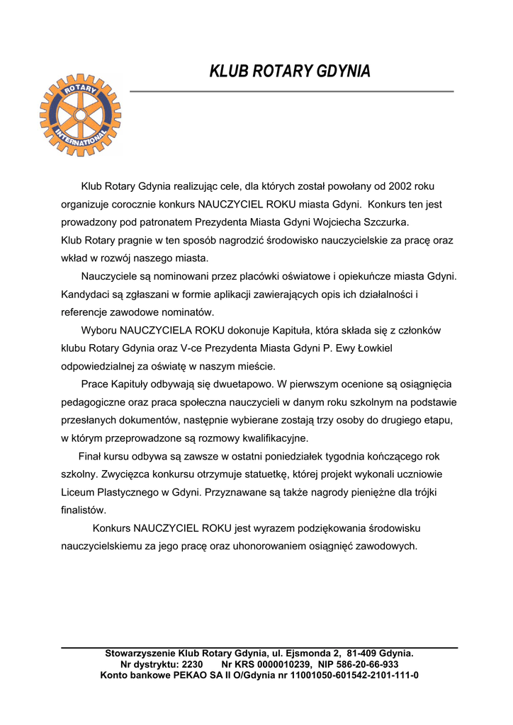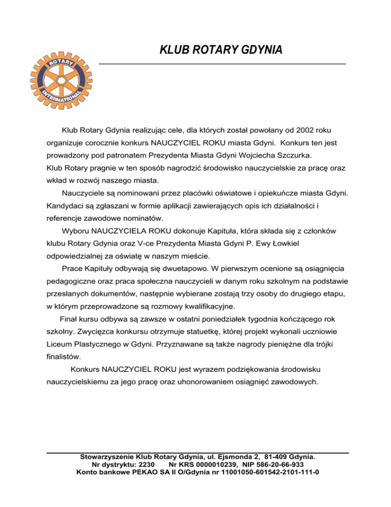 KLUB ROTARY GDYNIA Klub Rotary Gdynia realizując cele, dla których został powołany od 2002 roku organizuje corocznie konkurs NAUCZYCIEL ROKU miasta Gdyni. Konkurs ten jest prowadzony pod patronatem Prezydenta Miasta Gdyni Wojciecha Szczurka. Klub Rotary pragnie w ten sposób nagrodzić środowisko nauczycielskie za pracę oraz wkład w rozwój naszego miasta. Nauczyciele są nominowani przez placówki oświatowe i opiekuńcze miasta Gdyni. Kandydaci są zgłaszani w formie aplikacji zawierających opis ich działalności i referencje zawodowe nominatów. Wyboru NAUCZYCIELA ROKU dokonuje Kapituła, która składa się z członków klubu Rotary Gdynia oraz V-ce Prezydenta Miasta Gdyni P. Ewy Łowkiel odpowiedzialnej za oświatę w naszym mieście. Prace Kapituły odbywają się dwuetapowo. W pierwszym ocenione są osiągnięcia pedagogiczne oraz praca społeczna nauczycieli w danym roku szkolnym na podstawie przesłanych dokumentów, następnie wybierane zostają trzy osoby do drugiego etapu, w którym przeprowadzone są rozmowy kwalifikacyjne. Finał kursu odbywa są zawsze w ostatni poniedziałek tygodnia kończącego rok szkolny. Zwycięzca konkursu otrzymuje statuetkę, której projekt wykonali uczniowie Liceum Plastycznego w Gdyni. Przyznawane są także nagrody pieniężne dla trójki finalistów. Konkurs NAUCZYCIEL ROKU jest wyrazem podziękowania środowisku nauczycielskiemu za jego pracę oraz uhonorowaniem osiągnięć zawodowych. Stowarzyszenie Klub Rotary Gdynia, ul. Ejsmonda 2, 81-409 Gdynia. Nr dystryktu: 2230 Nr KRS 0000010239, NIP 586-20-66-933 Konto bankowe PEKAO SA II O/Gdynia nr 11001050-601542-2101-111-0