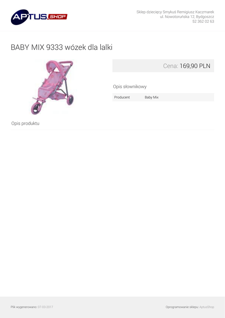 Sklep dziecięcy Smykuś Remigiusz Kaczmarek ul. Nowotoruńska 12, Bydgoszcz 52 362 02 63 BABY MIX 9333 wózek dla lalki Cena: 169,90 PLN Opis słownikowy Producent Baby Mix Opis produktu Plik wygenerowano: 07-03-2017 Powered by TCPDF (www.tcpdf.org) Oprogramowanie sklepu: AptusShop