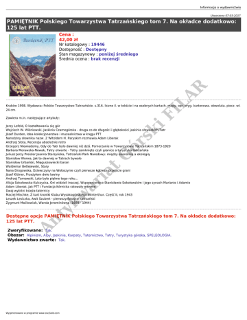 Informacje o wydawnictwie Utworzono 07-03-2017 PAMIĘTNIK Polskiego Towarzystwa Tatrzańskiego tom 7. Na okładce dodatkowo: 125 lat PTT. Cena : 42,00 zł LA R Nr katalogowy : 19446 Dostępność : Dostępny Stan magazynowy : poniżej średniego Średnia ocena : brak recenzji FI Kraków 1998. Wydawca: Polskie Towarzystwo Tatrzańskie. s.316. liczne il. w tekście i na osobnych kartach. mapy. opr. oryg. kartonowa. obwoluta. piecz. wł. 24 cm. Zawiera m.in. następujące artykuły: ty k w ar ia t G ór sk i Jerzy Lefeld, O kształtowaniu się gór Wojciech W. Wiśniewski, Jaskinia Czarnogórska - druga co do długości i głębokości jaskinia słowackich Tatr Józef Durden, Idea kolekcjonerstwa i muzealnictwa w kręgu PTT Narodziny słownika nazw. Z Witoldem H. Paryskim rozmawia Adam Liberak Andrzej Slota, Recenzja absolutnie retro Grzegorz Niewiadomy, Gdy do Tatr było dawniej niż dziś. Pomorzanie w Towarzystwie Tatrzańskim 1873-1920 Barbara Morawska-Nowak, Tatry otwarte - Tatry zamknięte czyli granice a turystyka tatrzańska Juliusz Jerzy Preisler Joanna Sterzyńska, Tatrzański Park Narodowy: między ekonomią a ekologią Stanisław Worwa, Jak to dawniej w Tatrach bywało Stanisław Urbański, Mięguszowiecki baran Waldemar Betlejewski, Stary Nana Drogowska, Dziewczyny na Wołoszynie czyli pierwsze kobiece przejście grani Józef Kittner, Przeżyłem dwie lawiny Andrzej Tarnawski, Lato było piękne tego roku... Alicja Sokołowska-Kulczycka, Oni widzieli inaczej. Wspomnienie o Stanisławie Sokołowskim i jego synach Marianie i Adamie Adam Liberak, Jak PTT i Fundacja Kórnicka ratowały morenę Dwaj wybitni księża-taternicy Maciej Mischke, Z kart kroniki Klubu Wysokogórskiego Winterthur. Część II, rok 1943 Leszek Lesiczka, Awit Szubert - pierwszy fotograf tatrzański Zygmunt Maćkowiak, Wanda Jerominówna (1888 - 1944) An Dostępne opcje PAMIĘTNIK Polskiego Towarzystwa Tatrzańskiego tom 7. Na okładce dodatkowo: 125 lat PTT. Zweryfikowane: Tak. Obszar: Alpinizm, Alpy, Jaskinie, Karpaty, Taternictwo, Tatry, Turystyka górska, SPELEOLOGIA. Wydawnictwo zwarte: Tak. Wygenerowano w programie www.oscGold.com