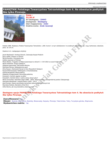 Informacje o wydawnictwie Utworzono 07-03-2017 PAMIĘTNIK Polskiego Towarzystwa Tatrzańskiego tom 4. Na obwolucie podtytuł: Nie tylko Pireneje. Cena : 52,50 zł LA R Nr katalogowy : 19443 Dostępność : Dostępny Stan magazynowy : niski Średnia ocena : brak recenzji FI Kraków 1995. Wydawca: Polskie Towarzystwo Tatrzańskie. s.300. liczne il. w tym wielobarwne i na osobnych wkładkach. opr. oryg. kartonowa. obwoluta. piecz. wł. 24 cm. Zawiera m.in. następujące artykuły: ty k w ar ia t G ór sk i Jacek Wasilewski i Andrzej Górecki, Zwierzęta Karpat Polskich Jerzy Lefeld, Liliowce w Tatrach Michał Ronikier, Pirenejskie lato Łódzka wyprawa w Pireneje Plezia Marian, Tragedia na Małym Jaworowym w dniach 5 - 6 VII 1910 w oczach historyka Marek Stefański, Droga wyklętych Zbigniew Jaworowski, Wschodnia Mnicha Stanisław Worwa, Niebezpieczna grań Alina Kaszyn, Kieżmarski Szczyt w dniu Wszystkich Świętych Ryszard Remiszewski, Refleksyjnie z Chochołowskiej Andrzej Burghardt, Bieszczadnicy Zbigniew Grzegorzewski, Rumuńską połoniną Krzysztof J. Szmidt, Jagody na półce Krzysztof J. Szmidt, Komu i czemu winny służyć góry? Maria Gumuńska, Stanisław Zdyb (1884 - 1954). Wspomnienie o nielegendarnej postaci Zakopanego Stanisław Wasilewski, Leopold Świerz (1835 - 1911) Józef Durden, Dawna pocztówka tatrzańska dokumentem minionych lat Stanisław Kobiela, Narodziny Orlej Perci Zofia Stecka, Jak się przewodnicy dawniej nosili An Dostępne opcje PAMIĘTNIK Polskiego Towarzystwa Tatrzańskiego tom 4. Na obwolucie podtytuł: Nie tylko Pireneje. Zweryfikowane: Tak. Obszar: Beskidy Wschodnie, Beskidy, Bieszczady, Karpaty, Pireneje, Taternictwo, Tatry, Turystyka górska, Wspinanie. Wydawnictwo zwarte: Tak. Wygenerowano w programie www.oscGold.com