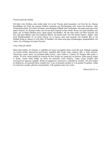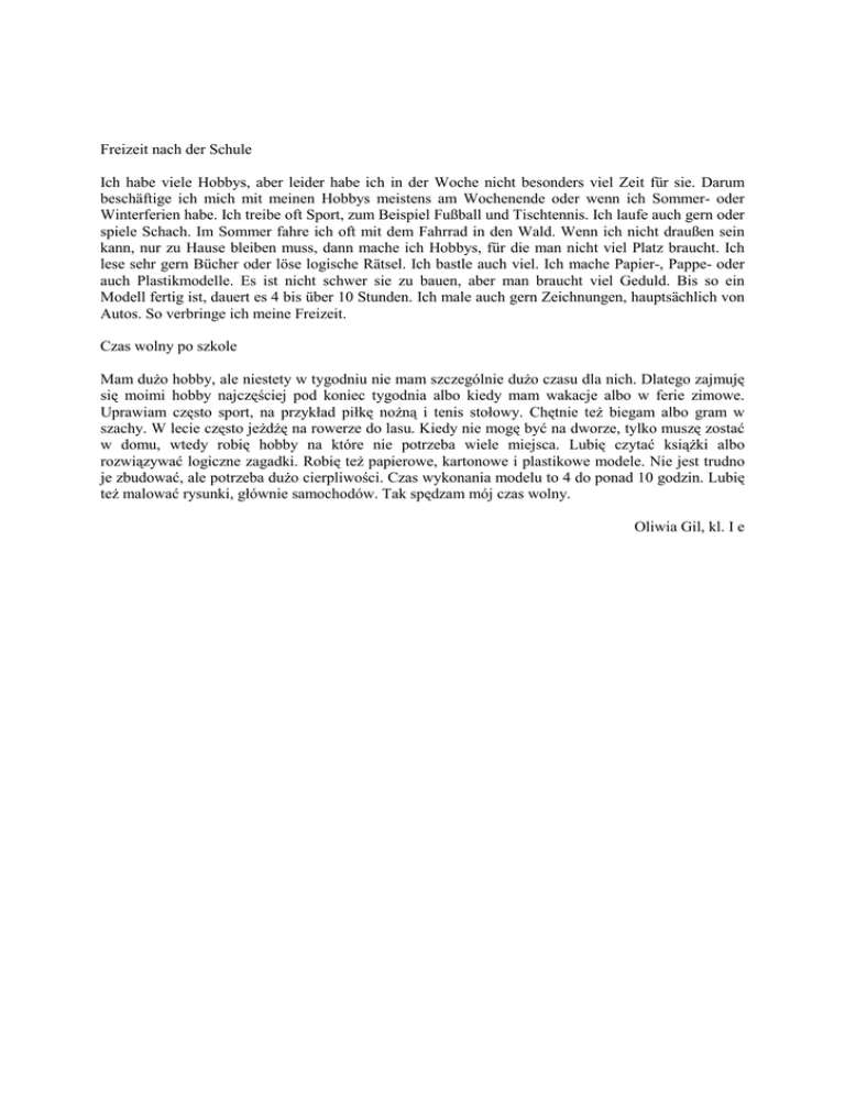 Freizeit nach der Schule Ich habe viele Hobbys, aber leider habe ich in der Woche nicht besonders viel Zeit für sie. Darum beschäftige ich mich mit meinen Hobbys meistens am Wochenende oder wenn ich Sommer- oder Winterferien habe. Ich treibe oft Sport, zum Beispiel Fußball und Tischtennis. Ich laufe auch gern oder spiele Schach. Im Sommer fahre ich oft mit dem Fahrrad in den Wald. Wenn ich nicht draußen sein kann, nur zu Hause bleiben muss, dann mache ich Hobbys, für die man nicht viel Platz braucht. Ich lese sehr gern Bücher oder löse logische Rätsel. Ich bastle auch viel. Ich mache Papier-, Pappe- oder auch Plastikmodelle. Es ist nicht schwer sie zu bauen, aber man braucht viel Geduld. Bis so ein Modell fertig ist, dauert es 4 bis über 10 Stunden. Ich male auch gern Zeichnungen, hauptsächlich von Autos. So verbringe ich meine Freizeit. Czas wolny po szkole Mam dużo hobby, ale niestety w tygodniu nie mam szczególnie dużo czasu dla nich. Dlatego zajmuję się moimi hobby najczęściej pod koniec tygodnia albo kiedy mam wakacje albo w ferie zimowe. Uprawiam często sport, na przykład piłkę nożną i tenis stołowy. Chętnie też biegam albo gram w szachy. W lecie często jeżdżę na rowerze do lasu. Kiedy nie mogę być na dworze, tylko muszę zostać w domu, wtedy robię hobby na które nie potrzeba wiele miejsca. Lubię czytać książki albo rozwiązywać logiczne zagadki. Robię też papierowe, kartonowe i plastikowe modele. Nie jest trudno je zbudować, ale potrzeba dużo cierpliwości. Czas wykonania modelu to 4 do ponad 10 godzin. Lubię też malować rysunki, głównie samochodów. Tak spędzam mój czas wolny. Oliwia Gil, kl. I e