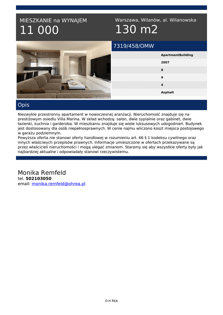 MIESZKANIE na WYNAJEM 11 000 Warszawa, Wilanów, al. Wilanowska 130 m2 7319/458/OMW ApartmentBuilding 2007 8 9 4 Asphalt Opis Niezwykle przestronny apartament w nowoczesnej aranżacji. Nieruchomość znajduje się na prestiżowym osiedlu Villa Marina. W skład wchodzą: salon, dwie sypialnie oraz gabinet, dwie łazienki, kuchnia i garderoba. W mieszkaniu znajduje się wiele luksusowych udogodnień. Budynek jest dostosowany dla osób niepełnosprawnych. W cenie najmu wliczono koszt miejsca postojowego w garażu podziemnym. Powyższa oferta nie stanowi oferty handlowej w rozumieniu art. 66 § 1 kodeksu cywilnego oraz innych właściwych przepisów prawnych. Informacje umieszczone w ofertach przekazywane są przez właścicieli nieruchomości i mogą ulegać zmianom. Staramy się aby wszystkie oferty były jak najbardziej aktualne i odpowiadały stanowi rzeczywistemu. Monika Remfeld tel. 502103050 email: [email protected] O-H REA Powered by TCPDF (www.tcpdf.org)
