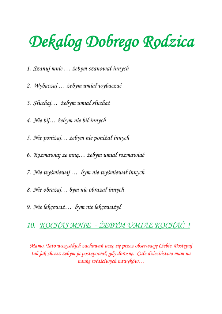 Dekalog Dobrego Rodzica 1. Szanuj mnie … żebym szanował innych 2. Wybaczaj … żebym umiał wybaczać 3. Słuchaj… żebym umiał słuchać 4. Nie bij… żebym nie bił innych 5. Nie poniżaj… żebym nie poniżał innych 6. Rozmawiaj ze mną… żebym umiał rozmawiać 7. Nie wyśmiewaj … bym nie wyśmiewał innych 8. Nie obrażaj… bym nie obrażał innych 9. Nie lekceważ… bym nie lekceważył 10. KOCHAJ MNIE - ŻEBYM UMIAŁ KOCHAĆ ! Mamo, Tato wszystkich zachowań uczę się przez obserwację Ciebie. Postępuj tak jak chcesz żebym ja postępował, gdy dorosnę. Całe dzieciństwo mam na naukę właściwych nawyków…