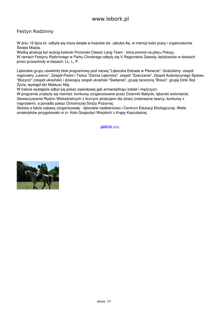 www.lebork.pl Festyn Rodzinny W dniu 15 lipca br. odbyła się msza święta w kościele św. Jakuba Ap. w intencji ludzi pracy i organizatorów Święta Miasta. Wielką atrakcją był wyścig kolarski Pomorski Classic Lang Team - lotna premia na placu Pokoju. W ramach Festynu Rodzinnego w Parku Chrobrego odbyły się V Regionalne Zawody Jeździeckie w skokach przez przeszkody w klasach: LL, L, P. Lęborskie grupy uświetniły blok programowy pod nazwą "Lęborska Estrada w Plenerze". Gościliśmy: zespół regionalny „Lewino”, Zespół Pieśni i Tańca "Ziemia Lęborska", zespół "Żywczanie", Zespół Autentycznego Śpiewu "Bożyczi" (zespół ukraiński) i dziecięcy zespół ukraiński "Switanok", grupę taneczną "Bravo", grupę Dziki Styl Życia, wystąpił też Mateusz Maj. W trakcie występów odbył się pokaz zawodowej gali armwrestlingu kobiet i mężczyzn. W programie znalazły się również: konkursy zorganizowane przez Dziennik Bałtycki, lęborski wolontariat, Stowarzyszenie Rodzin Wielodzietnych z licznymi atrakcjami dla dzieci (malowanie twarzy, konkursy z nagrodami), a ponadto pokaz Ochotniczej Straży Pożarnej; Stoiska a także zabawy zorganizowały - lęborskie nadleśnictwo i Centrum Edukacji Ekologicznej. Wiele smakołyków przygotowało m.in. Koło Gospodyń Wiejskich z Krępy Kaszubskiej. galeria >>> strona 1/1 Powered by TCPDF (www.tcpdf.org)
