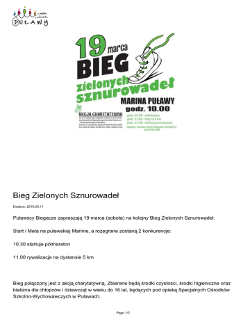 Bieg Zielonych Sznurowadeł Dodano: 2016.03.11 Puławscy Biegacze zapraszają 19 marca (sobota) na kolejny Bieg Zielonych Sznurowadeł. Start i Meta na puławskiej Marinie, a rozegrane zostaną 2 konkurencje: 10.30 startuje półmaraton 11.00 rywalizacja na dystansie 5 km Bieg połączony jest z akcją charytatywną. Zbierane będą środki czystości, środki higieniczne oraz bielizna dla chłopców i dziewcząt w wieku do 16 lat, będących pod opieką Specjalnych Ośrodków Szkolno-Wychowawczych w Puławach. Page 1/2 Bliższe informacje na stronie: bieganie.bezmiar.org oraz na FP wydarzenia: https://www.facebook.com/events/1731846110384509/ (film z wydarzenia w 2015 roku, źródło: kanał youtube moovio) Źródło: Page 2/2