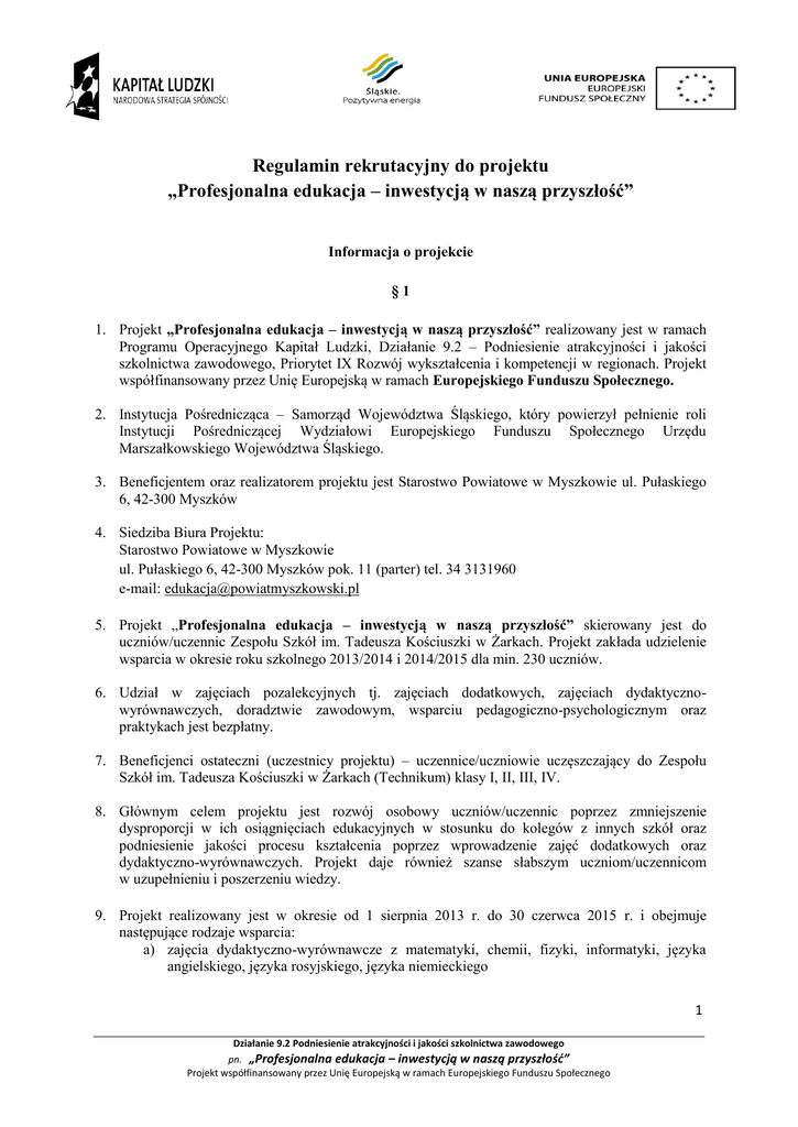 Regulamin rekrutacyjny do projektu „Profesjonalna edukacja – inwestycją w naszą przyszłość” Informacja o projekcie §1 1. Projekt „Profesjonalna edukacja – inwestycją w naszą przyszłość” realizowany jest w ramach Programu Operacyjnego Kapitał Ludzki, Działanie 9.2 – Podniesienie atrakcyjności i jakości szkolnictwa zawodowego, Priorytet IX Rozwój wykształcenia i kompetencji w regionach. Projekt współfinansowany przez Unię Europejską w ramach Europejskiego Funduszu Społecznego. 2. Instytucja Pośrednicząca – Samorząd Województwa Śląskiego, który powierzył pełnienie roli Instytucji Pośredniczącej Wydziałowi Europejskiego Funduszu Społecznego Urzędu Marszałkowskiego Województwa Śląskiego. 3. Beneficjentem oraz realizatorem projektu jest Starostwo Powiatowe w Myszkowie ul. Pułaskiego 6, 42-300 Myszków 4. Siedziba Biura Projektu: Starostwo Powiatowe w Myszkowie ul. Pułaskiego 6, 42-300 Myszków pok. 11 (parter) tel. 34 3131960 e-mail: [email protected] 5. Projekt „Profesjonalna edukacja – inwestycją w naszą przyszłość” skierowany jest do uczniów/uczennic Zespołu Szkół im. Tadeusza Kościuszki w Żarkach. Projekt zakłada udzielenie wsparcia w okresie roku szkolnego 2013/2014 i 2014/2015 dla min. 230 uczniów. 6. Udział w zajęciach pozalekcyjnych tj. zajęciach dodatkowych, zajęciach dydaktycznowyrównawczych, doradztwie zawodowym, wsparciu pedagogiczno-psychologicznym oraz praktykach jest bezpłatny. 7. Beneficjenci ostateczni (uczestnicy projektu) – uczennice/uczniowie uczęszczający do Zespołu Szkół im. Tadeusza Kościuszki w Żarkach (Technikum) klasy I, II, III, IV. 8. Głównym celem projektu jest rozwój osobowy uczniów/uczennic poprzez zmniejszenie dysproporcji w ich osiągnięciach edukacyjnych w stosunku do kolegów z innych szkół oraz podniesienie jakości procesu kształcenia poprzez wprowadzenie zajęć dodatkowych oraz dydaktyczno-wyrównawczych. Projekt daje również szanse słabszym uczniom/uczennicom w uzupełnieniu i poszerzeniu wiedzy. 9. Projekt realizowany jest w okresie od 1 sierpnia 2013 r. do 30 czerwca 2015 r. i obejmuje następujące rodzaje wsparcia: a) zajęcia dydaktyczno-wyrównawcze z matematyki, chemii, fizyki, informatyki, języka angielskiego, języka rosyjskiego, języka niemieckiego 1 Działanie 9.2 Podniesienie atrakcyjności i jakości szkolnictwa zawodowego pn. „Profesjonalna edukacja – inwestycją w naszą przyszłość” Projekt współfinansowany przez Unię Europejską w ramach Europejskiego Funduszu Społecznego b) zajęcia dodatkowe z przedsiębiorczości, informatyki, hotelarstwa, gastronomii, kelnerskobarmańskie, biologiczno-chemiczne, geograficzno-turystyczne, matematycznoinformatyczne c) kursy – Kuchnia polska cztery pory roku, Carvingu, Przygotowywania kawy, Barmański d) doradztwo zawodowe i wsparcie pedagogiczno-psychologiczne e) staże zawodowe dla uczennic/uczniów Technikum Zespołu Szkół im. Tadeusza Kościuszki w Żarkach §2 1. W roku szkolnym 2013/2014 w Zespole Szkół im. Tadeusza Kościuszki uczniowie byli rekrutowani na następujące zajęcia (z uwzględnieniem liczebności grup oraz wymiaru godzinowego): I. „Chcemy być lepsi” – zajęcia wyrównawcze dla dzieci z trudnościami w przedmiotach ścisłych – zajęcia dydaktyczno-wyrównawcze z matematyki (4 gr. x 12 os. x 30 h x 2 sem.), – zajęcia dydaktyczno-wyrównawcze z chemii (1 gr. x 12 os. x 30 h x 2 sem.), – zajęcia dydaktyczno-wyrównawcze z fizyki (1 gr. x 12 os. x 30 h x 2 sem.), – zajęcia dydaktyczno-wyrównawcze z informatyki (2 gr. x 12 os. x 30 h x 2 sem.). II. „Język moja szansą na europejskim rynku pracy” – zajęcia z języka obcego – zajęcia dydaktyczno-wyrównawcze z języka angielskiego (12 os. x 4 gr. x 30 h x 2 sem.), – zajęcia dydaktyczno-wyrównawcze z języka rosyjskiego (12 os. x 2 gr. x 30 h x 2 sem.), – zajęcia dydaktyczno-wyrównawcze z języka niemieckiego (12 os. x 2 gr. x 30 h x 2 sem.). III. „Mierzymy wysoko” – warsztaty przyrodniczo-matematyczne dla uczniów zdolnych – zajęcia dodatkowe biologiczno-chemiczne „ABC toksykologii życia codziennego: Bio-Top dla ciekawych świata" (10 os. x 1 gr. x 30 h x 2 sem.) – zajęcia dodatkowe geograficzno – turystyczne „Geografia kulinariów" (10 os. x 1 gr. x 30 h x 2 sem.). – zajęcia dodatkowe matematyczno – informatyczne (10 os. x 1 gr. x 30 h x 2 sem.). IV. „Postawy nowej generacji, przedsiębiorczość” – warsztaty z przedsiębiorczości – zajęcia dodatkowe z przedsiębiorczości (2 gr. x 12 os. x 30 h x 2 sem.). V. „ Robotyka” – warsztaty informatyczne – zajęcia dodatkowe z informatyki - (3 gr. x 12 os. x 30 h x 2 sem.). VI. „Hotel od kuchni” – warsztaty hotelarskie – zajęcia dodatkowe z hotelarstwa (1 gr. x 12 os. x 30 h x 2 sem.). VII. „Coś gotujemy, coś serwujemy” – warsztaty gastronomiczne – zajęcia dodatkowe z gastronomii (4 gr. x 12 os. x 30 h x 2 sem.). 2 Działanie 9.2 Podniesienie atrakcyjności i jakości szkolnictwa zawodowego pn. „Profesjonalna edukacja – inwestycją w naszą przyszłość” Projekt współfinansowany przez Unię Europejską w ramach Europejskiego Funduszu Społecznego – kurs „KUCHNIA POLSKA CZTERY PORY ROKU” (1 gr. x 12 os. x 20 h) VIII. „Serwis synchroniczny – musztra dla mistrzów” – warsztaty kelnersko – barmańskie. – zajęcia dodatkowe kelnersko-barmańskie (2 gr. x 12 os. x 30 h x 2 sem.). – kurs CARVINGU (1 gr. x 12 os. x 10 h) – kurs PARZENIA KAWY (1 gr. x 12 os. x 10 h) – kurs BARMAŃSKI (1 gr. x 12 os. x 20 h) „ Świadomie planuje karierę zawodową” – zajęcia z doradcą zawodowym oraz indywidualne wsparcie pedagogiczno-psychologiczne IX. W ramach doradztwa i wsparcia pedagogiczno-psychologicznego opieką zostanie objętych 161 uczniów. – udzielenie doradztwa zawodowego (80 os. x 2h) – udzielenie wsparcia pedagogiczno-psychologicznego (80 os. x 
