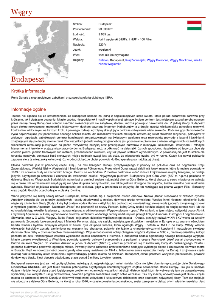 Węgry Stolica: Budapeszt Powierzchnia: 93 030 km² Ludność: 9 935 tys. Waluta: forint węgierski (HUF), 1 HUF = 100 Filler Napięcie: 220 V Język: węgierski Wiza: wiza nie jest wymagana Regiony: Balaton, Budapeszt, Kraj Zadunajski, Węgry Północne, Węgry Środkowe, Wielka Nizina Węgierska Budapeszt Krótka informacja Perła Dunaju z nieprzeciętnymi zabytkami oraz szeroką ofertą clubbingu i SPA. Informacje ogólne Trudno nie zgodzić się ze stwierdzeniem, że Budapeszt uchodzi za jedną z najpiękniejszych stolic świata, która potrafi oczarować zarówno przy krótszym, jak i dłuższym poznaniu. Miasto cudów, niespodzianek i magii wypełniającej tętniące życiem centrum jest miejscem szczodrze obdarzonym przez naturę rzeką Dunaj oraz stanowi skarbiec niekończących się zabytków, któremu można poświęcić nawet kilka dni. Z jednej strony Budapeszt łączy piękno nowoczesnej metropolii z historycznym duchem dawnego imperium Habsburgów, a z drugiej uwodzi wielkomiejską atmosferą rozrywki, kontrastami widocznymi na każdym kroku i pewnego rodzaju egzotyką ekscytująca podczas odkrywania wielu sekretów. Podczas gdy dla koneserów życia najważniejsze jest poznawanie nocnego oblicza miasta, dla miłośników wielkich metropolii otwiera się świat stuletnich rezydencji, pałacyków w zielonych ogrodach, zabytkowych centrów handlowych zorganizowanych na światowym poziomie oraz rezerwatów przyrody z lasami i jaskiniami, znajdującymi się po drugiej stronie rzeki. Dla wszystkich jednak wielką przyjemnością jest poznawanie piwniczek z winem, eleganckich rozświetlonych wieczorami restauracji pulsujących do późna rozrywkową muzyką oraz przepięknych bulwarów z mknącymi luksusowymi limuzynami i młodymi biznesmenami leniwie wracającymi po pracy do domu. Budapeszt można odkrywać na dziesiątki różnych sposobów, niezależnie od tego czy chce się chodzić pieszo, jeździć tramwajem lub metrem, przemieszczać rowerem, czy też pływać statkiem wycieczkowym. Z pewnością nie jest to stolica dla turystów ospałych, ponieważ ilość ciekawych miejsc godnych uwagi jest tak duża, że nieustannie trzeba być w ruchu. Każdy kto nawet pobieżnie zapozna się z tą mieszanką kulturowej różnorodności, będzie chciał powrócić do Budapesztu przy najbliższej okazji. Stolica położona jest w północnej części kraju, na obu brzegach Dunaju przepływającego z północy na południe oraz na pograniczu Kraju Zadunajskiego, Wielkiej Niziny Węgierskiej i Średniogórza Północnego. Przez wieki Dunaj raczej dzielił niż łączył miasto, które formalnie powstało w 1873 r. ze scalenia Budy na zachodnim brzegu i Pesztu na wschodnim. Z mostów doskonale widać różnice krajobrazowe między brzegami, co dodaje jedynie turystycznego smaczku i zachęca do zwiedzenia całości. Najwyższym punktem Budapesztu jest Góra Jana (527 m n.p.m.) położona w dzielnicy Buda na Wzgórzach Budańskich, natomiast w pamięci zostaje najbardziej stroma Góra Gellerta, której zbocza w sercu miasta ostro wcinają się w rzekę. Na wzniesieniach znajdują się nie tylko skupiska cennych roślin, ale także jaskinie dostępne dla turystów, źródła termalne oraz austriacka cytadela. Również najbliższa okolica Budapesztu jest ciekawa, gdyż w promieniu co najwyżej 30 km rozciągają się pasma wzgórz Pilis i Borzsony oraz pagórki Godollo przechodzące w płaską równinę. Warto przyjrzeć się bliżej samej nazwie Budapeszt, która składa się z połączenia dwóch członów. Nazwa „Buda” stosowana w czasach dynastii Arpadów odnosiła się do terenów zalesionych i osady zbudowanej w miejscu dawnego grodu rzymskiego. Według innej hipotezy, określenie Buda wiąże się z imieniem Bledy (Budy), który był bratem wodza Hunów – Attyli lub też pochodzi od słowiańskiego słowa woda („aqua”), związanego z kolei z rzymskim grodem Aquincum. Natomiast „Peszt” ma pochodzić od nazwy Pession, którą Grecy nadali osadzie leżącej po drugiej stronie rzeki lub też od słowiańskiego określenia pieczary, nazywanej przez średniowiecznych Węgrów piecem – „pest”. Po istnieniu w tym miejscu celtyckiej osady Ak-ink i rzymskiej Aquincum, w której wybudowano twierdzę, amfiteatr i wodociągi, tereny naddunajskie przejęli kolejno Hunowie, Ostrogoci, Longobardowie i Słowianie, oraz w X wieku Węgrzy. Buda, Peszt i najstarsza dzielnica współczesnego miasta – Obuda, przeżyły rozkwit w XIV i XV wieku za czasów panowania Zygmunta Luksemburskiego i Macieja Korwina, stając się szybko największym skupiskiem miejskim w Europie oraz znanym ośrodkiem handlu winem i bydłem. Kolejnym etapem w historii była okupacja turecka, która ogarnęła Węgry i dotarła w 1541 r. do Budy. Wtedy właśnie większość kościołów została zamieniona na meczety lub zburzona, pojawiły się łaźnie z charakterystycznymi kopułami i mauzoleum świętego derwisza Gula Baby – członka bractwa muzułmańskiego. Wojska habsburskie odbiły oblegane wzgórza dopiero w 1686 r., niemniej orientalny koloryt pozostał do dziś. Habsburgowie zaludnili wysiedlone miasto osadnikami z Niemiec, a odbudowa nadała aglomeracji nowego barokowego wyglądu. Miasto zaczęło rywalizować z Wiedniem, powstały szerokie bulwary i przedmieścia z parkami, a cesarz Franciszek Józef został ukoronowany w Budzie na króla Węgier. Po scaleniu dzielnic w jeden Budapeszt (1873 r.), centrum przeniosło się z królewskiej Budy do burżuazyjnego Pesztu i gorączka budowlana ponownie ogarnęła miasto. Powstały liczne założenia architektoniczne nadające wybitnego piękna i zbudowano pierwsze metro w Europie. Pęd ku nowoczesności powstrzymały obie wojny światowe (w 1944 r. hitlerowska armia wysadziła mosty na Dunaju i zrujnowała część miasta) oraz siermiężny okres komunizmu wprowadzający podział miasta na dzielnice. Budapeszt jednak przetrwał wszystkie przeciwności, 