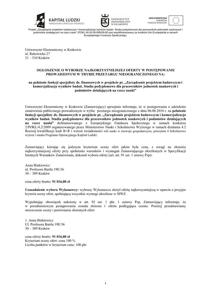 Projekt „Zarządzanie projektem badawczym i komercjalizacja wyników badań. Studia podyplomowe dla pracowników jednostek naukowych i podmiotów działających na rzecz nauki” (POKL.04.02-00-099/09-00) jest współfinansowany ze środków Unii Europejskiej w ramach Europejskiego Funduszu Społecznego. Uniwersytet Ekonomiczny w Krakowie ul. Rakowicka 27 31 – 510 Kraków OGŁOSZENIE O WYBORZE NAJKORZYSTNIEJSZEJ OFERTY W POSTĘPOWANIU PROWADZONYM W TRYBIE PRZETARGU NIEOGRANICZONEGO NA: na pełnienie funkcji specjalisty ds. finansowych w projekcie pt. „Zarządzanie projektem badawczym i komercjalizacja wyników badań. Studia podyplomowe dla pracowników jednostek naukowych i podmiotów działających na rzecz nauki” Uniwersytet Ekonomiczny w Krakowie (Zamawiający) uprzejmie informuje, Ŝe w postępowaniu o udzielenie zamówienia publicznego prowadzonym w trybie przetargu nieograniczonego z dnia 06.08.2010 r. na pełnienie funkcji specjalisty ds. finansowych w projekcie pt. „Zarządzanie projektem badawczym i komercjalizacja wyników badań. Studia podyplomowe dla pracowników jednostek naukowych i podmiotów działających na rzecz nauki” dofinansowanego z Europejskiego Funduszu Społecznego w ramach konkursu 2/POKL/4.2/2009 organizowanego przez Ministerstwo Nauki i Szkolnictwa WyŜszego w ramach działania 4.2 Rozwój kwalifikacji kadr B+R i wzrost świadomości roli nauki w rozwoju gospodarczym, priorytetu 4 Szkolnictwo wyŜsze i nauka Programu Operacyjnego Kapitał Ludzki. Zamawiający kierując się jedynym kryterium oceny ofert jakim była cena, z uwagi na złoŜenie najkorzystniejszej oferty przy spełnieniu warunków i wymagań Zamawiającego określonych w Specyfikacji Istotnych Warunków Zamówienia, dokonał wyboru oferty (art. art. 91 ust. 1 ustawy Pzp): Anna Binkiewicz ul. Profesora Bartla 19E/36 30 – 389 Kraków cena oferty brutto: 91 016,00 zł Uzasadnienie wyboru Wykonawcy: wybrany Wykonawca złoŜył ofertę najkorzystniejszą w oparciu o przyjęte kryteria oceny ofert, spełniającą wszystkie wymogi określone w SIWZ. Wypełniając obowiązek nałoŜony w art. 92 ust. 1 pkt. 1 ustawy Pzp, Zamawiający informuje, Ŝe w przedmiotowym postępowaniu została złoŜona 1 oferta podlegająca ocenie. PoniŜej przedstawiamy streszczenie oceny i porównania złoŜonych ofert: 1. Anna Binkiewicz Ul. Profesora Bartla 19E/36 30 – 389 Kraków cena oferty brutto: 91 016,00 zł Kryterium oceny ofert: cena 100 % Liczba punktów w kryterium cena: 100 pkt 1