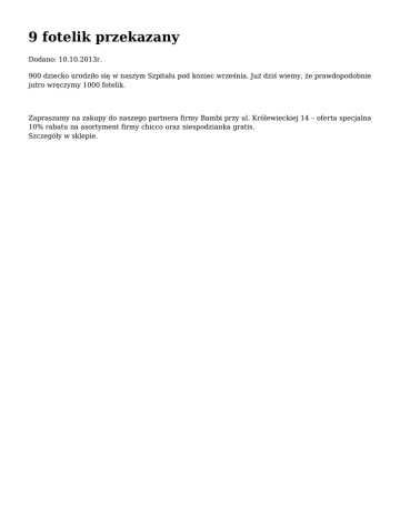 9 fotelik przekazany Dodano: 10.10.2013r. 900 dziecko urodziło się w naszym Szpitalu pod koniec września. Już dziś wiemy, że prawdopodobnie jutro wręczymy 1000 fotelik. Zapraszamy na zakupy do naszego partnera firmy Bambi przy ul. Królewieckiej 14 – oferta specjalna 10% rabatu na asortyment firmy chicco oraz niespodzianka gratis. Szczegóły w sklepie.