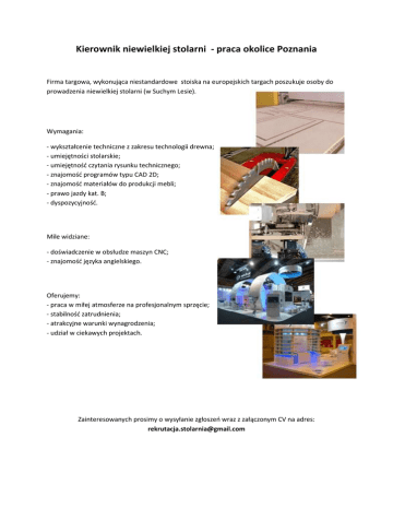 Kierownik niewielkiej stolarni - praca okolice Poznania Firma targowa, wykonująca niestandardowe stoiska na europejskich targach poszukuje osoby do prowadzenia niewielkiej stolarni (w Suchym Lesie). Wymagania: - wykształcenie techniczne z zakresu technologii drewna; - umiejętności stolarskie; - umiejętność czytania rysunku technicznego; - znajomość programów typu CAD 2D; - znajomość materiałów do produkcji mebli; - prawo jazdy kat. B; - dyspozycyjność. Mile widziane: - doświadczenie w obsłudze maszyn CNC; - znajomość języka angielskiego. Oferujemy: - praca w miłej atmosferze na profesjonalnym sprzęcie; - stabilność zatrudnienia; - atrakcyjne warunki wynagrodzenia; - udział w ciekawych projektach. Zainteresowanych prosimy o wysyłanie zgłoszeń wraz z załączonym CV na adres: [email protected]