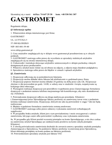 Skontaktuj się z nami: tel/fax: 74 647 29 30 kom. +48 530 561 307 GASTROMET Regulamin sklepu. §1 Informacje ogólne 1. Właścicielem sklepu internetowego jest firma: GASTROMET UL. LUTYCKA 5 57-300 KŁODZKO NIP: 883-001-59-40 www.sklep.gastromet.pl 2. Ceny artykułów znajdujących się w sklepie www.gastromet.pl przedstawione są w złotych polskich. 3. GASTROMET zastrzega sobie prawo do wycofania ze sprzedaży niektórych artykułów znajdujących się na stronie internetowej sklepu. 4. Ciekawostki i instrukcje dotyczące artykułów umieszczonych w sklepie pochodzą z danych dostępnonych przez producentów. 5. Właściwy artykuł może różnić się od obrazu na zdjęciu, a zdjecia maja charakter podglądowy. 6. Sprzedawca zastrzega sobie prawo do błędów w cenach i opisach artykułów. §2. Zamówienia 1. Dyspozycje odbywają się za pośrednictwem Internetu. 2. Dyspozycje można składać także faksem lub telefonicznie w godzinach pracy firmy. 3. Dyspozycje poprzez Internet można składać 24 godziny na dobę przez cały rok. Dyspozycje złożone w dni powszednie po godz. 14.00, w soboty oraz w niedziele i święta, rozpatrywane są kolejnego dnia roboczego. 4. Wymogiem realizacji dyspozycji jest prawidłowe wypełnienie przez Zamawiającego formularza dyspozycji z podaniem numeru telefonu stacjonarnego lub komórkowego, aby móc skontaktować się z Klientem. 5. Poświadczenie dyspozycji odbywa się droga mailową po przesłaniu Klientowi ( Zamawiającemu) przez Sprzedającego faktury proformy na zamówiony towar wraz z podaniem terminu realizacji zamówienia. Dyspozycje, których nie uda się potwierdzić w ciągu 7 dni nie będą realizowane. 6. Błędnie wypełnione formularze zamówienia zostaną anulowane. 7. GASTROMET zastrzega sobie prawo odmowy wykonania zamówień wzbudzających wątpliwości. 8. W przypadku braku artykułu, klient jest o tym powiadomiony i może zrezygnować z całości zamówienia, lub jego części albo potwierdzić wydłużony czas wykonania zamówienia. 8a. W przypadku gdy Klient przelał wczesniej pieniądze na konto Sprzedającego, a nie chce czekac na zamówiony artykuł Sprzedający po zainkasowaniu przelewu na konto odsyła pieniądze Klientowi. 9. Z chwilą poświadczenia zamówienia dochodzi do zawarcia umowy sprzedaży artykułu pomiędzy Zamawiającym a Sprzedawcą. Na podstawie faktury proformy wystawionej przez Sprzedawcę, klient dokonuję przedpłaty na konto podane na fakturze proformie. 10. Potwierdzeniem sprzedaży artykułu jest faktura VAT. §3. Formy płatności 1. Ustalając umowę kupna-sprzedaży Klient ma do wyboru następujące rodzaje płatności: - przedpłata 100% wartości zamówienia przed wysyłką artykułu na podstawie faktury pro-forma, - odbiór artykułu za pobraniem( do kwoty 1000 zł netto) płatność w momencie dostawy artykułupłatność kurierowi. - płatność gotówką przy odbiorze artykułu w siedzibie firmy GASTROMET.. 2. GASTROMET zastrzega sobie prawo do sprawdzenia wiarygodności i zdolności finansowej Zamawiającego. 3. Do czasu zapłaty całego zobowiązania, artykuł stanowi własność Sprzedawcy (art. 589 KC). §4. Termin realizacji 1. Czas materializacji dyspozycji to czas, który upływa od potwierdzenia dyspozycji do chwili wysyłki artykułu, przy czym zaliczane są tylko dni robocze. 2. Termin realizacji wynosi średnio w zależności od rodzaju zamawianego artykułu od 24 h do 14 dni od momentu potwierdzenia dyspozycji. 3. Sprzedawca zastrzega sobie prawo do wydłużania terminu realizacji. §5. Wysyłka 1. GASTROMET wysyła zakupione artykuły na adres wskazany w formularzu zamówienia, za pośrednictwem firmy kurierskiej. Jednocześnie zastrzegamy sobie prawo do wliczenia kosztów przesyłki, jeśli łączna kwota zamówienia nie przekracza 1000 zł netto. 2. Termin doręczenia zamówionych artykułów wynosi od 24 godzin do 14 dni roboczych ( w zależności od radzaju zamawianego artykułu) od momentu przekazania artykułów do wysyłki (dotyczy firm kurierskich). Jeżeli nie istnieje możliwość dostarczenia artykułu w podanym terminie Klient zostaje poinformowany o wydłużonym czasie realizacji zamówienia. W takim przypadku Klient może wycofać się z zamówienia, albo przyjąć nowe warunki realizacji i dostawy. 3. Podczas odbioru przesyłki Zamawiający ma za zadanie skontrolować w obecności pracownika firmy spedycyjnej jakość i kompletność dostawy. W przypadku niesprawności przesyłki konieczne jest spisanie protokołu szkody wraz z kurierem , a następnie możliwie jak najszybszy kontakt ze Sprzedającym. W przypadku odebrania paczki bez skontrolowania nie przyjmujemy reklamacji dotyczących uszkodzeń artykułu podczas transportu. Tylko na podstawie protokołu sporządzonego wraz z kurierem przy dostawie możemy wymienić artykuł na nowy. §6. Zwroty 1. Zgodnie z art. 27 ustawy z dnia 24 czerwca 2014r. „O prawach Konsumenta”. W przypadku zakupu atykułu przez Internet, Klient ma prawo do jego zwrotu bez podania przyczyn, składając stosowną deklaracje na piśmie w terminie 14 dni od daty odebrania artykułu. 1a. Jeżeli artykuł był wykonywany czy zamawiany dla Klienta na specjalne życzenie- artykuł taki nie podlega zwrotowi. 1b. Osobom fizycznym, które zawierają umowę na odległość w związku z prowadzoną działalnością gospodarczą oraz Zamawiającym innym niż osoby fizyczne nie przysługuje prawo zwrotu , o którym mowa w punkcie 1. 2. Zwrot artykułu odbywa się na koszt Zamawiającego. 3. Zwracany artykuł musi posiadać niezniszczone oryginalne opakowanie producenta, być kompletny i nie może nosić śladów eksploatacji. 4. Pieniądze za artykuł zostaną odesłane w ciągu 10 dni roboczych przelewem na konto wskazane przez Klienta. Koszt dostawy i odesłania nie podlega zwrotowi. 5. Wystawienie faktury korygującej i zwrot pieniędzy następuje po uprzednim sprawdzeniu stanu technicznego zwracanego artykułu. 6. W przypadku zwrotu ar