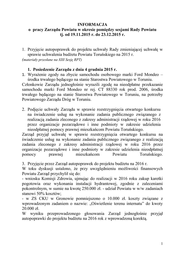 INFORMACJA o pracy Zarządu Powiatu w okresie pomiędzy sesjami Rady Powiatu tj. od 19.11.2015 r. do 23.12.2015 r. 1. Przyjęcie autopoprawek do projektu uchwały Rady zmieniającej uchwałę w sprawie uchwalenia budżetu Powiatu Toruńskiego na 2015 r. (materiały przesłane na XIII Sesję RPT) 1. Posiedzenie Zarządu z dnia 4 grudnia 2015 r. 1. Wyrażenie zgody na zbycie samochodu osobowego marki Ford Mondeo – środka trwałego będącego na stanie Starostwa Powiatowego w Toruniu. Członkowie Zarządu jednogłośnie wyrazili zgodę na nieodpłatne przekazanie samochodu marki Ford Mondeo nr rej. CT 88330 rok prod. 2006, środka trwałego będącego na stanie Starostwa Powiatowego w Toruniu, na potrzeby Powiatowego Zarządu Dróg w Toruniu. 2. Podjęcie uchwały Zarządu w sprawie rozstrzygnięcia otwartego konkursu na świadczenie usług na wykonanie zadania publicznego związanego z realizacją zadania zleconego z zakresy administracji rządowej w roku 2016 przez organizacje pozarządowe i inne podmioty w zakresie udzielenia nieodpłatnej pomocy prawnej mieszkańcom Powiatu Toruńskiego. Zarząd przyjął uchwałę w sprawie rozstrzygnięcia otwartego konkursu na świadczenie usług na wykonanie zadania publicznego związanego z realizacją zadania zleconego z zakresy administracji rządowej w roku 2016 przez organizacje pozarządowe i inne podmioty w zakresie udzielenia nieodpłatnej pomocy prawnej mieszkańcom Powiatu Toruńskiego. 3. Przyjęcie przez Zarząd autopoprawek do projektu budżetu na 2016 r. W toku dyskusji ustalono, że przy uwzględnieniu możliwości finansowych Powiatu Zarząd przychylił się do: - wniosku Komisji Zdrowia, ujmując do realizacji w 2016 roku zakup karetki pogotowia oraz wykonania instalacji hydrantowej, zgodnie z zaleceniami pokontrolnym, w sumie na kwotę 250.000 zł. - udział Powiatu w w/w zadaniach stanowi 50% kosztów; - w ZS CKU w Gronowie pomniejszono o 10.000 zł. koszty związane z wprowadzonym zadaniem o nazwie: „Oświetlenie terenu internatu” do kwoty 20.000 zł. W wyniku przeprowadzonego głosowania Zarząd jednogłośnie przyjął autopoprawki do projektu budżetu na 2016 rok z wprowadzoną korektą. 1 2. Posiedzenie Zarządu z dnia 9 grudnia 2015 r. 1. Podjęcie uchwały Zarządu w sprawie nadania Odznaki Honorowej za Zasługi dla Powiatu Toruńskiego. Sekretarz Powiatu omówił projekt uchwały w sprawie nadania Honorowej Odznaki dla Powiatu Toruńskiego dla wieloletniej i zaangażowanej w sprawy społeczne Pani Kazimiery Woźny. Powiedział, że wniosek złożony został przez 5 Radnych i pozytywnie zaopiniowany przez Komisję Statutowo – Regulaminową. Zarząd przyjął uchwałę w sprawie nadania Honorowej Odznaki dla Powiatu Toruńskiego. 2. Podjecie uchwały Zarządu w sprawie wyrażenia opinii dotyczącej realizacji inwestycji drogowej. Członek Zarządu Mirosław Nawrotek omówił projekt uchwały w sprawie wyrażenia opinii dotyczącej realizacji inwestycji drogowej. Dodał, że wniosek złożony został przez P. Filipa Grzelak z Firmy KFG sp. z o. o sp. k., ul. Wilczak 16a, 61-623 Poznań, występującego z upoważnienia Powiatowego Zarządu Dróg w Toruniu ul. Polna 113, działającego w imieniu zarządcy drogi t. j. Zarządu Powiatu Toruńskiego, dotyczący realizacji inwestycji drogowej pn.: „Rozbudowa drogi powiatowej nr 2011C Turzno-Papowo Toruńskie, poprzez budowę ścieżki pieszo-rowerowej w km 4+071 do km 7+171 o długości 3,1 km, w miejscowości Papowo Toruńskie i Gostkowo, gm. Łysomice. Zarząd podjął uchwałę w sprawie wyrażenia opinii dotyczącej realizacji inwestycji drogowej. 3. Podjęcie decyzji Zarządu w sprawie złomowania pojazdu. Członek Zarządu Wiesław Kazaniecki przedstawił operat szacunkowy dla samochodu osobowego Opel Astra F nr. rej. CB941AA, którego wartość rynkowa wynosi 383 zł. Dodał, że pojazd przejęty jest przez Powiat wyrokiem sądu, opinia biegłego rzeczoznawcy kwalifikuje go do likwidacji. Zarząd jednogłośnie podjął decyzję o złomowaniu pojazdu Opel Astra F 1.7 TD, rok prod. 1993 nr rej. CB941AA. 4. Posiedzenie Zarządu z dnia 16 grudnia 2015 r. 2. Założenia budżetu obywatelskiego. 3. Podjęcie uchwały Zarządu w sprawie ogłoszenia konkursu ofert na wykonanie zadań publicznych związanych z realizacją zadań samorządu powiatowego w roku 2016 przez organizacje pozarządowe i inne podmioty w zakresie: kultury, sztuki, ochrony dóbr kultury i tradycji, upowszechniania kultury fizycznej, edukacji ekologicznej oraz turystyki i krajoznawstwa. 2 4. Podjęcie uchwały Zarządu zmieniającej uchwałę w sprawie uchwalenia budżetu Powiatu Toruńskiego na 2015 rok. 5. Przyjęcie projektu uchwały Rady w sprawie udzielenia pomocy finansowej w formie dotacji celowej Gminie Chełmża. 6. Przyjęcie projektu uchwały Rady zmieniającej uchwałę w sprawie udzielenia pomocy finansowej w formie dotacji celowej Gminie Chełmża. 7 .Przyjęcie projektu uchwały Rady w sprawie w sprawie określenia zadań przyjętych do realizacji w roku 2016 w ramach środków Państwowego Funduszu Rehabilitacji Osób Niepełnosprawnych. 8. Przyjęcie projektu uchwały Rady w sprawie delegowania radnego do wspólnej dla Gminy Miasta Torunia i Powiatu Toruńskiego Komisji Bezpieczeństwa i Porządku. 9. Podjęcie uchwały Zarządu w sprawie zasad reprezentacji Powiatu Toruńskiego w Związku Powiatów Województwa Kujawsko – Pomorskiego 10. Zarząd udzielił jednorazowego pełnomocnictwa Andrzejowi Siemianowskiemu Wicestaroście Toruńskiemu do jednorazowego reprezentowania Powiatu Toruńskiego na XI Zgromadzeniu Związku Powiatów Województwa Kujawsko – Pomorskiego (materiały przesłane na XIV Sesję RPT – dot. pkt. 5-8) 1. 2. 3. 4. 5. 6. 3. Posiedzenie Zarządu z dnia 23 grudnia 2015 r. Diagnoza zapotrzebowania szkół pod kątem realizacji staży i praktyk zawodowych Podjęcie uchwały Zarządu w sprawie zatwierdzenia koncepcji projektu pn. : „Powiatowa Akademia Profesjona