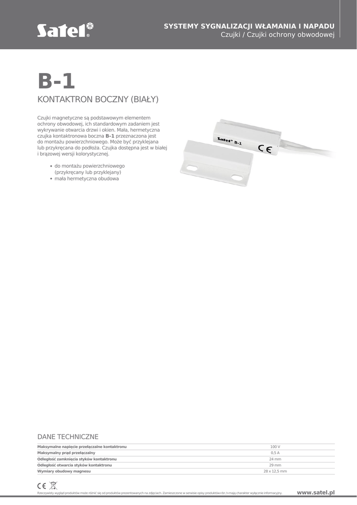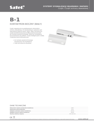 SYSTEMY SYGNALIZACJI WŁAMANIA I NAPADU Czujki / Czujki ochrony obwodowej B-1 KONTAKTRON BOCZNY (BIAŁY) Czujki magnetyczne są podstawowym elementem ochrony obwodowej, ich standardowym zadaniem jest wykrywanie otwarcia drzwi i okien. Mała, hermetyczna czujka kontaktronowa boczna B–1 przeznaczona jest do montażu powierzchniowego. Może być przyklejana lub przykręcana do podłoża. Czujka dostępna jest w białej i brązowej wersji kolorystycznej. do montażu powierzchniowego (przykręcany lub przyklejany) mała hermetyczna obudowa DANE TECHNICZNE Maksymalne napięcie przełączalne kontaktronu Maksymalny prąd przełączalny Odległość zamknięcia styków kontaktronu Odległość otwarcia styków kontaktronu Wymiary obudowy magnesu 100 V 0,5 A 24 mm 29 mm 28 x 12,5 mm Rzeczywisty wygląd produktów może różnić się od produktów prezentowanych na zdjęciach. Zamieszczone w serwisie opisy produktów<br />mają charakter wyłącznie informacyjny. www.satel.pl