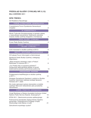 PRZEGL D SŁU BY CYWILNEJ NR 3 (12) MAJ–CZERWIEC 2011 SPIS TRE CI: Od Redaktora Naczelnego 1 FORUM DYREKTORÓW GENERALNYCH X posiedzenie Forum Dyrektorów Generalnych Urz dów 2 W ADMINISTRACJI Wyrok Trybunału Konstytucyjnego w sprawie ustawy o racjonalizacji zatrudnienia. Zwalnianie członków korpusu słu by cywilnej niezgodne z konstytucj 3 RADA SŁU BY CYWILNEJ Z prac Rady Słu by Cywilnej 4 BUD ET I WYNAGRODZENIA SŁU BY CYWILNEJ Limit mianowa w słu bie cywilnej w 2012 r. 5 WIZYTY, SPOTKANIA, KONFERENCJE XVI edycja Forum Informatyki w Administracji 6 Spotkanie Szefa Słu by Cywilnej z delegacj Afganistanu 7 „Mapa drogowa otwartego rz du w Polsce”. Warszawa, 9 czerwca 2011 r. 8 „Czy Polsk sta na sprawne pa stwo?” Inauguracja ogólnopolskiej debaty na temat doskonalenia polskiej administracji publicznej 10 ZARZ DZANIE KADRAMI Post powanie kwalifikacyjne w słu bie cywilnej w 2011 r. 12 Strategia Zarz dzania Zasobami Ludzkimi w Słu bie Cywilnej. Instrument realizacji strategii Sprawne Pa stwo 2011−2020 13 Kto mo e zajmowa wy sze stanowisko w słu bie cywilnej? Warunek niekaralno ci jako przesłanka zatrudnienia 16 DOBRE PRAKTYKI ZARZ DZANIA Urz d Skarbowy w Sierpcu laureatem konkursu United Nations Public Service Awards. Gratulujemy!!! 19 EPSA 2011. Zako czenie procesu aplikacyjnego 20 Podnoszenie standardów obsługi klienta niepełnosprawnego. Do wiadczenia Drugiego Urz du Skarbowego Łód -Bałuty w Łodzi 21 Zatrudnienie wysokiego ryzyka? Utworzenie call center w Urz dzie Miasta Poznania jako sposób na zwi kszenie efektywno ci zatrudnienia osób z orzeczon niepełnosprawno ci 24 PROJEKTY SYSTEMOWE Badania w zakresie społecznej percepcji słu by cywilnej. Podpisanie umowy 28 Współpraca administracji rz dowej z instytucjami analityczno-doradczymi. Seminarium, 1 czerwca 2011 r. 29 SZKOLENIA W SŁU BIE CYWILNEJ Obowi zki członka korpusu słu by cywilnej. Szkolenia z zakresu etyki 31 POLSKA PREZYDENCJA W UNII EUROPEJSKIEJ Polska prezydencja w Sieci Unii Europejskiej ds. Administracji Publicznej (EUPAN). 1 lipca – 31 grudnia 2011 r. CO NOWEGO? 33 O NOWEGO? „Kto kieruje globalizacj ? Think Tanki − ku nie nowych idei”. Wydawnictwo Difin, Warszawa 2011 r. 38 Nowy numer „Zarz dzania Zasobami Ludzkimi” 40 POLECAMY Logo polskiej prezydencji w Radzie Unii Europejskiej 41 Bud et pa stwa na 2012 r. 41 Kontrole w administracji rz dowej 41 Nowe dowody osobiste od 1 stycznia 2013 r. 41 „Mama w pracy” – wyniki konkursu 2011 r. 41 Program polskiej prezydencji w UE 42 Nowelizacja ustawy o KSAP 42 Sprawozdanie Szefa Słu by Cywilnej za 2010 r. 42 ADMINISTRACJA W PUBLIKATORACH Nowy Niezale ny Portal Członków Korpusu Słu by Cywilnej; www.sluzbacywilna.info.pl REDAKCJA 43