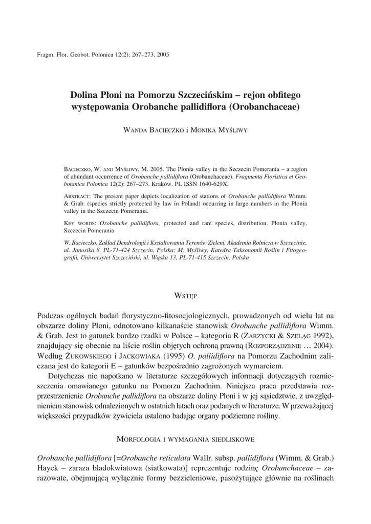 Fragm. Flor. Geobot. Polonica 12(2): 267–273, 2005 Dolina Płoni na Pomorzu Szczecińskim – rejon obfitego występowania Orobanche pallidiflora (Orobanchaceae) WANDA BACIECZKO i MONIKA MYŚLIWY BACIECZKO, W. AND MYŚLIWY, M. 2005. The Płonia valley in the Szczecin Pomerania – a region of abundant occurrence of Orobanche pallidiflora (Orobanchaceae). Fragmenta Floristica et Geobotanica Polonica 12(2): 267–273. Kraków. PL ISSN 1640-629X. ABSTRACT: The present paper depicts localization of stations of Orobanche pallidiflora Wimm. & Grab. (species strictly protected by law in Poland) occurring in large numbers in the Płonia valley in the Szczecin Pomerania. KEY WORDS: Orobanche pallidiflora, protected and rare species, distribution, Płonia valley, Szczecin Pomerania W. Bacieczko, Zakład Dendrologii i Kształtowania Terenów Zieleni, Akademia Rolnicza w Szczecinie, ul. Janosika 8, PL-71-424 Szczecin, Polska; M. Myśliwy, Katedra Taksonomii Roślin i Fitogeografii, Uniwersytet Szczeciński, ul. Wąska 13, PL-71-415 Szczecin, Polska WSTĘP Podczas ogólnych badań florystyczno-fitosocjologicznych, prowadzonych od wielu lat na obszarze doliny Płoni, odnotowano kilkanaście stanowisk Orobanche pallidiflora Wimm. & Grab. Jest to gatunek bardzo rzadki w Polsce – kategoria R (ZARZYCKI & SZELĄG 1992), znajdujący się obecnie na liście roślin objętych ochroną prawną (ROZPORZĄDZENIE … 2004). Według ŻUKOWSKIEGO i JACKOWIAKA (1995) O. pallidiflora na Pomorzu Zachodnim zaliczana jest do kategorii E – gatunków bezpośrednio zagrożonych wymarciem. Dotychczas nie napotkano w literaturze szczegółowych informacji dotyczących rozmieszczenia omawianego gatunku na Pomorzu Zachodnim. Niniejsza praca przedstawia rozprzestrzenienie Orobanche pallidiflora na obszarze doliny Płoni i w jej sąsiedztwie, z uwzględnieniem stanowisk odnalezionych w ostatnich latach oraz podanych w literaturze. W przeważającej większości przypadków żywiciela ustalono badając organy podziemne rośliny. MORFOLOGIA I WYMAGANIA SIEDLISKOWE Orobanche pallidiflora [=Orobanche reticulata Wallr. subsp. pallidiflora (Wimm. & Grab.) Hayek – zaraza bladokwiatowa (siatkowata)] reprezentuje rodzinę Orobanchaceae – zarazowate, obejmującą wyłącznie formy bezzieleniowe, pasożytujące głównie na roślinach 268 Fragm. Flor. Geobot. Polonica 12(2), 2005 naczyniowych. W Polsce znanych jest 16 gatunków z rodzaju Orobanche (według MĄDALSKIEGO 1967 – około 15), w tym jeden efemerofit oraz jeden gatunek o niepewnym statusie w naszej florze (MIREK i in. 2002). Wszystkie są roślinami rzadkimi zarówno w Polsce, jak i na terenie Europy. Orobanche pallidiflora – według SZAFERA i in. (1976) – to roślina dwuletnia, z silną, w nasadzie bulwkowato zgrubiałą łodygą, o barwie żółtawej lub czerwonawej, pokrytą łuskami i ogruczoloną. Osiąga wysokość od 10 do 70, rzadko do 90 cm. Kwiatostan ma pojedynczy, kłosowaty, z licznymi kwiatami. Kwiaty, o długości 20–23 mm, siedzą w kątach przysadek, podobnych do łusek osadzonych na łodydze. Łatki kielicha są wolne, całobrzegie lub dwuzębne. Ząbki o barwie (w stanie świeżym) fioletowej mają trzy niewyraźne nerwy. Korona kwiatów jest żółtawobiała, dwuwargowa. Dwułatkowa warga górna ma barwę fioletową lub purpurową z fioletowymi nerwami i jest pokryta gęsto siedzącymi, purpurowymi włoskami. Jej łatki są bardzo szerokie, zaokrąglone i odstające. Warga dolna jest trzyłatkowa, o łatkach zaokrąglonych, pokrytych długimi włoskami. Pręciki, osadzone 2–4 mm nad nasadą rurki korony, są nagie i mają pylniki połączone łącznikiem z ostrym kończykiem. Znamię słupka jest dwułatkowe, o barwie czerwonofioletowej lub purpurowej. Owocem jest elipsoidalna torebka (MĄDALSKI 1967). Orobanche pallidiflora pasożytuje na roślinach z rodziny Asteraceae, zwłaszcza na gatunkach z rodzaju Cirsium i Carduus, rzadziej Knautia i pokrewnych (WEBB 1972). Wymaga umiarkowanego naświetlenia oraz umiarkowanie ciepłych warunków klimatycznych. Wybiera gleby mezotroficzne, ubogie w materię organiczną, o odczynie zasadowym i zróżnicowanej wilgotności: od suchych, poprzez świeże, aż do wilgotnych (ZARZYCKI i in. 2002). ZASIĘG W POLSCE, W EUROPIE I NA ŚWIECIE W Polsce Orobanche pallidiflora jest gatunkiem bardzo rzadkim. Aktualnie znane są stanowiska z południa kraju – z Sudetów Zachodnich (KWIATKOWSKI 2001) i z Wojcieszowic koło Złotoryi (stanowisko podane przez członków Klubu Przyrodników na stronie internetowej www.lonicera.hg.pl/news/ak_pol20041.html) oraz z Polski północno-zachodniej – z doliny Płoni (BACIECZKO 1984, 1991, 1995, 2002; ZIARNEK 2002; MYŚLIWY 2003) (Ryc. 1). Pozostałe, odnotowane wcześniej stanowiska (z wyjątkiem jednego nad Wisłą), nie zostały dotychczas potwierdzone i uważane są za zanikłe (ZAJĄC & ZAJĄC 2001). W Europie zaraza bladokwiatowa rozprzestrzenia się w ponad 20 krajach. Występuje od Hiszpanii na zachodzie, poprzez Europę Środkową i Południową, aż po Ural i Kaukaz. Natomiast w Azji i Azji Mniejszej po Himalaje (MĄDALSKI 1967; GILLI 1974; www. Linnaeus.nrm.se/flora/di/orobanche/orba/orobret.html). Pojedyncze stanowiska notowano ponadto w północnej części Afryki (MEUSEL i in. 1978). Zasięg tego gatunku ma charakter zasięgu nieciągłego (tak zwany zasięg ciągły z oderwanymi wyspami). STANOWISKA OROBANCHE PALLIDIFLORA NA TERENIE DOLINY PŁONI Opisane poniżej stanowiska ponumerowano od 1 do 20, zgodnie z oznaczeniami na mapie (Ryc. 1). W przypadku stanowisk podanych z literatury w nawiasie umieszczono nazwisko autora i rok publikacji. W. Bacieczko & M. Myśliwy: Orobanche pallidiflora na Pomorzu Szczecińskim 269 Ryc. 1. Rozmieszczenie stanowisk Orobanche pallidiflora Wimm. & Grab. w dolinie Płoni na Pomorzu Szczecińskim od 1 do 20 – numeracja jak w tekście. 1 – drogi, 2 – rzeki, 3 – jeziora, 4 – stanowiska opublikowane, 5–7 – nowe stano