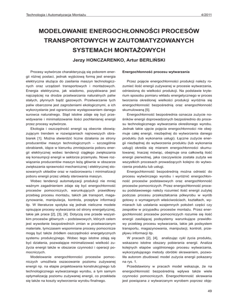 Technologia i Automatyzacja Montażu 4/2011 MODELOWANIE ENERGOCHŁONNOŚCI PROCESÓW TRANSPORTOWYCH W ZAUTOMATYZOWANYCH SYSTEMACH MONTAŻOWYCH Jerzy HONCZARENKO, Artur BERLIŃSKI Procesy wytwórcze charakteryzują się poborem energii różnej postaci, jednak wyjściową formą jest energia elektryczna służąca do zasilania maszyn technologicznych oraz urządzeń transportowych i montażowych. Energia elektryczna, jak wiadomo, pozyskiwana jest najczęściej na drodze przetwarzania naturalnych paliw stałych, płynnych bądź gazowych. Przetwarzanie tych paliw obarczone jest zagrożeniami ekologicznymi, a ich wykorzystanie jest ograniczone występowaniem danego surowca naturalnego. Stąd istotne zdaje się być przewidywanie i minimalizowanie ilości pochłanianej energii przez procesy wytwórcze. Ekologia i oszczędność energii są obecnie obowiązującym trendem w rozwiązaniach najnowszych obrabiarek [1]. Można stwierdzić liczne działania ze strony producentów maszyn technologicznych – szczególnie obrabiarek, idące w kierunku zmniejszania poboru energii elektrycznej wobec tendencji ciągłego zwiększania się konsumpcji energii w sektorze przemysłu. Nowe rozwiązania producentów maszyn leżą głównie w obszarze zwiększania sprawności mechanicznej i elektrycznej stosowanych układów oraz w nadzorowaniu i minimalizacji poboru energii przez układy sterowania maszyn. Wobec tendencji automatyzacji produkcji nie mniej ważnym zagadnieniem zdaje się być energochłonność procesów pomocniczych, warunkujących prawidłowy przebieg procesu montażu, takich jak transport, magazynowanie, manipulacja, kontrola, przepływ informacji itp. W literaturze spotyka się jednak nieliczne modele opisujące procesy wytwarzania od strony energetycznej, takie jak prace [2], [3], [4]. Dotyczą one przede wszystkim procesów głównych – podstawowych, których celem jest wywołanie bezpośrednich zmian w przetwarzanym materiale, tymczasem wspomniane procesy pomocnicze mogą być także źródłem oszczędności energetycznych systemu produkcyjnego. Wobec tego istotne zdają się być działania, pozwalające minimalizować wielkość zużycia energii także w obszarze czynności i operacji pomocniczych. Modelowanie energochłonności procesów pomocniczych umożliwia oszacowanie poziomu zużywanej energii np. na etapie projektowania konstrukcyjnego lub technologicznego wytwarzanego wyrobu, a tym samym optymalizację poziomu zużywanej energii, co przekłada się także na koszty wytworzenia wyrobu finalnego. Energochłonność procesu wytwarzania Przez pojęcie energochłonności produkcji należy rozumieć ilość energii zużywanej w procesie wytwarzania, odniesioną do wielkości produkcji. Na podstawie kryterium sposobu pomiaru wkładu energetycznego w proces tworzenia określonej wielkości produkcji wyróżnia się energochłonność bezpośrednią oraz energochłonność skumulowaną [5]. Energochłonność bezpośrednia oznacza zużycie nośników energii doprowadzonych bezpośrednio do procesu technologicznego wytwarzania określonego wyrobu. Jednak takie ujęcie pojęcia energochłonności nie obejmuje całej energii, niezbędnej do wytworzenia danego produktu (lub wykonania usługi). Łączne zużycie energii niezbędnej do wytworzenia produktu (lub wykonania usługi) określa się mianem energochłonności skumulowanej. Inaczej mówiąc, obejmuje ona całkowitą ilość energii pierwotnej, jaka rzeczywiście została zużyta we wszystkich procesach prowadzących kolejno do wytworzenia produktu lub usługi. Energochłonność bezpośrednią można odnieść do procesu wytwórczego wyrobu i wyróżnić energochłonność procesów podstawowych oraz energochłonność procesów pomocniczych. Przez energochłonność procesu podstawowego należy rozumieć ilość energii zużytej podczas procesu przekształcania półwyrobu w wyrób gotowy o wymaganych właściwościach, kształtach, wymiarach lub ustalania wzajemnych położeń części czy zespołów w przypadku procesów montażu. Przez energochłonność procesów pomocniczych rozumie się ilość energii zasilającej podsystemy warunkujące prawidłowy przebieg procesu wytwarzania, takie jak podsystem transportu, magazynowania, manipulacji, kontroli, przepływu informacji itp. W pracach [2], [4], analizując cykl życia produktu, wskazano istotne obszary pobierania energii. Analiza kolejnych etapów uogólnionego procesu wytwarzania, wykorzystującego metody obróbki skrawaniem, pozwoliła autorom zbudować model zużycia energii pokazany na rys. 1. Przedstawiony w pracach model wskazuje, że na energochłonność bezpośrednią wpływa także wiele czynności pomocniczych. Energochłonność skrawania jest powiązana z wytwarzanym wyrobem poprzez obję49 4/2011 Technologia i Automatyzacja Montażu tość zdejmowanego naddatku. n Ec = k c ⋅ 10 − 3 ⋅ ∏ K i ⋅ Vi , [J] i =1 gdzie: kc – energochłonność skrawania, opór właściwy skrawania, współczynniki poprawkowe, objętość naddatku. Rys. 1. Istotne obszary pochłaniania energii w systemie produkcyjnym [4] Nakład energetyczny obrabiarki oraz procesów pomocniczych wyznacza się z zależności, która uwzględnia jedynie moc średnią napędu elektrycznego wykorzystywanego w urządzeniu [4], np.: n Et = ¦ Pi ⋅ (t g + t j ) , [J] i =1 gdzie: tj – czas biegu jałowego, tg – czas główny stanowiska produkcyjnego, Pi – średnia moc urządzenia zużywana podczas pracy. Udział zużywanej energii na zasilanie otoczenia systemu produkcyjnego, jak podają autorzy w [4], to 60 – 90%. Model analityczny energochłonności podsystemów transportowych Rys. 2. Przykład urządzenia transportowego w zautomatyzowanym systemie wytwarzania oraz elementy bilansu energetycznego: Ep – energia potencjalna, Ek – energia kinetyczna, m·g – ciężar własny, ET – energia składowej oporu toczenia Rozpatrując wyidealizowany model urządzenia transportowego (np.