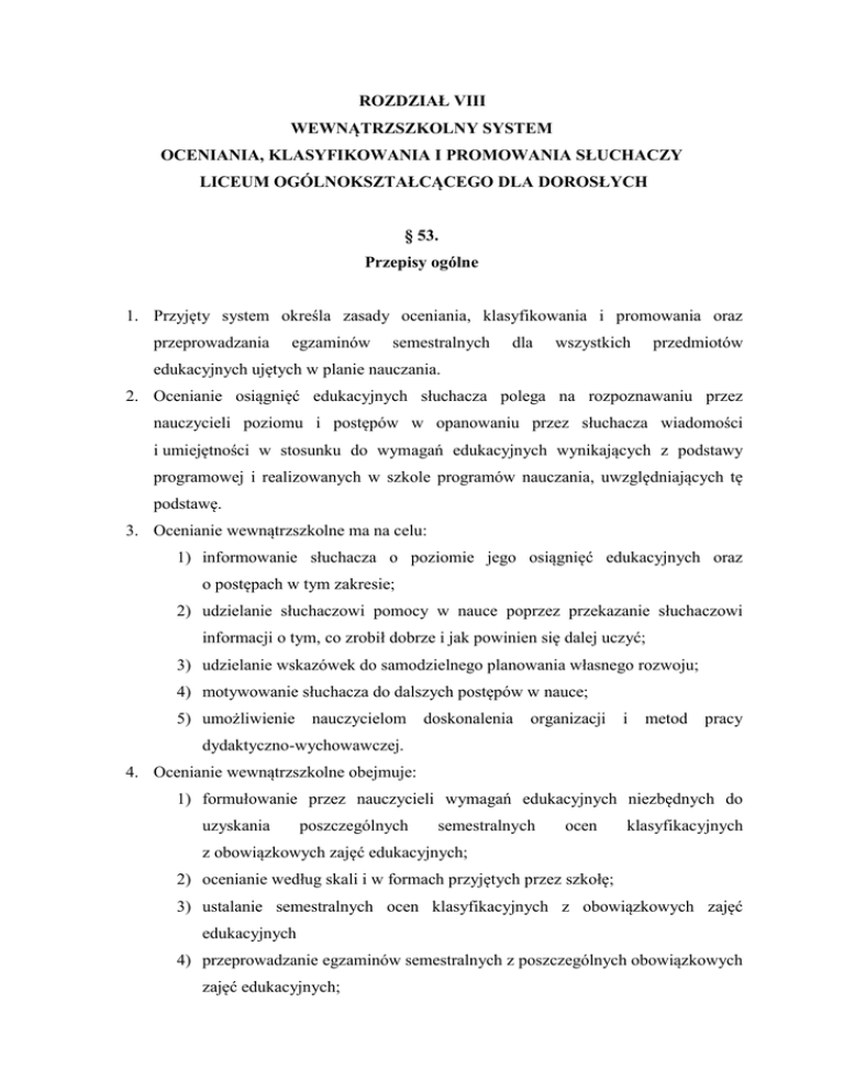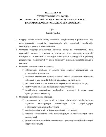 ROZDZIAŁ VIII WEWNĄTRZSZKOLNY SYSTEM OCENIANIA, KLASYFIKOWANIA I PROMOWANIA SŁUCHACZY LICEUM OGÓLNOKSZTAŁCĄCEGO DLA DOROSŁYCH § 53. Przepisy ogólne 1. Przyjęty system określa zasady oceniania, klasyfikowania i promowania oraz przeprowadzania egzaminów semestralnych dla wszystkich przedmiotów edukacyjnych ujętych w planie nauczania. 2. Ocenianie osiągnięć edukacyjnych słuchacza polega na rozpoznawaniu przez nauczycieli poziomu i postępów w opanowaniu przez słuchacza wiadomości i umiejętności w stosunku do wymagań edukacyjnych wynikających z podstawy programowej i realizowanych w szkole programów nauczania, uwzględniających tę podstawę. 3. Ocenianie wewnątrzszkolne ma na celu: 1) informowanie słuchacza o poziomie jego osiągnięć edukacyjnych oraz o postępach w tym zakresie; 2) udzielanie słuchaczowi pomocy w nauce poprzez przekazanie słuchaczowi informacji o tym, co zrobił dobrze i jak powinien się dalej uczyć; 3) udzielanie wskazówek do samodzielnego planowania własnego rozwoju; 4) motywowanie słuchacza do dalszych postępów w nauce; 5) umożliwienie nauczycielom doskonalenia organizacji i metod pracy dydaktyczno-wychowawczej. 4. Ocenianie wewnątrzszkolne obejmuje: 1) formułowanie przez nauczycieli wymagań edukacyjnych niezbędnych do uzyskania poszczególnych semestralnych ocen klasyfikacyjnych z obowiązkowych zajęć edukacyjnych; 2) ocenianie według skali i w formach przyjętych przez szkołę; 3) ustalanie semestralnych ocen klasyfikacyjnych z obowiązkowych zajęć edukacyjnych 4) przeprowadzanie egzaminów semestralnych z poszczególnych obowiązkowych zajęć edukacyjnych; 5) przeprowadzanie egzaminów klasyfikacyjnych, sprawdzających, poprawkowych i sprawdzianów wiedzy i umiejętności; 6) ustalanie warunków i trybu uzyskania wyższych niż ustalone semestralnych ocen klasyfikacyjnych z obowiązkowych zajęć edukacyjnych; 7) warunki dopuszczenia słuchacza do egzaminu semestralnego; 8) formy oceniania bieżącego. 5. Nie ocenia się zachowania słuchacza. § 54 Organizacja roku szkolnego 1. Rok szkolny podzielony jest na dwa semestry. Semestr pierwszy trwa od pierwszego powszedniego dnia (z wyjątkiem soboty) września do 31 stycznia; drugi rozpoczyna się pierwszego powszedniego dnia lutego, a kończy w dniu wskazanym przez MEN. § 55 Ogólne zasady oceniania, klasyfikowania i promowania słuchaczy 1. Nauczyciele na początku roku szkolnego informują słuchaczy o wymaganiach edukacyjnych z realizowanego przez siebie programu nauczania oraz o: 1) wymaganiach edukacyjnych niezbędnych do otrzymania przez słuchacza poszczególnych semestralnych ocen klasyfikacyjnych z zajęć edukacyjnych, wynikających z realizowanego przez siebie programu nauczania; 2) sposobach sprawdzania osiągnięć edukacyjnych słuchaczy; 3) warunkach i trybie otrzymania wyższej niż przewidywana semestralnej, oceny klasyfikacyjnej z zajęć edukacyjnych. 2. Nauczyciel jest obowiązany dostosować wymagania edukacyjne niezbędne do otrzymania przez słuchacza semestralnych, ocen klasyfikacyjnych z zajęć edukacyjnych, wynikających z realizowanego przez siebie programu nauczania do indywidualnych potrzeb rozwojowych i edukacyjnych oraz możliwości psychofizycznych słuchacza. 3. Dyrektor szkoły zwalnia słuchacza z zajęć informatyki na podstawie opinii o ograniczonych możliwościach uczestniczenia w tych zajęciach, wydanej przez lekarza, oraz na czas określony w tej opinii. 4. Jeżeli okres zwolnienia ucznia z realizacji zajęć, o którym mowa w ust. 3, uniemożliwia ustalenie semestralnej oceny klasyfikacyjnej, w dokumentacji przebiegu nauczania zamiast oceny klasyfikacyjnej wpisuje się „zwolniony” albo „zwolniona”. 5. Na wniosek słuchacza dokumentacja dotycząca egzaminu klasyfikacyjnego i egzaminu poprawkowego, oraz inna dokumentacja dotycząca oceniania słuchacza jest udostępniana do wglądu słuchacza. 6. Przed rozpoczęciem realizacji programu nauczyciel zapoznaje słuchaczy z treścią programu nauczania oraz wymaganiami zawartymi w PSO. 7. Oceny klasyfikacyjne z zajęć edukacyjnych ustala się po każdym semestrze wg skali: Stopień Oznaczenia cyfrowe Skrót literowy Celujący 6 cel bardzo dobry 5 bdb Dobry 4 db Dostateczny 3 dst dopuszczający 2 dop niedostateczny 1 ndst 8. W ocenianiu nie stosuje się plusów i minusów. 9. Oceny klasyfikacyjne z obowiązkowych zajęć edukacyjnych stanowią podstawę do promowania słuchacza na semestr programowo wyższy lub ukończenia przez niego szkoły. 10. Klasyfikacja słuchaczy dokonywana jest semestralnie. Następuje zawsze po przeprowadzeniu ostatniego egzaminu semestralnego. 11. Oceny klasyfikacyjne ustalają nauczyciele prowadzący poszczególne zajęcia edukacyjne. 12. Klasyfikację zatwierdza Rada Pedagogiczna na plenarnym posiedzeniu. 13. Ocena klasyfikacyjna semestralna z zajęć edukacyjnych wyrażona jest w skali od 1 do 6 (niedostateczny, dopuszczający, dostateczny, dobry, bardzo dobry, celujący). 14. Ustala się następujące ogólne kryteria stopni: 1) ocenę celującą otrzymuje słuchacz, który: a) posiadł wiedzę i umiejętności wykraczające poza program nauczania przedmiotu w danym semestrze, samodzielnie i twórczo rozwija własne uzdolnienia oraz b) biegle posługuje się zdobytymi wiadomościami w rozwiązywaniu problemów teoretycznych i praktycznych z programu nauczania danego semestru, proponuje rozwiązania nietypowe, rozwiązuje także zadania wykraczające poza program nauczania tego semestru, 2) ocenę bardzo dobrą otrzymuje słuchacz, który: a)opanował pełny zakres wiedzy i umiejętności określony programem nauczania w danym semestrze oraz b) sprawnie posługuje się zdobytymi wiadomościami, rozwiązuje samodzielnie problemy teoretyczne i praktyczne ujęte w programie nauczania, potrafi zastosować posiadaną wiedzę do rozwiązywania zadań i problemów w nowych sytuacjach; 3) ocenę dobrą otrzymuje słuchacz, który: a) nie opanował w 