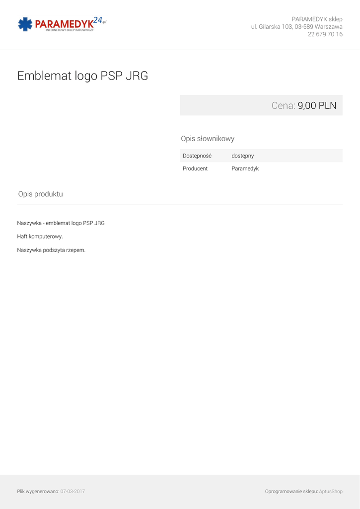 PARAMEDYK sklep ul. Gilarska 103, 03-589 Warszawa 22 679 70 16 Emblemat logo PSP JRG Cena: 9,00 PLN Opis słownikowy Dostępność dostępny Producent Paramedyk Opis produktu Naszywka - emblemat logo PSP JRG Haft komputerowy. Naszywka podszyta rzepem. Plik wygenerowano: 07-03-2017 Powered by TCPDF (www.tcpdf.org) Oprogramowanie sklepu: AptusShop