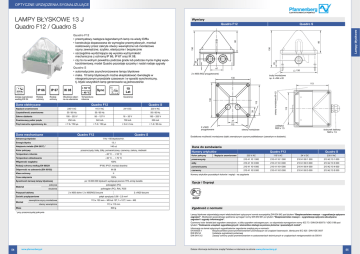 Optyczne urządzenia sygnalizujące Lampy błyskowe 13 J Quadro F12 / Quadro S Wymiary Rodzaj ochrony - 40 °C Obudowa odporna na uderzenia Dane elektryczne I Sync t Quadro F12 Quadro S 230 V AC 115 V AC Częstotliwość znamionowa 50 / 60 Hz 50 / 60 Hz 195 – 253 V 95 – 127 V 18 – 30 V 250 mA 340 mA 700 mA 250 mA 37 < 7 A / 150 µs < 7 A / 150 µs < 5 A / 2 ms < 1 A / 50 ms 113 Zakres działania Prąd rozruchu ograniczony do 230 V AC 39 24 V DC 50 / 60 Hz 195 – 253 V 2 x M20 przygotowane Dane mechaniczne Quadro F12 Sekwencja błysków Quadro S 1 Hz = 60 błysków/min. Energia błysku 140 cd Kolor pokrywy przezroczysty, biały, żółty, pomarańczowy, czerwony, zielony, niebieski Temperatura robocza - 40 °C ... + 55 °C Temperatura składowania - 40 °C ... + 70 °C Wilgotność względna śrubunek kablowy M20 x 1,5 Dodatkowa możliwość montażowa dzięki zewnętrznym szynom podkładowym (zawartym w dostawie). IP 66, IP 67, montaż dowolna Odporność na uderzenia (EN 50102) IK 08 Klasa ochrony II Czas załączania po 12.000.000 błyskach występuje jeszcze 70% emisji światła pokrywa Materiał obudowa Przepust kablowy poliwęglan (PC) zewnętrzne szyny montażowe otwory wewnętrzne Masa Quadro F12 Quadro S 230 V AC 115 V AC 24 V DC 230 V AC przezroczysty 210 41 10 1 000 210 41 16 1 000 210 41 80 1 000 210 42 10 1 000 żółty 210 41 10 3 000 210 41 16 3 000 210 41 80 3 000 210 42 10 3 000 pomarańczowy 210 41 10 4 000 210 41 16 4 000 210 41 80 4 000 210 42 10 4 000 czerwony 210 41 10 5 000 210 41 16 5 000 210 41 80 5 000 210 42 10 5 000 Opcje / Osprzęt 2 x M20 boczne pałąk sprężysty 0,08 - 2,5 mm2 113 x 153 mm – M5 lub 127,1 x 127,1 mm – M5 GOST 113 x 113 mm 600 g przy przezroczystej pokrywie Napięcie znamionowe poliwęglan (PC), RAL 7035 2 x M20 dolne / 2 x M20/M32 boczne Zaciski przyłączeniowe Numery artykułów Numery artykułów pozostałych kolorów i napięć - na zapytanie 100% Żywotność żarowej lampy błyskowej Dane do zamówienia Kolor pokrywy 100% Rodzaj ochrony według EN 60529 1 otwory montażowe zaślepka M20 x 1,5 13 J Natężenie światła (DIN 5037) 1 Montaż Lampy błyskowe 25 Gwarancji Napięcie znamionowe Znamionowy pobór prądu 80 130 130 10 Lat lim Temperatura robocza 113 113 Rodzaj ochrony + 55 °C IK 08 śruby montażowe np. 4 x M4 x 20 130 otwory montażowe Ø 4,5 Zasięg sygnalizacji według EN 54 IP 67 130 2 x M20 (M32 przygotowane) 113 IP 66 47 130 r= 19 m 25 Quadro F12 • przemysłowy następca legendarnych lamp na wieży Eiffla • konstrukcja dopasowana do wymogów przemysłowych, montaż realizowany przez zakryte otwory wewnętrzne lub montażowe szyny zewnętrzne; szybko, elastycznie i bezpiecznie • szczególnie wyróżniająca się wysoka wytrzymałość mechaniczna z ochroną IP 66, IP 67 oraz IK 08; • czy to na wolnym powietrzu podczas gradu lub podczas mycia myjką wysokociśnieniową; model Quadro pozostaje szczelny i nadal nadaje sygnały Quadro S • automatycznie zsynchronizowane lampy błyskowe • maks. 10 lamp błyskowych można eksploatować równolegle w nieograniczonym przedziale czasowym i w sposób synchroniczny, tj. błyski wszystkich lamp generowane są jednocześnie Quadro S 80 Quadro F12 Zgodność z normami Lampy błyskowe odpowiadają swymi właściwościami optycznymi normie europejskiej DIN EN 842 pod tytułem “Bezpieczeństwo maszyn – sygnalizacja optyczna zagrożeń“. Możliwość opcjonalnego spełnienia wymagań normy DIN EN 981 po tytułem “Bezpieczeństwo maszyn – sygnalizacja optyczno-akustyczna zagrożeń i sygnały informacyjne“. Czerwony kolor świateł jest sygnałem awaryjnym, a żółty sygnałem ostrzegawczym, co odpowiada wymaganiom normy IEC 73 / DIN EN 60073 / VDE 0199 pod tytułem “Kodowanie urządzeń sygnalizacyjnych i elementów obsługi za pomocą kolorów i pozostałych metod“. Informacje na temat optycznych sygnalizatorów zagrożenia znajdują się w normach: EN 60825-1 Bezpieczeństwo przed promieniowaniem pochodzącym od urządzeń laserowych, identyczne IEC 825 i DIN-VDE 0837 DIN EN 54Instalacje sygnalizacji pożarowej DIN 54113-2Zasady ochrony przed promieniowaniem w zastosowaniach technicznych w urządzeniach rentgenowskich do 500 kV 54 www.pfannenberg.pl Dalsze informacje techniczne znajdą Państwo w internecie na stronie www.pfannenberg.pl 55