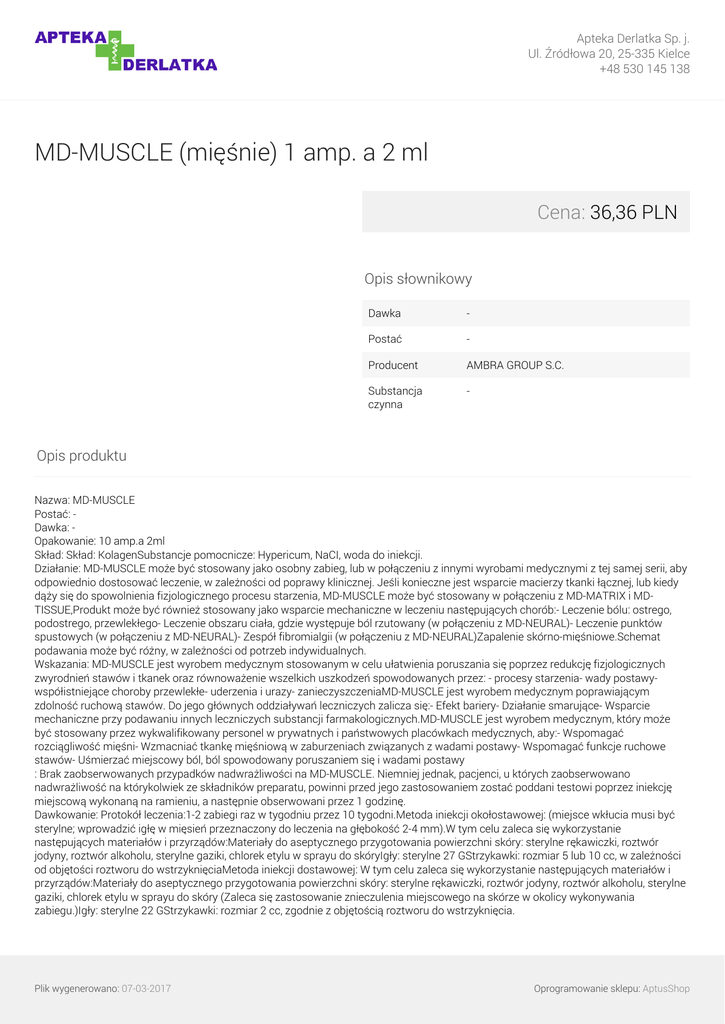 Apteka Derlatka Sp. j. Ul. Źródłowa 20, 25-335 Kielce +48 530 145 138 MD-MUSCLE (mięśnie) 1 amp. a 2 ml Cena: 36,36 PLN Opis słownikowy Dawka - Postać - Producent AMBRA GROUP S.C. Substancja czynna - Opis produktu Nazwa: MD-MUSCLE Postać: Dawka: Opakowanie: 10 amp.a 2ml Skład: Skład: KolagenSubstancje pomocnicze: Hypericum, NaCI, woda do iniekcji. Działanie: MD-MUSCLE może być stosowany jako osobny zabieg, lub w połączeniu z innymi wyrobami medycznymi z tej samej serii, aby odpowiednio dostosować leczenie, w zależności od poprawy klinicznej. Jeśli konieczne jest wsparcie macierzy tkanki łącznej, lub kiedy dąży się do spowolnienia fizjologicznego procesu starzenia, MD-MUSCLE może być stosowany w połączeniu z MD-MATRIX i MDTISSUE,Produkt może być również stosowany jako wsparcie mechaniczne w leczeniu następujących chorób:- Leczenie bólu: ostrego, podostrego, przewlekłego- Leczenie obszaru ciała, gdzie występuje ból rzutowany (w połączeniu z MD-NEURAL)- Leczenie punktów spustowych (w połączeniu z MD-NEURAL)- Zespół fibromialgii (w połączeniu z MD-NEURAL)Zapalenie skórno-mięśniowe.Schemat podawania może być różny, w zależności od potrzeb indywidualnych. Wskazania: MD-MUSCLE jest wyrobem medycznym stosowanym w celu ułatwienia poruszania się poprzez redukcję fizjologicznych zwyrodnień stawów i tkanek oraz równoważenie wszelkich uszkodzeń spowodowanych przez: - procesy starzenia- wady postawywspółistniejące choroby przewlekłe- uderzenia i urazy- zanieczyszczeniaMD-MUSCLE jest wyrobem medycznym poprawiającym zdolność ruchową stawów. Do jego głównych oddziaływań leczniczych zalicza się:- Efekt bariery- Działanie smarujące- Wsparcie mechaniczne przy podawaniu innych leczniczych substancji farmakologicznych.MD-MUSCLE jest wyrobem medycznym, który może być stosowany przez wykwalifikowany personel w prywatnych i państwowych placówkach medycznych, aby:- Wspomagać rozciągliwość mięśni- Wzmacniać tkankę mięśniową w zaburzeniach związanych z wadami postawy- Wspomagać funkcje ruchowe stawów- Uśmierzać miejscowy ból, ból spowodowany poruszaniem się i wadami postawy : Brak zaobserwowanych przypadków nadwrażliwości na MD-MUSCLE. Niemniej jednak, pacjenci, u których zaobserwowano nadwrażliwość na którykolwiek ze składników preparatu, powinni przed jego zastosowaniem zostać poddani testowi poprzez iniekcję miejscową wykonaną na ramieniu, a następnie obserwowani przez 1 godzinę. Dawkowanie: Protokół leczenia:1-2 zabiegi raz w tygodniu przez 10 tygodni.Metoda iniekcji okołostawowej: (miejsce wkłucia musi być sterylne; wprowadzić igłę w mięsień przeznaczony do leczenia na głębokość 2-4 mm).W tym celu zaleca się wykorzystanie następujących materiałów i przyrządów:Materiały do aseptycznego przygotowania powierzchni skóry: sterylne rękawiczki, roztwór jodyny, roztwór alkoholu, sterylne gaziki, chlorek etylu w sprayu do skóryIgły: sterylne 27 GStrzykawki: rozmiar 5 lub 10 cc, w zależności od objętości roztworu do wstrzyknięciaMetoda iniekcji dostawowej: W tym celu zaleca się wykorzystanie następujących materiałów i przyrządów:Materiały do aseptycznego przygotowania powierzchni skóry: sterylne rękawiczki, roztwór jodyny, roztwór alkoholu, sterylne gaziki, chlorek etylu w sprayu do skóry (Zaleca się zastosowanie znieczulenia miejscowego na skórze w okolicy wykonywania zabiegu.)Igły: sterylne 22 GStrzykawki: rozmiar 2 cc, zgodnie z objętością roztworu do wstrzyknięcia. Plik wygenerowano: 07-03-2017 Oprogramowanie sklepu: AptusShop Apteka Derlatka Sp. j. Ul. Źródłowa 20, 25-335 Kielce +48 530 145 138 Środki ostrożności: Ból mięśniowy wymaga diagnostyki różnicowej w celu wykrycia ewentualnego metamerycznego bólu nerwowego, zapalenia ścięgna, zatoru żylnego. Niewielkie zaczerwienienie w okolicy wkłucia może wynikać z mechanicznego skutku wprowadzenia igły, lub z powierzchownej reakcji skóry.Oczyszczenie skóry / dezynfekcja jest konieczna przed i po podaniu. Bakterie ropotwórcze mogą spowodować, że w okolicy wkłucia utworzy się ropień.PRZECHOWYWAĆ W MIEJSCU NIEDOSTĘPNYM DLA MAŁYCH DZIECI. Nie używać po upływie terminu ważności. Termin ważności odnosi się do produktów prawidłowo przechowywanych w nieotwartym opakowaniu. Po otwarciu, należy zużyć produkt natychmiast. Zalecenia w przypadku uszkodzenia sterylnych ampułekNie używać jeśli naklejka uszczelniająca jest otwarta, lub jeśli ampułka nie jest całkowicie szczelna.Zawartość ampułki musi zostać wstrzyknięta natychmiastowo po jej otwarciu. Plik wygenerowano: 07-03-2017 Powered by TCPDF (www.tcpdf.org) Oprogramowanie sklepu: AptusShop