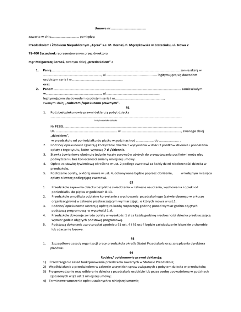 Umowa nr………………………………….. zawarta w dniu…………………………… pomiędzy: Przedszkolem i Żłobkiem Niepublicznym „Tęcza” s.c. M. Bernaś, P. Męczykowska w Szczecinku, ul. Nowa 2 78-400 Szczecinek reprezentowanym przez dyrektora mgr Małgorzatę Bernaś, zwanym dalej „przedszkolem” a 1. 2. Panią……………………………………………………………………………………………………………………………………….zamieszkałą w ……………………………………………………………, ul. ………………………………..................... legitymującą się dowodem osobistym seria i nr………………………………………………….., oraz Panem ……………………………………………………………………………………………………………………………………. zamieszkałym w…………………………………………………………, ul. …………………………………………………….. legitymującym się dowodem osobistym seria i nr…………………………………………………., zwanymi dalej „rodzicami/opiekunami prawnymi”. §1 1. Rodzice/opiekunowie prawni deklarują pobyt dziecka …………………………………………………………………………………………………………………………………………. imię i nazwisko dziecka 2. 3. 4. 5. 1. 2. 3. 4. 5. 1. 1) 2) 3) 4) Nr PESEL ………………………………………………………………………………………………………………………….. Ur. ………………………………………………………………. w …………………………………………………………….., zwanego dalej „dzieckiem”, w przedszkolu od poniedziałku do piątku w godzinach od ………………… do …………………… . Rodzice/ opiekunowie zgłaszają korzystanie dziecka z wyżywienia w ilości 3 posiłków dziennie i ponoszenia opłaty z tego tytułu, które wynoszą 7 zł /dziennie. Stawka żywieniowa obejmuje jedynie koszty surowców użytych do przygotowania posiłków i może ulec podwyższeniu bez konieczności zmiany niniejszej umowy. Opłata za stawkę żywieniową określona w ust. 2 podlega zwrotowi za każdy dzień nieobecności dziecka w przedszkolu. Rozliczenie opłaty, o której mowa w ust. 4, dokonywane będzie poprzez obniżenie, w kolejnym miesiącu opłaty o kwotę podlegającą zwrotowi. §2 Przedszkole zapewnia dziecku bezpłatne świadczenia w zakresie nauczania, wychowania i opieki od poniedziałku do piątku w godzinach 8-13. Przedszkole umożliwia odpłatne korzystanie z wychowania przedszkolnego (zatwierdzonego w arkuszu organizacyjnym) w zakresie przekraczającym wymiar zajęć, o których mowa w ust.1. Rodzice/ opiekunowie uiszczają opłatę za każdą rozpoczętą godzinę ponad wymiar godzin objętych podstawą programową w wysokości 1 zł. Przedszkole dokonuje zwrotu opłaty w wysokości 1 zł za każdą godzinę nieobecności dziecka przekraczającą wymiar godzin objętych podstawą programową. Podstawą dokonania zwrotu opłat zgodnie z §1 ust. 4 i §2 ust 4 będzie zaświadczenie lekarskie o chorobie lub zdarzenie losowe. §3 Szczegółowe zasady organizacji pracy przedszkola określa Statut Przedszkola oraz zarządzenia dyrektora placówki. §4 Rodzice/ opiekunowie prawni deklarują: Przestrzeganie zasad funkcjonowania przedszkola zawartych w Statucie Przedszkola; Współdziałanie z przedszkolem w zakresie wszystkich spraw związanych z pobytem dziecka w przedszkolu; Przyprowadzanie oraz odbieranie dziecka z przedszkola osobiście lub przez osobę upoważnioną w godzinach zgłoszonych w §1 ust.1 niniejszej umowy; Terminowe wnoszenie opłat ustalonych w niniejszej umowie; 5) Natychmiastowe zawiadomienie przedszkola w przypadku wystąpienia u dziecka choroby zakaźnej lub innej mogącej przenosić się na pozostałe dzieci korzystające z usług przedszkola; 6) Przyprowadzanie do przedszkola dziecka wyłącznie zdrowego. §5 1. Odpłatność za przedszkole uiszczana jest z góry w terminie do 15-go każdego miesiąca osobiście u Dyrektora przedszkola lub na konto bankowe nr 76 1240 3679 1111 0010 15 04 2555 z dopiskiem : nazwisko i imię dziecka oraz grupa do jakiej dziecko uczęszcza. 2. Termin płatności oznacza dzień wpływu należności. 3. Za zwłokę we wnoszeniu opłat naliczane są odsetki w ustawowej wysokości. §6 Przedszkole oferuje świadczenia w postaci wychowania przedszkolnego w ramach dyżuru wakacyjnego w miesiącu lipcu. §7 1. W przypadku 3-krotnego przekroczenia w ciągu miesiąca liczby zadeklarowanych godzin dziennego pobytu dziecka w przedszkolu, wymagane jest ponowne porozumienie stron w formie pisemnego aneksu. Brak zgody rodziców/ opiekunów prawnych na wprowadzenie zmiany porozumienia w powyższym zakresie skutkować będzie wygaśnięciem porozumienia bez konieczności jego odrębnego rozwiązania. Wygaśnięcie nastąpi w ostatnim dniu miesiąca następującego po miesiącu, w którym wystąpiła ostatnia rozbieżność. 2. W razie istotnych zmian czasu pobytu dziecka w przedszkolu dyrektor ma prawo do nie wyrażenia zgody na zmianę warunków umowy. §8 1. Strony mają prawo do rozwiązania niniejszej umowy wyłącznie w formie pisemnej na koniec miesiąca kalendarzowego z zachowaniem 1- miesięcznego okresu wypowiedzenia. 2. Dyrektor przedszkola ma prawo rozwiązać umowę z zachowaniem 1- miesięcznego okresu wypowiedzenia w przypadku zaistnienia przyczyn określonych w Statucie Przedszkola. 3. Umowa może zostać rozwiązana w każdym czasie za zgodną wolą stron. 4. Umowa wygasa, bez konieczności jej odrębnego rozwiązania, na skutek; 1) nie uiszczenia przez dwa kolejne miesiące należnych opłat. Wygaśniecie następuje ostatniego dnia drugiego miesiąca, za który nie uiszczono opłaty; 2) nieobecności