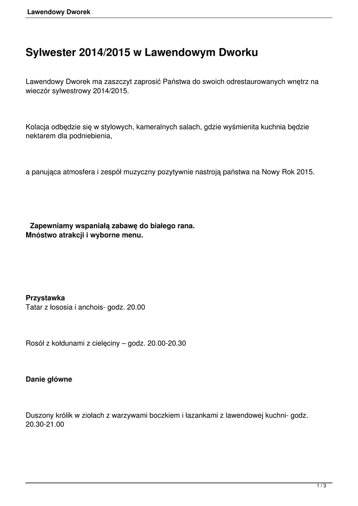 Lawendowy Dworek Sylwester 2014/2015 w Lawendowym Dworku Lawendowy Dworek ma zaszczyt zaprosić Państwa do swoich odrestaurowanych wnętrz na wieczór sylwestrowy 2014/2015. Kolacja odbędzie się w stylowych, kameralnych salach, gdzie wyśmienita kuchnia będzie nektarem dla podniebienia, a panująca atmosfera i zespół muzyczny pozytywnie nastroją państwa na Nowy Rok 2015. Zapewniamy wspaniałą zabawę do białego rana. Mnóstwo atrakcji i wyborne menu. Przystawka Tatar z łososia i anchois- godz. 20.00 Rosół z kołdunami z cielęciny – godz. 20.00-20.30 Danie główne Duszony królik w ziołach z warzywami boczkiem i łazankami z lawendowej kuchni- godz. 20.30-21.00 1/3 Lawendowy Dworek Dorsz z rusztu na zaprawie z fasoli, szczawiu i grzybów- godz. 21.00-22.00 Forszmak ala lawendowy dworek na chlebie z pieca- godz. 22.30-23.00 Deser Krem z białej czekolady z wiśnią, ciasta Zimna płyta Selekcje terrine z kaczki, golonki i królika mięsa pieczone wołowe i wieprzowe, owoce morza na zimno, śledź marynowany na sałatce z ziemniaków, pstrąg, że palce lizać na sałacie z fenylu, trzy sałatki z buraków, łososia i karczocha, tatar z tuńczyka, 2/3 Lawendowy Dworek carpaccio z wędzonej słoniny z kaparami, bażant z rusztu na winie grzanym, napoje zimne, gorące, ½ litra wódki Finlandia, szmpan o północy a PO PÓŁNOCY bigos z dziczyzny i śliwek wędzonych, barszcz z krokietem z gęsiną w cieście lawendowym. 390 zł/para Godzina rozpoczęcia: 20 Miejscowość: Lublin Ulica, numer: ul.Krochmalna 13 C Kod pocztowy: 20-950 e-mail: [email protected] www (z http://): lawendowy-dworek.com tel.: 691455320 tel. kom.: 691455320 3/3