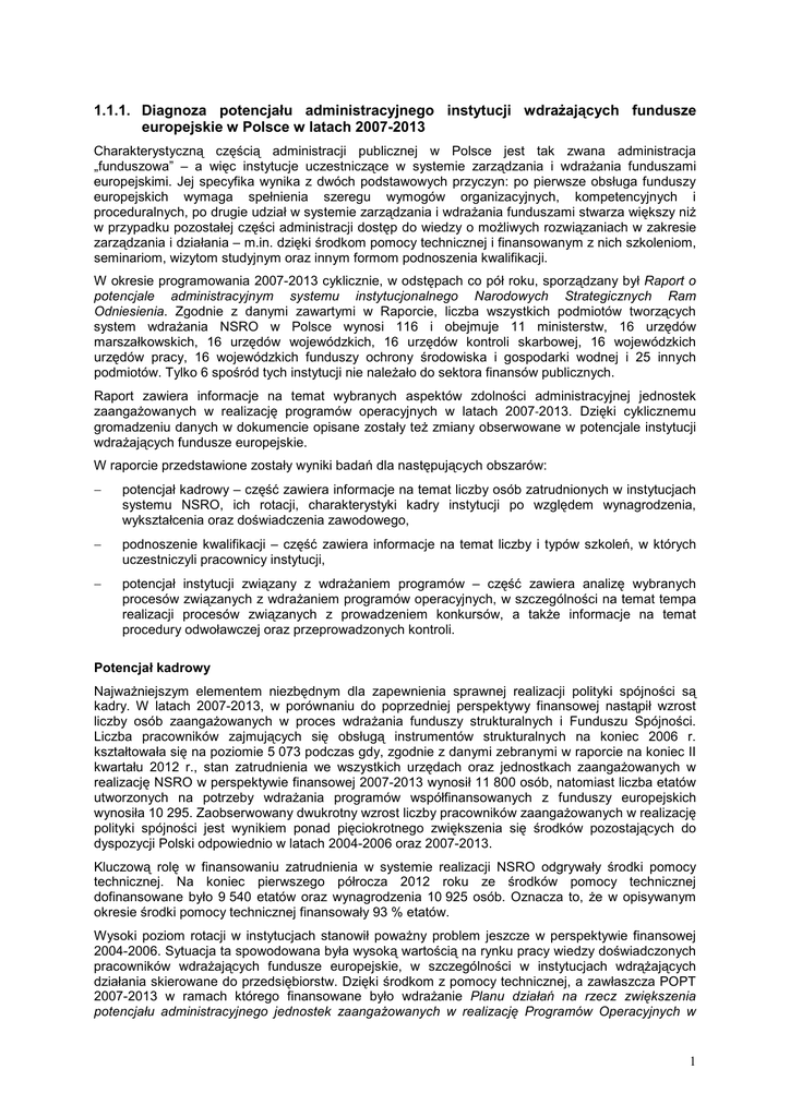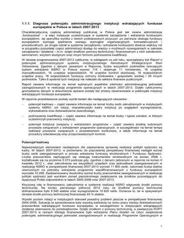 1.1.1. Diagnoza potencjału administracyjnego instytucji wdraŜających fundusze europejskie w Polsce w latach 2007-2013 Charakterystyczną częścią administracji publicznej w Polsce jest tak zwana administracja „funduszowa” – a więc instytucje uczestniczące w systemie zarządzania i wdraŜania funduszami europejskimi. Jej specyfika wynika z dwóch podstawowych przyczyn: po pierwsze obsługa funduszy europejskich wymaga spełnienia szeregu wymogów organizacyjnych, kompetencyjnych i proceduralnych, po drugie udział w systemie zarządzania i wdraŜania funduszami stwarza większy niŜ w przypadku pozostałej części administracji dostęp do wiedzy o moŜliwych rozwiązaniach w zakresie zarządzania i działania – m.in. dzięki środkom pomocy technicznej i finansowanym z nich szkoleniom, seminariom, wizytom studyjnym oraz innym formom podnoszenia kwalifikacji. W okresie programowania 2007-2013 cyklicznie, w odstępach co pół roku, sporządzany był Raport o potencjale administracyjnym systemu instytucjonalnego Narodowych Strategicznych Ram Odniesienia. Zgodnie z danymi zawartymi w Raporcie, liczba wszystkich podmiotów tworzących system wdraŜania NSRO w Polsce wynosi 116 i obejmuje 11 ministerstw, 16 urzędów marszałkowskich, 16 urzędów wojewódzkich, 16 urzędów kontroli skarbowej, 16 wojewódzkich urzędów pracy, 16 wojewódzkich funduszy ochrony środowiska i gospodarki wodnej i 25 innych podmiotów. Tylko 6 spośród tych instytucji nie naleŜało do sektora finansów publicznych. Raport zawiera informacje na temat wybranych aspektów zdolności administracyjnej jednostek zaangaŜowanych w realizację programów operacyjnych w latach 2007‐2013. Dzięki cyklicznemu gromadzeniu danych w dokumencie opisane zostały teŜ zmiany obserwowane w potencjale instytucji wdraŜających fundusze europejskie. W raporcie przedstawione zostały wyniki badań dla następujących obszarów: − potencjał kadrowy – część zawiera informacje na temat liczby osób zatrudnionych w instytucjach systemu NSRO, ich rotacji, charakterystyki kadry instytucji po względem wynagrodzenia, wykształcenia oraz doświadczenia zawodowego, − podnoszenie kwalifikacji – część zawiera informacje na temat liczby i typów szkoleń, w których uczestniczyli pracownicy instytucji, − potencjał instytucji związany z wdraŜaniem programów – część zawiera analizę wybranych procesów związanych z wdraŜaniem programów operacyjnych, w szczególności na temat tempa realizacji procesów związanych z prowadzeniem konkursów, a takŜe informacje na temat procedury odwoławczej oraz przeprowadzonych kontroli. Potencjał kadrowy NajwaŜniejszym elementem niezbędnym dla zapewnienia sprawnej realizacji polityki spójności są kadry. W latach 2007-2013, w porównaniu do poprzedniej perspektywy finansowej nastąpił wzrost liczby osób zaangaŜowanych w proces wdraŜania funduszy strukturalnych i Funduszu Spójności. Liczba pracowników zajmujących się obsługą instrumentów strukturalnych na koniec 2006 r. kształtowała się na poziomie 5 073 podczas gdy, zgodnie z danymi zebranymi w raporcie na koniec II kwartału 2012 r., stan zatrudnienia we wszystkich urzędach oraz jednostkach zaangaŜowanych w realizację NSRO w perspektywie finansowej 2007-2013 wynosił 11 800 osób, natomiast liczba etatów utworzonych na potrzeby wdraŜania programów współfinansowanych z funduszy europejskich wynosiła 10 295. Zaobserwowany dwukrotny wzrost liczby pracowników zaangaŜowanych w realizację polityki spójności jest wynikiem ponad pięciokrotnego zwiększenia się środków pozostających do dyspozycji Polski odpowiednio w latach 2004-2006 oraz 2007-2013. Kluczową rolę w finansowaniu zatrudnienia w systemie realizacji NSRO odgrywały środki pomocy technicznej. Na koniec pierwszego półrocza 2012 roku ze środków pomocy technicznej dofinansowane było 9 540 etatów oraz wynagrodzenia 10 925 osób. Oznacza to, Ŝe w opisywanym okresie środki pomocy technicznej finansowały 93 % etatów. Wysoki poziom rotacji w instytucjach stanowił powaŜny problem jeszcze w perspektywie finansowej 2004-2006. Sytuacja ta spowodowana była wysoką wartością na rynku pracy wiedzy doświadczonych pracowników wdraŜających fundusze europejskie, w szczególności w instytucjach wdrąŜających działania skierowane do przedsiębiorstw. Dzięki środkom z pomocy technicznej, a zawłaszcza POPT 2007-2013 w ramach którego finansowane było wdraŜanie Planu działań na rzecz zwiększenia potencjału administracyjnego jednostek zaangaŜowanych w realizację Programów Operacyjnych w 1 Polsce w latach 2007-2013 udało się podnieść i w miarę moŜliwości ujednolicić system wynagrodzeń w całym systemie wdraŜania NSRO, czego rezultatem było zmniejszenie się poziomu rotacji oraz zwiększenie zatrudnienia niezbędnego do sprawnego działania instytucji zaangaŜowanych w realizację funduszy europejskich. Potwierdzają to m.in. wyniki przeprowadzonego badania pt. Ocena stanu realizacji oraz efektów wdraŜania Działania 1.1 [w ramach, którego finansowany był system wynagrodzeń] Programu 1 Operacyjnego Pomoc Techniczna 2007-2013 . Wnioski z przytoczonego badania wskazują jednoznacznie, Ŝe niskie wynagrodzenia i brak moŜliwości rozwoju były głównymi przyczynami rotacji w instytucjach w początkowych okresie pracy przy wdraŜaniu funduszy. Ta negatywna sytuacja zmieniła się jednak na korzyść, w głównej mierze, jak pokazuje badanie, dzięki wsparciu z działania 1.1 POPT 2007-2013 i ujednoliceniu polityki płacowej. NaleŜy tutaj zauwaŜyć, Ŝe w samym tylko MRR stosunek pracowników odchodzących z pracy w ministerstwie do ogółu zatrudnionych w urzędzie kształtował się w 2006 r. na poziomie 12%. Spadek poziomu rotacji potwierdzają takŜe dane z Raportu o potencjale administracyjnym zgodnie z którym odsetek osób, które zaprzestały pracy w instytucjach NSRO w pierwszym półroc