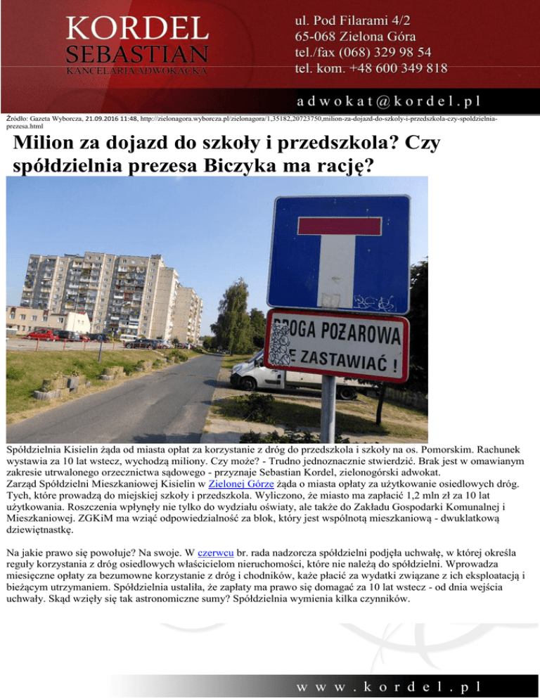Źródło: Gazeta Wyborcza, 21.09.2016 11:48, http://zielonagora.wyborcza.pl/zielonagora/1,35182,20723750,milion-za-dojazd-do-szkoly-i-przedszkola-czy-spoldzielniaprezesa.html Milion za dojazd do szkoły i przedszkola? Czy spółdzielnia prezesa Biczyka ma rację? Spółdzielnia Kisielin żąda od miasta opłat za korzystanie z dróg do przedszkola i szkoły na os. Pomorskim. Rachunek wystawia za 10 lat wstecz, wychodzą miliony. Czy może? - Trudno jednoznacznie stwierdzić. Brak jest w omawianym zakresie utrwalonego orzecznictwa sądowego - przyznaje Sebastian Kordel, zielonogórski adwokat. Zarząd Spółdzielni Mieszkaniowej Kisielin w Zielonej Górze żąda o miasta opłaty za użytkowanie osiedlowych dróg. Tych, które prowadzą do miejskiej szkoły i przedszkola. Wyliczono, że miasto ma zapłacić 1,2 mln zł za 10 lat użytkowania. Roszczenia wpłynęły nie tylko do wydziału oświaty, ale także do Zakładu Gospodarki Komunalnej i Mieszkaniowej. ZGKiM ma wziąć odpowiedzialność za blok, który jest wspólnotą mieszkaniową - dwuklatkową dziewiętnastkę. Na jakie prawo się powołuje? Na swoje. W czerwcu br. rada nadzorcza spółdzielni podjęła uchwałę, w której określa reguły korzystania z dróg osiedlowych właścicielom nieruchomości, które nie należą do spółdzielni. Wprowadza miesięczne opłaty za bezumowne korzystanie z dróg i chodników, każe płacić za wydatki związane z ich eksploatacją i bieżącym utrzymaniem. Spółdzielnia ustaliła, że zapłaty ma prawo się domagać za 10 lat wstecz - od dnia wejścia uchwały. Skąd wzięły się tak astronomiczne sumy? Spółdzielnia wymienia kilka czynników. Pierwszy to "koszty zarządzania infrastrukturą os. Pomorskiego i Śląskiego" (zieleń, drogi, chodniki, sieci). Składają się na nie wynagrodzenia pracowników spółdzielni - ponad 509 tys. zł, narzuty na wynagrodzenia, odpisy na fundusz socjalny - 97 tys. zł, podatki od nieruchomości - 46 tys. zł, artykuły biurowe - 55 tys. zł, przeglądy techniczne 8,7 tys. zł. I tak koszty administracyjne - w przeliczeniu na powierzchnię - wynoszą 57 gr za m kw. Do nich należy blisko 1,5 zł za m kw. kosztów eksploatacji (sprzątanie i odśnieżanie chodników, placów zabaw, konserwację sieci wodnych, kanalizacyjnych i energetycznych, do tego naprawy i koszty oświetlenia). Miasto odesłało faktury do spółdzielni. Prawnicy urzędu nie znaleźli podstaw, by płacić. Na razie urzędnicy nie doczekali się odpowiedzi, za to otrzymali wezwanie do natychmiastowej zapłaty i ostrzeżenie, że w przeciwnym razie sprawa zostanie zgłoszona do Krajowego Rejestru Długów. Kordel: Niejednoznaczna sprawa Maja Sałwacka: - Kto ma rację? Prawo spółdzielcze dotyczy tylko mieszkańców, uchwały spółdzielni nie są wiążące dla miasta? Sebastian Kordel, zielonogórski adwokat: - W mojej ocenie trudno jednoznacznie stwierdzić kto ma rację. Brak jest w omawianym zakresie utrwalonego orzecznictwa sądowego. Instytucja bezumownego korzystania, opiera się na założeniu, że właścicielowi przysługuje roszczenie o wynagrodzenie za korzystanie z jego rzeczy. Posiadacz jest zobowiązany do zapłaty wynagrodzenia za korzystanie z cudzej rzeczy bez względu na to, czy właściciel, nie korzystając z niej, poniósł jakąkolwiek stratę i niezależnie od tego, czy posiadacz faktycznie korzystał z rzeczy. Wynagrodzenie powinno być ustalane każdorazowo stosownie do okoliczności konkretnego przypadku z uwzględnieniem charakteru i trwałości obciążenia oraz jego uciążliwości. Powinno być proporcjonalne do stopnia ingerencji posiadacza w prawo własności, uwzględniać wartość nieruchomości oraz jej przeznaczenie i w takim kontekście oceniać spodziewane korzyści z uszczuplenia prawa własności. Przy założeniu braku uregulowań prawnych które określałyby sposób użytkowania mienia spółdzielni przez miasto, spółdzielnia w mojej ocenie co do zasady może domagać się od miasta wynagrodzenia za korzystanie z jej mienia. Jak powinna być wyliczona ewentualna opłata za użytkowanie drogi? Czy to nie przesada by włączać do niej pensję prezesa? Rozumiem koszty naprawy, odśnieżania, ale zarobki pracowników spółdzielni? - Miasto nie musi zgadzać się na stawki wynagrodzenia zawarte w uchwale spółdzielni. W przypadku fiaska negocjacji ze spółdzielnią, wysokość wynagrodzenia za bezumowne korzystanie określi biegły sądowy w ewentualnym sporze sądowym. Prawo może działać wstecz... a jednak rada nadzorcza mogła ustalić zaległą opłatę za 10 lat? - Przy założeniu że spółdzielnia może skutecznie prawnie domagać się wynagrodzenia za bezumowne korzystanie z jej mienia przez miasto, może także domagać się wynagrodzenia wstecz. Dyskusyjna pozostawałaby okoliczność, czy może domagać się wynagrodzenia za trzy lata wstecz czy za dziesięć. Czy może dojść do precedensu? Lawiny pozwanych samorządów przez spółdzielnie? - Sprawa nie jest jednoznaczna i ma charakter złożony. Ewentualne orzeczenie sądowe w szczególności na poziomie Sądu Najwyższego może doprowadzić do powstania precedensu prawnego który może dać asumpt do podjęcia podobnych kroków prawnych przez inne spółdzielnie na terenie kraju.