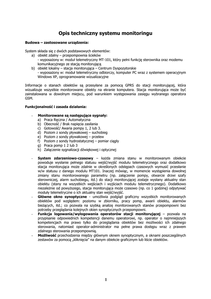 Opis techniczny systemu monitoringu Budowa – zastosowane urządzenia: System składa się z dwóch podstawowych elementów: a) obiekt zdalny – przepompownia ścieków - wyposażony w: moduł telemetryczny MT-101, który pełni funkcję sterownika oraz modemu komunikacyjnego ze stacją monitorującą b) obiekt lokalny – stacja monitorująca – Centrum Dyspozytorskie - wyposażony w: moduł telemetryczny odbiorczy, komputer PC wraz z systemem operacyjnym Windows XP, oprogramowanie wizualizacyjne Informacje o stanach obiektów są przesyłane za pomocą GPRS do stacji monitorującej, która wizualizuje wszystkie monitorowane obiekty na ekranie komputera. Stacja monitorująca może być zainstalowana w dowolnym miejscu, pod warunkiem występowania zasięgu wybranego operatora GSM. Funkcjonalność i zasada działania: - Monitorowane są następujące sygnały: a) Praca Ręczna / Automatyczna b) Obecność / Brak napięcia zasilania c) Gotowość/ Awaria pompy 1, 2 lub 3. d) Poziom z sondy pływakowej – suchobieg e) Poziom z sondy pływakowej – przelew f) Poziom z sondy hydrostatycznej – pomiar ciągły g) Praca pomp 1 2 lub 3 h) Załączenie sygnalizacji dźwiękowej i optycznej - System zdarzeniowo-czasowy – każda zmiana stanu w monitorowanym obiekcie powoduje wysłanie pełnego statusu wejść/wyjść modułu telemetrycznego oraz dodatkowo stacja monitorująca może zdalnie w określonych odstępach czasowych wymusić przesłanie w/w statusu z danego modułu MT101. Inaczej mówiąc, w momencie wystąpienia dowolnej zmiany stanu monitorowanego parametru (np. załączenie pompy, otwarcie drzwi szafy sterowniczej, alarm suchobiegu, itd.) do stacji monitorującej zostaje wysłany aktualny stan obiektu (stany na wszystkich wejściach i wyjściach modułu telemetrycznego). Dodatkowo niezależnie od powyższego, stacja monitorująca może czasowo (np. co 1 godzinę) odpytywać moduły telemetryczne o ich aktualny stan wejść/wyjść. Główne okno synoptyczne - umożliwia podgląd graficzny wszystkich monitorowanych obiektów pod względem: poziomu w zbiorniku, pracy pomp, awarii obiektu, alarmów bieżących, itd.; co pozwala na szybką analizę monitorowanych stanów przepompowni bez potrzeby przeglądania kolejnych okien synoptycznych przepompowni. Funkcja logowania/wylogowania operatorów stacji monitorującej – pozwala na przypisanie odpowiednich kompetencji danemu operatorowi, np. operator o najmniejszych kompetencjach ma prawo tylko do przeglądania obiektów bez możliwości ich zdalnego sterowania, natomiast operator-administrator ma pełne prawa dostępu wraz z prawem zdalnego sterowania przepompownią. Możliwość przechodzenia między głównym oknem synoptycznym, a oknami poszczególnych zestawów za pomocą „kliknięcia” na danym obiekcie graficznym lub liście obiektów. - - - 1 Główne okno synoptyczne wizualizujące monitorowane obiekty. - Funkcja alarmów historycznych – umożliwia przeglądanie archiwalnych zdarzeń alarmowych na wszystkich lub wybranym monitorowanym obiekcie za dowolny okres czasu wraz z funkcją filtrowania w/g danego stanu alarmowego. Dodatkowo posiadamy informację kiedy dany alarm został potwierdzony i przez jakiego operatora. W każdej chwili istnieje możliwość wykonania wydruku sporządzonego zestawienia. - Funkcja alarmów bieżących – wizualizuje w postaci tabeli wszystkie bieżące (niepotwierdzone) stany alarmowe z monitorowanych obiektów. W jednoznaczny sposób identyfikuje, czy dany alarm jest aktywny na obiekcie (kolor: czerwony-alarm krytyczny, żółtyalarm zwykły, fioletowy-alarm systemowy), czy już ustąpił (kolor: zielony). Po potwierdzeniu danego alarmu przez operatora zostaje on umieszczony w pamięci systemu i można go przeglądać za pomocą funkcji alarmów historycznych. Dodatkowo w momencie wystąpienia stanu alarmowego na dowolnej pompowni aktywuje się sygnał dźwiękowy, który można wyłączyć po potwierdzeniu wszystkich niepotwierdzonych alarmów bieżących, co powala na wykonywanie przez operatora innych czynności niezwiązanych ze stacją monitorującą, np. obsługa oczyszczalni. Baza danych - zapis wszystkich odebranych danych w bazie danych SQL wraz z narzędziem do jej przeglądania oraz eksportowania do pliku csv, który jest obsługiwany przez arkusz kalkulacyjny MSExel. Kontrola połączenia stacji monitorującej z monitowanymi pompowniami informowanie operatora o braku komunikacji z monitorowanym obiektem wraz z podaniem dokładnego czasu zerwania połączenia. Kontrola dostępu do monitorowanego obiektu – rozbrojenie/uzbrojenie obiektu za pomocą stacyjki (lokalnie) lub funkcji rozbrojenia/uzbrojenia (zdalnie ze stacji monitorującej). W momencie rozbrojenia obiektu nie są wysyłane z niego sygnały alarmowe – funkcja testowania obiektu bez przesyłania fałszywych informacji oraz dodatkowo pozwalająca na oszczędność w ilości wysłanych/odebranych danych GPRS – oszczędność w kosztach eksploatacji. Alarm włamania - wywołanie na stacji monitorującej alarmu włamania do obiektu następuje po określonym czasie od otwarcia szafy sterowniczej i nie rozbrojeniu obiektu. Alarm nie ulega skasowaniu po czasie. Wymaga zdalnego kasowania przez operatora, w ten sposób informując go o swoim wystąpieniu. - - - - - Funkcja zdalnego wyłączenia sygnalizacji alarmowej dźwiękowo-optycznej z poziomu stacji monitorującej. Funkcja odświeżenia obiektu – umożliwia na życzenie operatora przesłanie do stacji monitorującej aktualnego statusu wejść/wyjść modułu telemetrycznego danej przepompowni. Funkcja odświeżenia zegarów - umożliwia na życzenie operatora przesłanie do stacji 2 - - - - - - - monitorującej aktualnych danych odnośnie czasu pracy i ilości załączeń danej pompy. Informacje te są przechowywane lokalnie w pamięci modułu telemetrycznego, a nie w stacji monitorującej (zabezpieczenie przed utratą danych w momencie wyłączenia stacji). Funk