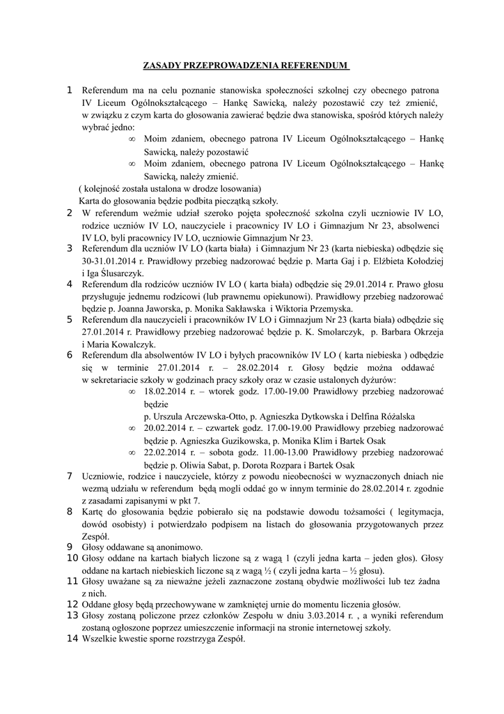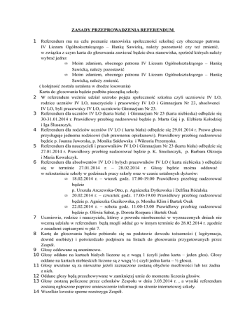 ZASADY PRZEPROWADZENIA REFERENDUM 1 Referendum ma na celu poznanie stanowiska społeczności szkolnej czy obecnego patrona IV Liceum Ogólnokształcącego – Hankę Sawicką, należy pozostawić czy też zmienić, w związku z czym karta do głosowania zawierać będzie dwa stanowiska, spośród których należy wybrać jedno: • Moim zdaniem, obecnego patrona IV Liceum Ogólnokształcącego – Hankę Sawicką, należy pozostawić • Moim zdaniem, obecnego patrona IV Liceum Ogólnokształcącego – Hankę Sawicką, należy zmienić. ( kolejność została ustalona w drodze losowania) Karta do głosowania będzie podbita pieczątką szkoły. 2 W referendum weźmie udział szeroko pojęta społeczność szkolna czyli uczniowie IV LO, rodzice uczniów IV LO, nauczyciele i pracownicy IV LO i Gimnazjum Nr 23, absolwenci IV LO, byli pracownicy IV LO, uczniowie Gimnazjum Nr 23. 3 Referendum dla uczniów IV LO (karta biała) i Gimnazjum Nr 23 (karta niebieska) odbędzie się 30-31.01.2014 r. Prawidłowy przebieg nadzorować będzie p. Marta Gaj i p. Elżbieta Kołodziej i Iga Ślusarczyk. 4 Referendum dla rodziców uczniów IV LO ( karta biała) odbędzie się 29.01.2014 r. Prawo głosu przysługuje jednemu rodzicowi (lub prawnemu opiekunowi). Prawidłowy przebieg nadzorować będzie p. Joanna Jaworska, p. Monika Sakławska i Wiktoria Przemyska. 5 Referendum dla nauczycieli i pracowników IV LO i Gimnazjum Nr 23 (karta biała) odbędzie się 27.01.2014 r. Prawidłowy przebieg nadzorować będzie p. K. Smolarczyk, p. Barbara Okrzeja i Maria Kowalczyk. 6 Referendum dla absolwentów IV LO i byłych pracowników IV LO ( karta niebieska ) odbędzie się w terminie 27.01.2014 r. – 28.02.2014 r. Głosy będzie można oddawać w sekretariacie szkoły w godzinach pracy szkoły oraz w czasie ustalonych dyżurów: • 18.02.2014 r. – wtorek godz. 17.00-19.00 Prawidłowy przebieg nadzorować będzie p. Urszula Arczewska-Otto, p. Agnieszka Dytkowska i Delfina Różalska • 20.02.2014 r. – czwartek godz. 17.00-19.00 Prawidłowy przebieg nadzorować będzie p. Agnieszka Guzikowska, p. Monika Klim i Bartek Osak • 22.02.2014 r. – sobota godz. 11.00-13.00 Prawidłowy przebieg nadzorować będzie p. Oliwia Sabat, p. Dorota Rozpara i Bartek Osak 7 Uczniowie, rodzice i nauczyciele, którzy z powodu nieobecności w wyznaczonych dniach nie wezmą udziału w referendum będą mogli oddać go w innym terminie do 28.02.2014 r. zgodnie z zasadami zapisanymi w pkt 7. 8 Kartę do głosowania będzie pobierało się na podstawie dowodu tożsamości ( legitymacja, dowód osobisty) i potwierdzało podpisem na listach do głosowania przygotowanych przez Zespół. 9 Głosy oddawane są anonimowo. 10 Głosy oddane na kartach białych liczone są z wagą 1 (czyli jedna karta – jeden głos). Głosy oddane na kartach niebieskich liczone są z wagą ½ ( czyli jedna karta – ½ głosu). 11 Głosy uważane są za nieważne jeżeli zaznaczone zostaną obydwie możliwości lub tez żadna z nich. 12 Oddane głosy będą przechowywane w zamkniętej urnie do momentu liczenia głosów. 13 Głosy zostaną policzone przez członków Zespołu w dniu 3.03.2014 r. , a wyniki referendum zostaną ogłoszone poprzez umieszczenie informacji na stronie internetowej szkoły. 14 Wszelkie kwestie sporne rozstrzyga Zespół.