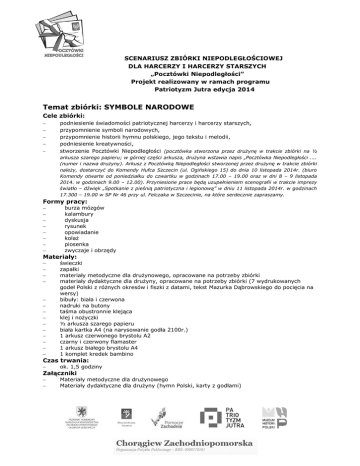 SCENARIUSZ ZBIÓRKI NIEPODLEGŁOŚCIOWEJ DLA HARCERZY I HARCERZY STARSZYCH „Pocztówki Niepodległości” Projekt realizowany w ramach programu Patriotyzm Jutra edycja 2014 Temat zbiórki: SYMBOLE NARODOWE Cele zbiórki: podniesienie świadomości patriotycznej harcerzy i harcerzy starszych, przypomnienie symboli narodowych, przypomnienie historii hymnu polskiego, jego tekstu i melodii, podniesienie kreatywności, stworzenie Pocztówki Niepodległości (pocztówka stworzona przez drużynę w trakcie zbiórki na ½ arkusza szarego papieru; w górnej części arkusza, drużyna wstawia napis „Pocztówka Niepodległości .... (numer i nazwa drużyny). Arkusz z Pocztówką Niepodległości stworzonej przez drużynę w trakcie zbiórki należy, dostarczyć do Komendy Hufca Szczecin (ul. Ogińskiego 15) do dnia 10 listopada 2014r. (biuro Komendy otwarte od poniedziałku do czwartku w godzinach 17.00 – 19.00 oraz w dni 8 – 9 listopada 2014. w godzinach 9.00 – 12.00). Przyniesione prace będą uzupełnieniem scenografii w trakcie imprezy światło – dźwięk „Spotkanie z pieśnią patriotyczna i legionową” w dniu 11 listopada 2014r. w godzinach 17.300 – 19.00 w SP Nr 46 przy ul. Felczaka w Szczecinie, na które serdecznie zapraszamy. Formy pracy: burza mózgów kalambury dyskusja rysunek opowiadanie kolaż piosenka zwyczaje i obrzędy Materiały: świeczki zapałki materiały metodyczne dla drużynowego, opracowane na potrzeby zbiórki materiały dydaktyczne dla drużyny, opracowane na potrzeby zbiórki (7 wydrukowanych godeł Polski z różnych okresów i fiszki z datami, tekst Mazurka Dąbrowskiego do pocięcia na wersy) bibuły: biała i czerwona nadruki na butony taśma obustronnie klejąca klej i nożyczki ½ arkusza szarego papieru biała kartka A4 (na narysowanie godła 2100r.) 1 arkusz czerwonego brystolu A2 czarny i czerwony flamaster 1 arkusz białego brystolu A4 1 komplet kredek bambino ok. 1,5 godziny Materiały metodyczne dla drużynowego Materiały dydaktyczne dla drużyny (hymn Polski, karty z godłami) Czas trwania: Załączniki Przebieg zbiórki L.p. I Zadanie POWITANIE w kręgu, wprowadzenie do tematyki zbiórki Wykonawca Drużynowy II OJCZYZNA 1) Zapisanie na arkuszu brystolu 5 rzeczowników, 5 przymiotników i 5 czasowników kojarzących się ze słowem „Ojczyzna” Co to jest „Ojczyzna” według uczestników zbiórki (burza mózgów z wykorzystaniem haseł z pkt II.1.), zdania/wyrażenia zapisywane na arkuszu brystolu, ze zdań /wyrażeń – stworzenie wspólnej definicji słowa „Ojczyzna”) KALAMBURY – 4 ochotników losuje po jednym haśle, które muszą pokazać bez słów: „orzeł biały”, „hymn państwowy”, „flaga biało – czerwona”, „tradycja narodowa”, SYMBOLE NARODOWE Wspólna dyskusja „co to są symbole narodowe i do czego służą” Drużynowy + drużyna Drużynowy + drużyna 2) III IV 1) 2) Polskie symbole narodowe Czas 2 minuty Materiały Świeczki i zapałki, materiały metodyczne dla drużynowego (I) Arkusz biały brystolu format A2, czerwony mazak Drużynowy + drużyna 10 minut Arkusz czerwony brystolu format A2, czarny mazak Ochotnicy z drużyny – prezentacja, drużyna odgaduje 8 minut Kartki z wypisanymi hasłami do pokazania Drużynowy + drużyna 10 minut Materiał metodyczny dla drużynowego (IV.1.) Materiał metodyczny dla drużynowego (IV.2.) Drużynowy + drużyna a. b. c. Godło (drużynowy opowiada w kilku słowach kiedy powstał pierwszy znak identyfikujący Państwo Polskie oraz jak znak ten ewoluował) Dopasuj datę do godła (zastęp / grupa otrzymuje 7 obrazków z godłem Polski z różnych okresów, kredki oraz osiem fiszek z datami; należy dopasować daty do obrazków. Jedna z fiszek nosi datę 2100 – do niej należy biała kartka, na której zastęp / grupa ma narysować godło Polski z 2100 roku. Wszystkie godła z dopasowanymi datami należy nakleić na ½ arkusza szarego papieru Hymn (drużynowy opowiada w kilku słowach historię hymnu i przedstawia postać Józefa Wybickiego Układanie hymnu z pojedynczych wersów, po zakończeniu sprawdzenie i ewentualne skorygowanie Drużynowy 2 minuty Materiał metodyczny dla drużynowego (IV.2.a.) Drużyna 18 minut 7 wydrukowanych godeł Polski z różnych okresów i jedna biała kartka, 8 fiszek z datami i opisami w/w godeł, kredki, klej, ½ arkusza szarego papieru Drużynowy 2 minuty Drużyna 8 minut Materiał metodyczny dla drużynowego (IV.2.b.) Tekst Mazurka Dąbrowskiego pocięty na wersy (dla ułatwienia pierwsze wersy danej zwrotki noszą jej numer) Odśpiewanie hymnu w drużynie (np. każdy zastęp jedną zwrotkę, jedną zwrotkę wszyscy razem) fakultatywnie Barwy narodowe – „Dlaczego biało – czerwona?” – dyskusja w drużynie Drużynowy + drużyna 2 minuty Krótka historia flagi biało czerwonej Drużynowy 6 minut 2 minuty Materiał metodyczny dla drużynowego (IV.2.c.) Materiał metodyczny dla drużynowego (IV.2.c.) d. V Robienie kotylionów (40 - 50 sztuk) Drużynowy + drużyna 15 minut Sporządzenie szarej pocztówki - na arkuszu szarego papieru należy zrobić kolaż składający się z definicji słowa „Ojczyzna” stworzonego przez drużynę, godeł Polski z minionych okresów i obecnie obowiązującego, godła Polski z 2100r. narysowanego przez drużynę, wyklejonego hymnu Polski oraz zapisanych na arkuszu brystolu 5 rzeczowników, 5 przymiotników i 5 czasowników jakie kojarzą się ze słowem „Ojczyzna” ZAKOŃCZENIE ZBIÓRKI Drużynowy + drużyna 10 minut Opracowała: Anna Piasecka – Grzegorek Poczta Harcerska Szczecin II Hufiec Szczecin 5 minut Bibuła biała i czerwona, klej, nożyczki, znak graficzny (buton) ½ arkusza (w/w) szarego papieru, klej, materiały wykorzystane w poprzednich punktach scenariusza Materiał metodyczny dla drużynowego (V.)