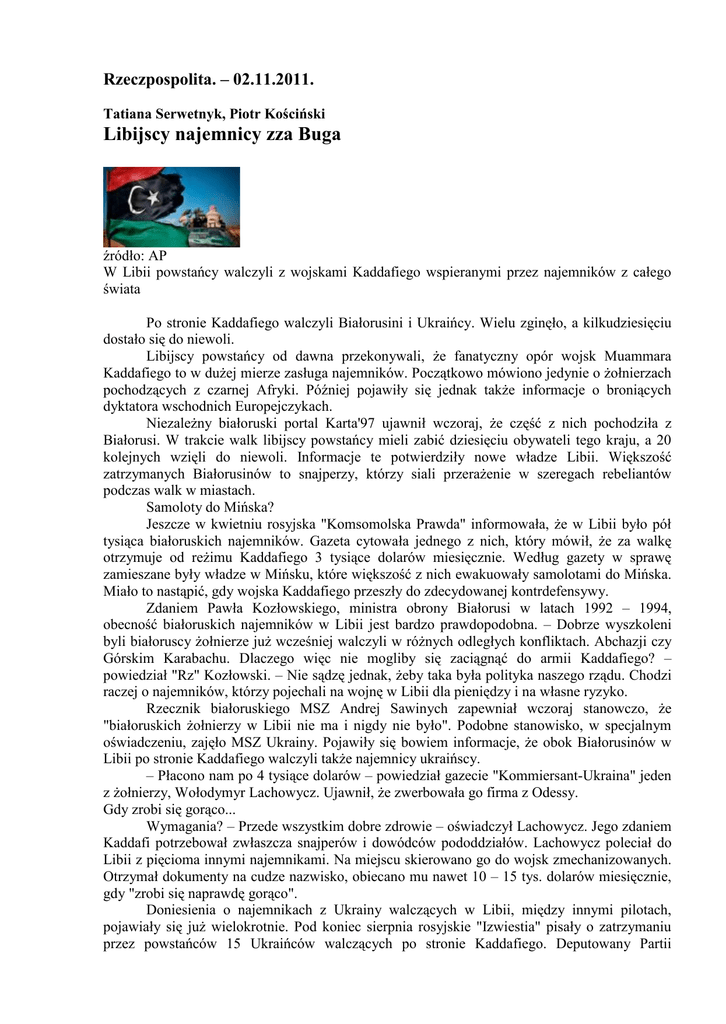 Rzeczpospolita. – 02.11.2011. Tatiana Serwetnyk, Piotr Kościński Libijscy najemnicy zza Buga źródło: AP W Libii powstańcy walczyli z wojskami Kaddafiego wspieranymi przez najemników z całego świata Po stronie Kaddafiego walczyli Białorusini i Ukraińcy. Wielu zginęło, a kilkudziesięciu dostało się do niewoli. Libijscy powstańcy od dawna przekonywali, że fanatyczny opór wojsk Muammara Kaddafiego to w dużej mierze zasługa najemników. Początkowo mówiono jedynie o żołnierzach pochodzących z czarnej Afryki. Później pojawiły się jednak także informacje o broniących dyktatora wschodnich Europejczykach. Niezależny białoruski portal Karta'97 ujawnił wczoraj, że część z nich pochodziła z Białorusi. W trakcie walk libijscy powstańcy mieli zabić dziesięciu obywateli tego kraju, a 20 kolejnych wzięli do niewoli. Informacje te potwierdziły nowe władze Libii. Większość zatrzymanych Białorusinów to snajperzy, którzy siali przerażenie w szeregach rebeliantów podczas walk w miastach. Samoloty do Mińska? Jeszcze w kwietniu rosyjska "Komsomolska Prawda" informowała, że w Libii było pół tysiąca białoruskich najemników. Gazeta cytowała jednego z nich, który mówił, że za walkę otrzymuje od reżimu Kaddafiego 3 tysiące dolarów miesięcznie. Według gazety w sprawę zamieszane były władze w Mińsku, które większość z nich ewakuowały samolotami do Mińska. Miało to nastąpić, gdy wojska Kaddafiego przeszły do zdecydowanej kontrdefensywy. Zdaniem Pawła Kozłowskiego, ministra obrony Białorusi w latach 1992 – 1994, obecność białoruskich najemników w Libii jest bardzo prawdopodobna. – Dobrze wyszkoleni byli białoruscy żołnierze już wcześniej walczyli w różnych odległych konfliktach. Abchazji czy Górskim Karabachu. Dlaczego więc nie mogliby się zaciągnąć do armii Kaddafiego? – powiedział "Rz" Kozłowski. – Nie sądzę jednak, żeby taka była polityka naszego rządu. Chodzi raczej o najemników, którzy pojechali na wojnę w Libii dla pieniędzy i na własne ryzyko. Rzecznik białoruskiego MSZ Andrej Sawinych zapewniał wczoraj stanowczo, że "białoruskich żołnierzy w Libii nie ma i nigdy nie było". Podobne stanowisko, w specjalnym oświadczeniu, zajęło MSZ Ukrainy. Pojawiły się bowiem informacje, że obok Białorusinów w Libii po stronie Kaddafiego walczyli także najemnicy ukraińscy. – Płacono nam po 4 tysiące dolarów – powiedział gazecie "Kommiersant-Ukraina" jeden z żołnierzy, Wołodymyr Lachowycz. Ujawnił, że zwerbowała go firma z Odessy. Gdy zrobi się gorąco... Wymagania? – Przede wszystkim dobre zdrowie – oświadczył Lachowycz. Jego zdaniem Kaddafi potrzebował zwłaszcza snajperów i dowódców pododdziałów. Lachowycz poleciał do Libii z pięcioma innymi najemnikami. Na miejscu skierowano go do wojsk zmechanizowanych. Otrzymał dokumenty na cudze nazwisko, obiecano mu nawet 10 – 15 tys. dolarów miesięcznie, gdy "zrobi się naprawdę gorąco". Doniesienia o najemnikach z Ukrainy walczących w Libii, między innymi pilotach, pojawiały się już wielokrotnie. Pod koniec sierpnia rosyjskie "Izwiestia" pisały o zatrzymaniu przez powstańców 15 Ukraińców walczących po stronie Kaddafiego. Deputowany Partii Regionów Walerij Konowaliuk mówił wówczas, że sprawa zostanie bardzo dokładnie zbadana. Przypomniał, że byłych ukraińskich żołnierzy w 2008 roku werbowała Gruzja, która toczyła wówczas wojnę z Rosją. Kolesnikow twierdził, że po redukcjach w ukraińskiej armii sytuacja niektórych żołnierzy jest tak trudna, że są zmuszeni "handlować na bazarach". Właśnie dramatyczny brak pieniędzy ma skłaniać ich do walki w dalekich konfliktach. – Ukraińscy najemnicy na pewno służyli za granicą, choć trudno powiedzieć gdzie i ilu konkretnie – powiedział "Rz" Wadym Hreczaninow, doradca ds. bezpieczeństwa byłego prezydenta Leonida Kuczmy. – Naszym byłym żołnierzom się nie przelewa, a Kaddafi zapewniał bardzo dobre warunki. Informacje o ukraińskich najemnikach spowodowały, że libijscy powstańcy aresztowali na początku września 23 Ukraińców, głównie kucharzy i pracowników sektora naftowego. – Tych doniesień było bardzo dużo. Tak dużo, że interesy Białorusi i Ukrainy w Libii mogą w rezultacie poważnie ucierpieć – mówił "Rz" polski dyplomata pracujący w Libii. Misja okrzyknięta sukcesem W poniedziałek o 23.59 NATO oficjalnie zakończyło swoją misję w Libii. – Podjęliśmy działania, aby was chronić. Razem nam się udało. Libia jest w końcu wolna – mówił w Trypolisie sekretarz generalny NATO Anders Fogh Rasmussen. Misja była prowadzona na podstawie rezolucji ONZ wzywającej do ochrony ludności cywilnej przed atakami ze strony wojsk Muammara Kaddafiego. Mandat nie zezwalał na wysłanie do Libii wojsk lądowych. Wprowadzono jednak strefę zakazu lotów i zaczęto ataki na centra dowodzenia reżimu, składy amunicji i ciężki sprzęt. W ciągu siedmiu miesięcy przeprowadzono 26 tysięcy misji, w tym prawie 10 tys. nalotów. Tymczasowe władze libijskie zaapelowały do sojuszu o przedłużenie misji do końca roku, ale NATO uznało, że cel został już zrealizowany. Rasmussen nie wyklucza jednak dalszej pomocy dla Libii. Chociaż wojna się zakończyła, sytuacja w kraju jest wciąż napięta. Rozmaite oddziały powstańców nie składają broni, licząc się z wybuchem kolejnego konfliktu. Wspólnotę międzynarodową niepokoją ogromne ilości broni w Libii. Rada Bezpieczeństwa ONZ jednogłośnie przyjęła rezolucję wzywającą libijskie władze do odzyskania ręcznych wyrzutni rakiet, które mogą służyć do strącania samolotów pasażerskich. Tymczasowe władze libijskie zgodnie z obietnicą wraz z zakończeniem konfliktu dokonały zmiany na stanowisku premiera. Nowym szefem przejściowego rządu został mało znany inżynier Abdul Raheem al-Keeb, który pomagał finansować rebelię
