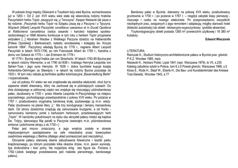W połowie drogi między Gliwicami a Toszkiem leży wieś Bycina, wzmiankowana już w 1263 r. Od 2. poł. XVII wieku wieś stała się własnością rodziny hrabiów Paczyńskich herbu Topór, piszących się „z Tenczyna”. Kasper Niesiecki tak pisze o tej rodzinie: „Paczyński herbu Topór na Szląsku piszą się z Paczyna i z Tęczyna. Wojciech [Albert] Leopold Paczyński consilliarus caesareus et in Ducati Opoliensi at Ratiboriensi cancellarius (radca cesarski i kanclerz księstwa opolskoraciborskiego) w 1698 któremu konkluzye w tym roku z herbem Topór przypisane widziałem [...] Abraham Wacław z Wielkiego Paczyna dziedzic na Halbendorfie [Półwsi Opolskiej] i Bierkowicach, katedry wrocławskiej i kolegiaty św. Krzyża kanonik 1664”. Paczyńscy władają Byciną do 1778 r., najpierw Albert Leopold Paczyński w latach 1670-1706, po nim Franciszek Albert do 1750 r., Karolina z domu von Sobeck do 1770 r. i Jan Erdmann do 1778 r. W 1779 r. Bycinę nabył hrabia Jan von Strachwitz. W latach 1783-85 Bycina jest w rękach rodziny Wernerów, a od 1790 do1838 r. hrabiego Henryka Leopolda von Seherr-Toss i jego syna Henryka. W 1838 r. dobra bycińskie kupuje książę Hohenlohe-Oehringen ze Sławięcic i w rękach tej rodziny Bycina pozostaje do 1933 r. W tym roku nabyła ją berlińska spółka kolonizacyjna „Bauersiedlung Berlin” i rozparcelowała. Już od połowy XV wieku we wsi znajdowała się siedziba właścicieli, choć był to zapewne obiekt drewniany, który nie zachował się w późniejszych czasach. Do dnia dzisiejszego w północnej części wsi znajduje się niszczejący późnobarokowy pałac, zbudowany w 1700 r. przez Alberta Leopolda hr.Paczyńskiego na miejscu poprzedniego, pochodzącego prawdopodobnie z połowy XVII wieku. Po pożarze w 1767 r. przebudowano oryginalną barokową bryłę, pozbawiając ją m.in. wieży. Pałac zbudowano na planie litery „L”. Ma trzy kondygnacje i łamany mansardowy dach. Od strony dziedzińca znajdują się zamurowane krużganki, a od frontu zamurowany kamienny portal z kartuszem herbowym, przedstawiającym herb „Topór”. W narożniku południowym na styku obu skrzydeł pałacu mieści się kaplica Św. Trójcy, stanowiąca filię parafii w Paczynie (wewnątrz m.in. późnobarokowa ambona i polichromie stropu z ok.1730 r.) Pałac jest mocno zniszczony, a jego wnętrza zostały w okresie międzywojennym zaadaptowane na cele mieszkalne przez towarzystwo osadnictwa wiejskiego z Berlina (dlatego układ pomieszczeń jest nieczytelny). Otoczenie pałacu stanowią dawne zabudowania folwarczne i resztki parku krajobrazowego, po którym pozostało kilka okazów drzew, m.in. jesion wyniosły, lipa drobnolistna i klon polny. Na rozjeździe dróg stoi figura św. Floriana z 1782 r.(obok świętego przedstawiona jest makieta pierwotnego, barokowego pałacu). Barokowy pałac w Bycinie, datowany na połowę XVII wieku, przebudowany gruntownie w 1700 r. i po pożarze w 1767 r. – niegdyś zabytek klasy pierwszej niszczeje i czeka na nowego właściciela. Po przeprowadzeniu wszystkich niezbędnych prac, związanych z jego remontem i adaptacją, mógłby stanowić hotel (bliskość autostrady) lub obiekt rekreacyjno-wypoczynkowy (pobliże akwenów). Trzykondygnacyjny obiekt posiada 1260 m2 powierzchni użytkowej i 16 380 m3 kubatury. Edward Wieczorek LITERATURA: Rainczak K., Studium historyczno-architektoniczne pałacu w Bycinie pow. gliwicki. P.K.Z. Wrocław 1965, mpis Niesiecki K., Herbarz Polski. Lipsk 1841 (repr. Warszawa 1979), to VII, s.235 Katalog zabytków sztuki w Polsce, tom 6 z.5 Powiat gliwicki, Warszawa 1966, s.5 Kloss E., Rode H., Stepf W., Eberle H., Die Bau- und Kunstdenkmäler des Kreises Tost-Gleiwitz. Wrocław 1943, s.77 XXXV WARSZTATY PRZEWODNICKIE ZAMKI I PAŁACE ZIEMI GLIWICKIEJ BYCINA