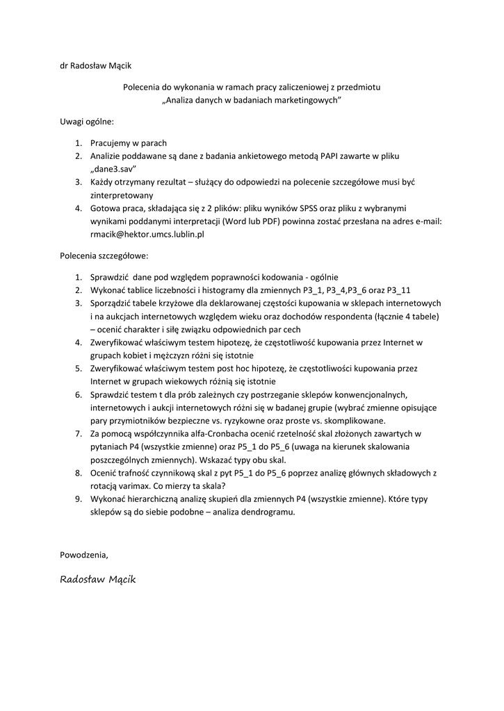 dr Radosław Mącik Polecenia do wykonania w ramach pracy zaliczeniowej z przedmiotu „Analiza danych w badaniach marketingowych” Uwagi ogólne: 1. Pracujemy w parach 2. Analizie poddawane są dane z badania ankietowego metodą PAPI zawarte w pliku „dane3.sav” 3. Każdy otrzymany rezultat – służący do odpowiedzi na polecenie szczegółowe musi byd zinterpretowany 4. Gotowa praca, składająca się z 2 plików: pliku wyników SPSS oraz pliku z wybranymi wynikami poddanymi interpretacji (Word lub PDF) powinna zostad przesłana na adres e-mail: [email protected] Polecenia szczegółowe: 1. Sprawdzid dane pod względem poprawności kodowania - ogólnie 2. Wykonad tablice liczebności i histogramy dla zmiennych P3_1, P3_4,P3_6 oraz P3_11 3. Sporządzid tabele krzyżowe dla deklarowanej częstości kupowania w sklepach internetowych i na aukcjach internetowych względem wieku oraz dochodów respondenta (łącznie 4 tabele) – ocenid charakter i siłę związku odpowiednich par cech 4. Zweryfikowad właściwym testem hipotezę, że częstotliwośd kupowania przez Internet w grupach kobiet i mężczyzn różni się istotnie 5. Zweryfikowad właściwym testem post hoc hipotezę, że częstotliwości kupowania przez Internet w grupach wiekowych różnią się istotnie 6. Sprawdzid testem t dla prób zależnych czy postrzeganie sklepów konwencjonalnych, internetowych i aukcji internetowych różni się w badanej grupie (wybrad zmienne opisujące pary przymiotników bezpieczne vs. ryzykowne oraz proste vs. skomplikowane. 7. Za pomocą współczynnika alfa-Cronbacha ocenid rzetelnośd skal złożonych zawartych w pytaniach P4 (wszystkie zmienne) oraz P5_1 do P5_6 (uwaga na kierunek skalowania poszczególnych zmiennych). Wskazad typy obu skal. 8. Ocenid trafnośd czynnikową skal z pyt P5_1 do P5_6 poprzez analizę głównych składowych z rotacją varimax. Co mierzy ta skala? 9. Wykonad hierarchiczną analizę skupieo dla zmiennych P4 (wszystkie zmienne). Które typy sklepów są do siebie podobne – analiza dendrogramu. Powodzenia, Radosław Mącik