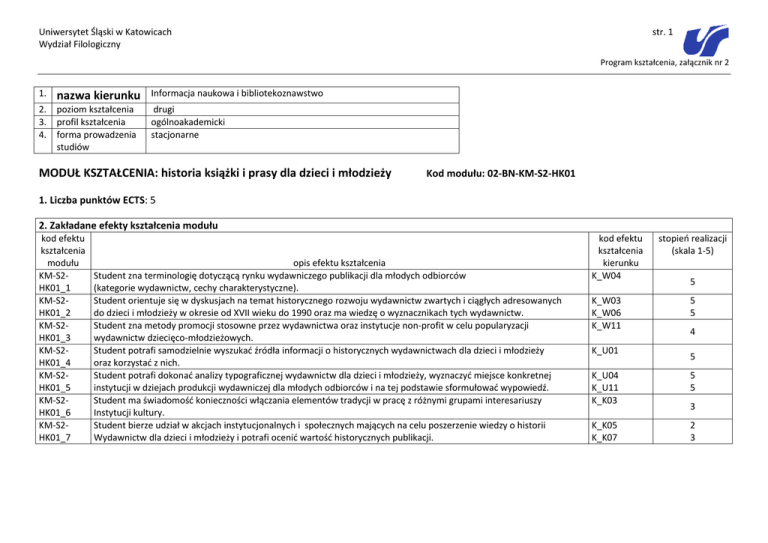 Uniwersytet Śląski w Katowicach Wydział Filologiczny str. 1 Program kształcenia, załącznik nr 2 1. nazwa kierunku Informacja naukowa i bibliotekoznawstwo 2. 3. 4. poziom kształcenia profil kształcenia forma prowadzenia studiów drugi ogólnoakademicki stacjonarne MODUŁ KSZTAŁCENIA: historia książki i prasy dla dzieci i młodzieży Kod modułu: 02-BN-KM-S2-HK01 1. Liczba punktów ECTS: 5 2. Zakładane efekty kształcenia modułu kod efektu kształcenia modułu KM-S2HK01_1 KM-S2HK01_2 KM-S2HK01_3 KM-S2HK01_4 KM-S2HK01_5 KM-S2HK01_6 KM-S2HK01_7 opis efektu kształcenia Student zna terminologię dotyczącą rynku wydawniczego publikacji dla młodych odbiorców (kategorie wydawnictw, cechy charakterystyczne). Student orientuje się w dyskusjach na temat historycznego rozwoju wydawnictw zwartych i ciągłych adresowanych do dzieci i młodzieży w okresie od XVII wieku do 1990 oraz ma wiedzę o wyznacznikach tych wydawnictw. Student zna metody promocji stosowne przez wydawnictwa oraz instytucje non-profit w celu popularyzacji wydawnictw dziecięco-młodzieżowych. Student potrafi samodzielnie wyszukać źródła informacji o historycznych wydawnictwach dla dzieci i młodzieży oraz korzystać z nich. Student potrafi dokonać analizy typograficznej wydawnictw dla dzieci i młodzieży, wyznaczyć miejsce konkretnej instytucji w dziejach produkcji wydawniczej dla młodych odbiorców i na tej podstawie sformułować wypowiedź. Student ma świadomość konieczności włączania elementów tradycji w pracę z różnymi grupami interesariuszy Instytucji kultury. Student bierze udział w akcjach instytucjonalnych i społecznych mających na celu poszerzenie wiedzy o historii Wydawnictw dla dzieci i młodzieży i potrafi ocenić wartość historycznych publikacji. kod efektu kształcenia kierunku K_W04 K_W03 K_W06 K_W11 K_U01 stopień realizacji (skala 1-5) 5 5 5 4 5 K_U04 K_U11 K_K03 5 5 K_K05 K_K07 2 3 3 Uniwersytet Śląski w Katowicach Wydział Filologiczny str. 2 Program kształcenia, załącznik nr 2 3. Opis modułu Opis Wymagania wstępne modułu Celem modułu jest przekazanie wiedzy z zakresu historii wydawnictw dla młodych odbiorców, ich typologii i cech charakterystycznych. Informacje teoretyczne, przekazane na wykładzie, mają ułatwić dokonywanie kategoryzacji wydawnictw dziecięco-młodzieżowych i ich ocenę. W efekcie student winien także być świadomy ciągłości procesów zachodzących w kształtowaniu się odrębnych cech wydawniczych książki i czasopism adresowanych do młodych odbiorców. Posiadanie stopnia licencjata. 4. Sposoby weryfikacji efektów kształcenia modułu Kod KM-S2HK01_w_1 nazwa (typ) sposobu weryfikacji Egzamin opis szczegółowy efekt(-y) kształcenia modułu Egzamin sprawdzający efekty z zakresu wiedzy oraz częściowo umiejętności KM-S2-HK01_1, KM-S2-HK01_2, KM-S2i kompetencji społecznych HK01_3, KM-S2-HK01_4, KM-S2-HK01_5, KM-S2-HK01_6, KM-S2-HK01_7 5.a Formy prowadzenia zajęć (studia prowadzone w formie stacjonarnej) nazwa KM-S2HK01_fs_1 Wykład forma prowadzenia zajęć opis (z uwzględnieniem metod dydaktycznych) Metoda podająca (wykład informujący, objaśnienie, wyjaśnienie) Metoda problemowa (wykład problemowy, wykład konwersatoryjny; dyskusja aktywizująca) liczba godzin 30 suma godzin: 30 Specjalizacja nie jest ujęta w programie studiów niestacjonarnych. praca własna studenta opis liczba godzin 120 Lektura uzupełniająca zgodnie z zaleceniami prowadzącego. Powtórzenie i ugruntowanie informacji przekazanych podczas wykładów. Udział czynny lub bierny w akcjach mających na celu popularyzację historycznych wydawnictw dla dzieci i młodzieży (np. wystawy) suma godzin: 120 sposób weryfikacji efektów kształcenia KM-S2-HK01_w_1 punkty ECTS 5 suma punktów: 5 Uniwersytet Śląski w Katowicach Wydział Filologiczny str. 3 Program kształcenia, załącznik nr 2 5.b Formy prowadzenia zajęć (studia prowadzone w formie niestacjonarnej) nazwa forma prowadzenia zajęć opis (z uwzględnieniem metod dydaktycznych) liczba godzin praca własna studenta opis liczba godzin sposób weryfikacji efektów kształcenia kod m_fns_1 kod m_fns_2 kod m_fns_3 kod m_fns_4 suma godzin: suma godzin: suma punktów: punkty ECTS