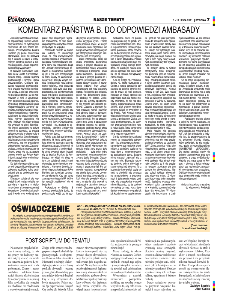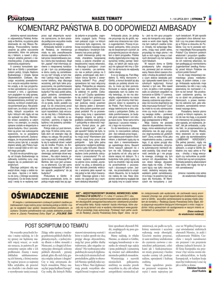 NASZE TEMATY 1 - 14 LIPCA 2011 | STRONA 7 KOMENTARZ PAŃSTWA B. DO ODPOWIEDZI AMBASADY Jesteśmy wprost zaszokowani odpowiedzią Polskiej Ambasady w Berlinie, na pytania jakie skierowała do niej Wasza Redakcja. Przeczytaliśmy bardzo uważnie jej pełne oszczerstw stanowisko, które nie pokrywa się z faktami, a nawet z otrzymanym ostatnio pismem z niemieckiej policji. Z całą odpowiedzialnością wyjaśniamy: 9 czerwca konsulowie spotkali sie w Görlitz z przedstawicielami policji, Urzędu Nadzoru Budowlanego i Urzędu Spraw Obywatelskich. Ciekawe, dlaczego wcześniej powiadomiono o wizycie wszystkie niemieckie urzędy, a do nas przyjechano bez uprzedzenia i już po rozmowach z nimi, z ugruntowanym poglądem na całą sprawę. Dyplomaci przeprowadzili u nas niezapowiedzianą „kontrolę” podwórza, na którym znaleźli jedynie poniemiecki gruz. Nie powiedzieli nam, że chodzi o jakieś fekalia, których oczywiście nie było i których nikt nigdy od nas nie wylewał na ulicę. Niemieckie śmieci zastaliśmy w całym domu i na zewnątrz, co zresztą opisane zostało w ekspertyzie o stanie budynku. Gruz i pozostałości są przez nas sukcesywnie wywożone, na co posiadamy odpowiednie rachunki. Zastanawiające, że nie przeszkadzało to nikomu przez tyle lat, a zaczęło dopiero wtedy, gdy Polacy kupili dom i zaczęli robić w nim i wokół niego porządki. Do dziś nie otrzymaliśmy zgody od Urzędu Budowlanego na całkowitą rozbiórkę ruiny znajdującej się za podwórzem wewnętrznym. Dlaczego policjanci siłą wyważyli drzwi, mając u siebie nasze dane - łącznie z nr telefonu do żony, z którego wcześniej korzystano. Co do braku kanalizacji i wody to w wydanej nam przez sąd ekspertyzie wyraźnie zaznaczono, że dom posiada podłączone wszystkie media (ekspertyza do wglądu). Ambasada twierdzi w piśmie do Redakcji, że interwencja miała na celu zweryfikowanie donosu sąsiada o wylewaniu fekali przez niezameldowane osoby z domu bez kanalizacji. Skąd ten „sąsiad” miał informację zarówno o niesprawnej kanalizacji jak i tym czy przebywające w domu osoby są zameldowane czy nie? Urzędy, w tym również i policja mają nasz adres i numer telefonu, więc dlaczego wcześniej, jeśli było takie przypuszczenie, nie poinformowano nas o tym fakcie, jako właścicieli budynku? Na nasz polski adres, gdzie jesteśmy zameldowani, przychodzi cała korespondencja z Niemiec, łącznie z opłatami za wodę, ścieki, podatki czy prąd. Co do zniszczonej przez policję skrzynki pocztowej, z naszym nazwiskiem, były wrzucane do niej listy z Ordunksamtu, czy policji - np. mandat za samochód, - pomimo, iż nigdy nie byliśmy i nie jesteśmy zameldowani w tym domu. Policja stała już pod domem, gdy moja 16 letnia córka zamykała dom od zewnątrz idąc do sklepu na zakupy. Nie prosili jej czy mogą wejść, a kiedy oddaliła się to wyłamali drzwi i wdarli się do środka. Przykre, że Ambasada nie widzi nic złego w tym, że policjanci „weszli sami otwierając zamknięte drzwi wejściowe „. Na całym świecie, jedynie nie przez Ambasadę RP w Berlinie, taki czyn jest uznawany za włamanie. Czy tak samo zareaguje Ambasada RP jeśli w ten sposób „wejdziemy” do jej budynku? Prokuratura w Görlitz 8 czerwca powiedziała żonie, że policja mogła wejść bez jej zgo- OŚWIADCZENIE W związku z zainteresowaniem czołowych polskich mediów potraktowaniem mojej rodziny przez niemiecką policję w Görlitz i mając na względzie nasz spokój i bezpieczeństwo oświadczam, że szykany i brutalne potraktowanie nas zostały dokładnie przedstawione w „Gazety Powiatowej Dolny Śląsk” pt. „POLSKIE ŚWI- dy jedynie w przypadku zagrożenia czyjegoś życia. Proszę nam pokazać czyje i w którym momencie było zagrożone, nie licząc oczywiście naszego życia po wtargnięciu i brutalnym traktowaniu nas przez policję! Jeżeli interwencja policji nie miała charakteru bezprawnej rewizji, a jedynie charakter zabezpieczenia naszej własności, to dlaczego 3 policjanci - znani nam z nazwiska, - po zamknięciu nas w jednym pokoju na 3 piętrze, przetrząsali cały dom i nasze rzeczy łącznie z zawartością lodówki? Przy „okazji” sprawdzano też nasz włączony laptop. Policjantka po okazaniu przez nas dokumentów chciała odebrać mi portfel. Ciekawe po co? Czyżby spodziewała się znaleźć tam grubszą gotówkę? Zgodnie z prawem nawet podczas rewizji powinien być obecny jeden z domowników, który potem powinien podpisać protokół. Po co przewieziono moją żonę z oparzeniem drugiego stopnia na policję i poddano osobistej rewizji przez 1 policjantkę w obecności mężczyzn. Konsul pisze, że „państwo B. stawiali opór” - jaki i w jaki sposób? Gdyby tak było, to dlaczego więc aresztowano tylko moja żonę? Kłamstwem jest rewizja mojej żony przez dwie policjantki - była tylko jedna agresywna i wulgarna polskojęzyczna Lydia Schuster. Dlaczego, mimo iż jest taki wymóg, nie wydano żonie protokołu zatrzymania i przeszukania? Po odmowie wydania czegokolwiek na piśmie żona została „wyniesiona” na ulicę, a obrażenia jakich doznała powstały widocznie z wrażenia jakie wywarł na niej pobyt w tak miłym towarzystwie! Dlaczego goście z konsulatu nie zapoznali się z wynikami obdukcji lekarskiej? NIE” – MIĘDZYNARODOWY SKANDAL NIEMIECKIEJ ADMINISTRACJI W GÖRLITZ nr 11 z dnia 17 czerwca 2011 roku. O naszych problemach poinformowałem wiele redakcji, a jedynie ten dwutygodnik zareagował bezzwłocznie i obiektywnie przedstawił wszystkie fakty. Każdy materiał i każda informacja, które ukazały się na jej łamach oraz w wydaniu internetowym www.gazeta-info.pl posiadają moją autoryzację. Ponieważ mam pełne zaufanie do Redakcji „Gazety Powiatowej Dolny Śląsk”, która nie tyl- POST SCRIPTUM DO TEMATU Na wszystko przychodzi koniec i mamy nadzieję, że i do tej sprawy nie będziemy musieli więcej wracać, co wcale nie oznacza, że państ