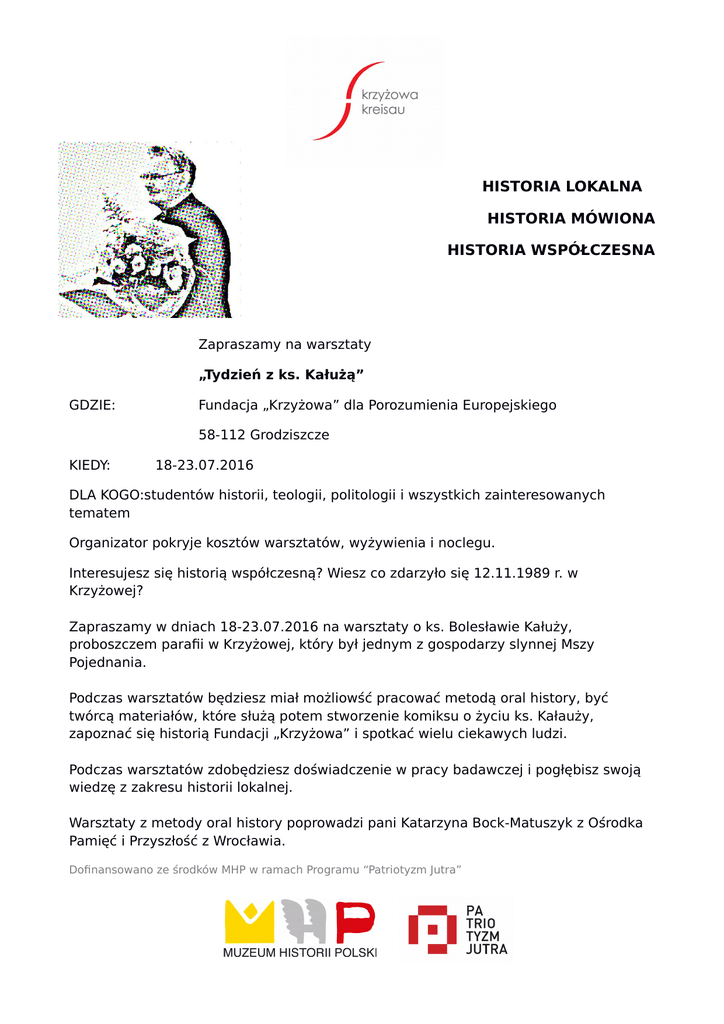 HISTORIA LOKALNA HISTORIA MÓWIONA HISTORIA WSPÓŁCZESNA Zapraszamy na warsztaty „Tydzień z ks. Kałużą” GDZIE: Fundacja „Krzyżowa” dla Porozumienia Europejskiego 58-112 Grodziszcze KIEDY: 18-23.07.2016 DLA KOGO:studentów historii, teologii, politologii i wszystkich zainteresowanych tematem Organizator pokryje kosztów warsztatów, wyżywienia i noclegu. Interesujesz się historią współczesną? Wiesz co zdarzyło się 12.11.1989 r. w Krzyżowej? Zapraszamy w dniach 18-23.07.2016 na warsztaty o ks. Bolesławie Kałuży, proboszczem parafii w Krzyżowej, który był jednym z gospodarzy slynnej Mszy Pojednania. Podczas warsztatów będziesz miał możliowść pracować metodą oral history, być twórcą materiałów, które służą potem stworzenie komiksu o życiu ks. Kałauży, zapoznać się historią Fundacji „Krzyżowa” i spotkać wielu ciekawych ludzi. Podczas warsztatów zdobędziesz doświadczenie w pracy badawczej i pogłębisz swoją wiedzę z zakresu historii lokalnej. Warsztaty z metody oral history poprowadzi pani Katarzyna Bock-Matuszyk z Ośrodka Pamięć i Przyszłość z Wrocławia. Dofinansowano ze środków MHP w ramach Programu “Patriotyzm Jutra” stan: na 23.06.2016 PROGRAM poniedziałek, 18.07.2016 Od 17.00 Rejestracja i zakwterowanie uczestników 18.00 Przedstawienie programu i uczestników 19.00 Kolacja 20.00-20.45 Projekcja filmu „ Freya von Moltke odwiedza Krzyżową” wtorek, 19.07.2016 8.00 Śniadanie 9.00 Zwiedzanie Krzyżowej śladami ks. Kałuży 11.00 Przerwa 11.30 Warsztaty z metody Oral history-Katarzyna Bock-Matuszyk z Ośrodka Pamięć i Przyszłość z Wrocławia 14.00 Obiad 14.00-17.30 Podział na 3 grupy i rozmowa ze świadkami czasu 18.00 Kolacja 19.00 spotkanie w Bibliotece i wspólna lektura fragmentów wspomnień o ks. Kałuży środa, 20.07.2016 8.00 Śniadanie 9.00 Omówienie dnia i spacer do Grodziszcza ok. 10.00 rozmowa z proboszczem Ks. Lic. Tadeuszem Fuksom i zwiedzenie Kościoła Parafialnego św. Anny w Grodziszczu 12.30 Obiad 14.00-17.30 Podział na 3 grupy i rozmowa ze świadkami czasu 18.00 Kolacja 19.00 spotkanie w Bibliotece i wspólna lektura fragmentów Kronik parafialnych czwartek, 21.07.2016 8.00 Śniadanie 9.00 Omówienie dnia 10.00 Spotkanie z panem Januszem Waligórą, rzecznikiem Gminy Świdnica, przekazanie dokumentów, które były zebrane w związku z nadaniem tytułu Honorowego Obywatelstwa Gminy Świdnica księdzu Bolesławowi Kałuży 12.00 Przerwa 12.30 Podział na grupy i rozmowa ze świadkami czasu i omówienie dokumentów z Kurii Biskupiej w Świdnicy 14.00 Obiad 14.00-17.30 Podział na 3 grupy i rozmowa ze świadkami czasu 18.00 Kolacja 19.00 Wspólny wieczór, ognisko piątek, 22.07.2016 8.00 Śniadanie 9.00 Omówienie dnia 09.30 Praca w grupach nad opracowaniem materiałów i przygotowanie prezentacji 13.00 Obiad 14.00-17.30 Praca w grupach nad opracowaniem materiałów i przygotowanie prezentacji 18.00 Kolacja 19.00 Prezentacja zebranych przez grupy materiałów sobota, 23.07.2016 8.00 Śniadanie 9.00 Zakończenie warsztatów, ewaluacja projektu 11.00 Wyjazd uczestników
