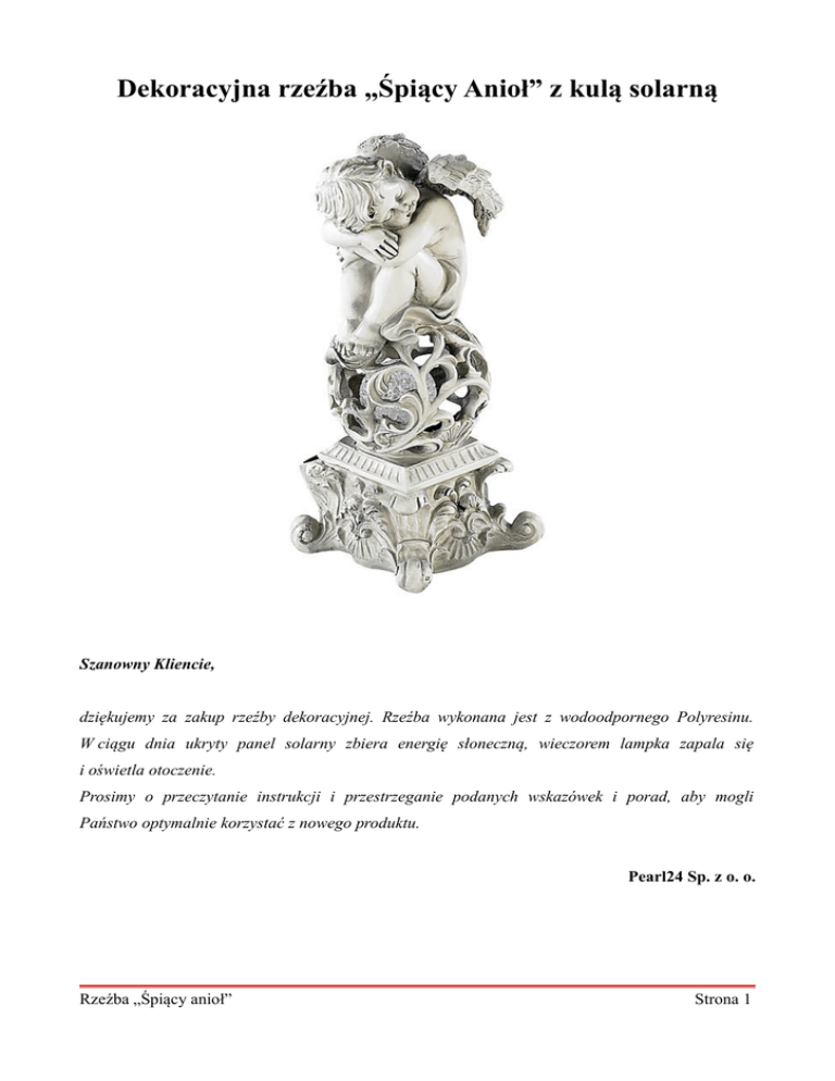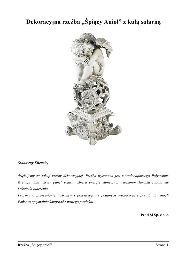 Dekoracyjna rzeźba „Śpiący Anioł” z kulą solarną Szanowny Kliencie, dziękujemy za zakup rzeźby dekoracyjnej. Rzeźba wykonana jest z wodoodpornego Polyresinu. W ciągu dnia ukryty panel solarny zbiera energię słoneczną, wieczorem lampka zapala się i oświetla otoczenie. Prosimy o przeczytanie instrukcji i przestrzeganie podanych wskazówek i porad, aby mogli Państwo optymalnie korzystać z nowego produktu. Pearl24 Sp. z o. o. Rzeźba „Śpiący anioł” Strona 1 Zawartość zestawu: • Dekoracja ogrodowa • Panel solarny z baterią typu AA (1,2 V) • Instrukcja obsługi. Wymiana akumulatora Wykręć 4 śruby na dole rzeźby. Wymień baterie typu AA (600 Ah, 1,2 V). Aby uzyskać najlepszą wydajność, należy wymieniać baterie raz na rok. Zastosowanie 1. Umieść rzeźbę w miejscu, gdzie ogniwo słoneczne może otrzymać maksymalną ilość światła słonecznego. Należy unikać miejsc pod drzewami lub takich, które są zacienione w ciągu dnia. Wewnętrzna bateria może inaczej nie ładować się prawidłowo. 2. Trzymaj ogniwo słoneczne zawsze czyste, aby jego funkcja nie została ograniczona. 3. Podczas zimy i jesieni czas świecenia może być krótszy. 4. Lampa włącza się automatycznie, gdy zintegrowany czujnik światła wykrywa, że jest ciemno. Funkcja ta może mieć negatywny wpływ na pobliskie źródła światła, takie jak latarnie uliczne. Należy zwrócić uwagę na umieszczanie światła, aby uniknąć bliskości źródła światła nocnego. 5. Naciśnij przycisk ON/OFF na dole rzeźby i ustaw ON. Lampa automatycznie włącza się o zmroku. 6. Jeśli nie chcesz korzystać z lampy, należy przełączyć urządzenie na OFF. Rzeźba „Śpiący anioł” Strona 2 Bezpieczeństwo • Niniejsza instrukcja ma na celu zapoznanie Państwa z zasadami prawidłowego korzystania z produktu. Zaleca się przechowywanie instrukcji w łatwo dostępnym miejscu, aby w razie potrzeby mogli Państwo zweryfikować informacje. • Wszelkie modyfikacje produktu obniżają poziom jego bezpieczeństwa. UWAGA! Istnieje ryzyko obrażeń! • Nie należy rozkładać (oprócz wymiany baterii) ani naprawiać urządzenia samodzielnie! • Zaleca się ostrożne obchodzenie się z produktem. Produkt może ulec uszkodzeniu w wyniku uderzenia, wstrząsów lub upadku nawet z niewielkiej wysokości. • Produkt należy trzymać z dala od wysokiej temperatury. • Nie należy zanurzać urządzenia w wodzie oraz innych płynach. • Nie należy umieszczać lampy w zagłębieniach lub na miękkim podłożu, gdzie może zatonąć w deszczu. • Dioda LED nie może być wymieniana. • Wszelkie prawa do wprowadzania zmian technicznych oraz eliminacji błędów są zastrzeżone. Ważne wskazówki dotyczące utylizacji Urządzenia elektrycznego nie zalicza się do odpadów gospodarstwa domowego. W celu właściwej utylizacji urządzenia należy skontaktować się z organizacją odpowiedzialną za zbiórkę elektroodpadów w wybranej miejscowości. Rzeźba „Śpiący anioł” Strona 3 Ważne wskazówki dotyczące baterii i ich utylizacji Baterii nie zalicza się do odpadów gospodarstwa domowego. Jako konsumenci są Państwo zobowiązani do właściwej utylizacji zużytych baterii. Zużyte baterie należy wyrzucić do przeznaczonego do tego celu pojemnika lub zwrócić do sklepu, w którym baterie są sprzedawane. • Akumulatory mają niższe napięcie wyjściowe niż baterie. Powoduje to, że niektóre urządzenia do działania potrzebują baterii, a nie akumulatora. • Nie należy dawać baterii dzieciom. • Baterie, z których wlewa się ciesz są niebezpieczne. Należy ich dotykać tylko w odpowiednich rękawiczkach. • Nie wolno otwierać baterii i wrzucać ich do ognia. • Zaleca się wyjmowanie baterii z urządzenia, jeśli pozostaje nieużywane przez dłuższy czas. • Zwykłe baterie nie mogą być ładowane. UWAGA! Istnieje ryzyko wybuchu! • Należy używać zawsze razem baterii tego samego typu i wymieniać wszystkie baterie w urządzeniu w tym samym czasie! Deklaracja zgodności PEARL.GmbH oświadcza, że produkt NC-6872 jest zgodny z dyrektywą EMV 2004/108/EG i dyrektywą RoHS 2011/65/UE. Rzeźba „Śpiący anioł” Strona 4