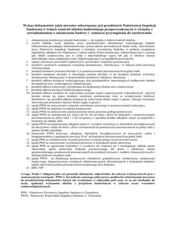 Wykaz dokumentów jakie inwestor zobowiązany jest przedstawić Państwowej Inspekcji Sanitarnej w trakcie kontroli obiektu budowlanego przeprowadzanych w związku z zawiadomieniem o zakończeniu budowy i zamiarze przystąpienia do użytkowania: 1. 2. 3. 4. 5. 6. 7. 8. 9. 10. 11. 12. 13. 14. 15. 16. 17. 18. 19. 20. 21. dokumentację projektową ( projekt budowlany ) - do wglądu w trakcie kontroli obiektu, wyniki badania wody pobranej przez przedstawiciela laboratorium wykonującego badania (laboratorium posiadające udokumentowany system jakości prowadzonych badań wody, zatwierdzony przez Państwowa Inspekcję Sanitarną) z instalacji wewnętrznej budynku, w punkcie czerpalnym najbardziej odległym od wodomierza ( analizy pełnej fizyko-chemicznej i bakteriologicznej w sytuacji gdy obiekt zaopatrywany jest w wodę z indywidualnego ujęcia lub gdy w obiekcie istnieje indywidualna stacja uzdatniania wody, bakteriologicznej w przypadkach pozostałych), opinię o drożności przewodów spalinowych i przewodów wentylacji grawitacyjnej protokół z pomiarów wydajności wentylacji mechanicznej / klimatyzacji / w zakresie ilości powietrza wentylacyjnego protokół pomiarów poziomu dźwięku A w pomieszczeniach przeznaczonych na pobyt ludzi protokół pomiarów dźwięku A określający poziom dźwięku A od urządzeń instalacji wentylacji mechanicznej /klimatyzacji/ w bezpośrednim sąsiedztwie zabudowy chronionej protokół odbioru przyłącza wodociągowego oraz przykanalików zapewniających podłączenie obiektu do miejskich sieci: wodociągowej i kanalizacyjnej protokół odbioru końcowego i przekazania do eksploatacji obiektu sieci ciepłowniczej protokół odbioru przyłącza elektroenergetycznego, protokół odbioru instalacji do wykrywania poziomu stężeń zanieczyszczeń wskaźnikowych , których poziom steruje np. pracą instalacji wentylacji mechanicznej wraz ze świadectwami kalibracji detektorów ( np. protokół odbioru instalacji do wykrywania tlenku węgla w garażu , którego wentylacja sterowana jest poziomem stężenia tlenku węgla w garażu ) zgodę PWIS na zastosowanie wyłącznie oświetlenia sztucznego w pomieszczeniach stałej pracy zgodę PWIS na zaniżenie wysokości pomieszczeń zgodę PWIS na umieszczenie poniżej poziomu terenu poziomu podłogi pomieszczeń zgodę PWIS na zmniejszoną nie więcej niż do 5m od okien i drzwi do budynków z pomieszczeniami przeznaczonymi na pobyt ludzi i 1,5m od granicy z sąsiednią działką odległość miejsc na pojemniki i kontenery na odpady stałe zgodę PWIS na pomniejszoną odległość pokryw i wylotów wentylacji ze zbiorników bezodpływowych na nieczystości ciekłe od okien i drzwi zewnętrznych do pomieszczeń przeznaczonych na pobyt ludzi i granicy działki sąsiedniej stanowisko PWIS dotyczące odległości zbiorników bezodpływowych na nieczystości ciekłe i kompostowników o pojemności powyżej 50 m3 od budynków przeznaczonych na pobyt ludzi zgodę PPIS na zlokalizowanie wyrzutni powietrza wentylacyjnego na powierzchni terenu zgodę PPIS na zastosowanie recyrkulacji powietrza w budynkach opieki zdrowotnej zgodę PPIS na ogrzewanie budynków o wysokości nie większej niż 3 kondygnacje zakładu opieki zdrowotnej, opieki społecznej, budynku przeznaczonego dla dzieci i młodzieży, lokalu gastronomicznego, pomieszczeń przeznaczonych do produkcji żywności i środków farmaceutycznych z lokalnej kotłowni na paliwo stałe zgodę PWIS na lokalizację pomieszczeń charakterze gospodarczym, technicznym, zaopatrzenia medycznego, diagnostycznym, socjalnych, administracyjnych, laboratoryjnych w budynkach zakładów opieki zdrowotnej poniżej poziomu terenu urządzonego przy budynku. KRS, NIP Uwaga: Punkt 1 obligatoryjnie zaś pozostałe dokumenty odpowiednio do zakresu wykonywanych prac i zastosowanych rozwiązań. PPIS w Żyrardowie zastrzega sobie prawo możliwości zobowiązania inwestora do przedstawienia dokumentów innych niż wymienione w załączniku jeśli uzna, że są one niezbędne do oceny zgodności wykonania obiektu z projektem budowlanym w zakresie oceny warunków sanitarnohigienicznych. PPIS – Państwowy Powiatowy Inspektor Sanitarny w Żyrardowie PWIS - Państwowy Wojewódzki Inspektor Sanitarny w Warszawie