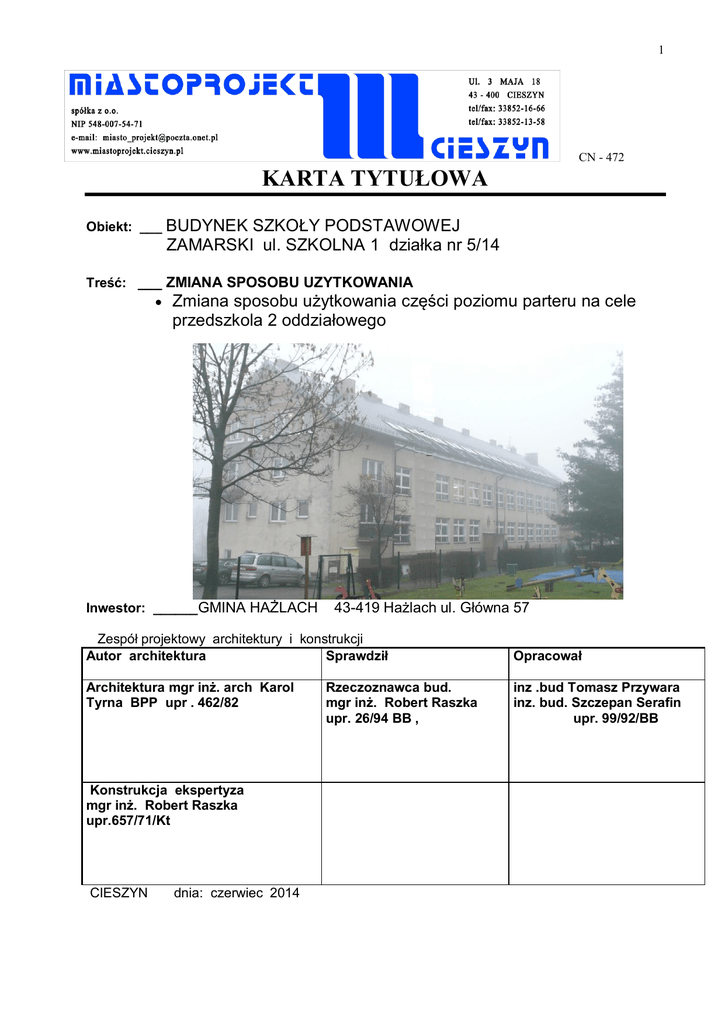 1 CN - 472 KARTA TYTUŁOWA SZKOŁY PODSTAWOWEJ ZAMARSKI ul. SZKOLNA 1 działka nr 5/14 Obiekt: ___ BUDYNEK Treść: ___ ZMIANA SPOSOBU UZYTKOWANIA Zmiana sposobu użytkowania części poziomu parteru na cele przedszkola 2 oddziałowego Inwestor: ______GMINA HAŻLACH 43-419 Hażlach ul. Główna 57 Zespół projektowy architektury i konstrukcji Autor architektura Sprawdził Architektura mgr inż. arch Karol Tyrna BPP upr . 462/82 Konstrukcja ekspertyza mgr inż. Robert Raszka upr.657/71/Kt CIESZYN dnia: czerwiec 2014 Rzeczoznawca bud. mgr inż. Robert Raszka upr. 26/94 BB , Opracował inz .bud Tomasz Przywara inz. bud. Szczepan Serafin upr. 99/92/BB 2 SPIS TREŚCI Karta tytułowa Spis treści Oświadczenie I część formalno –prawna - Wypis z z Miejscowego planu Zagosp. PR.6727.024.2014 II Cześć opisowa Opis budowlany Stan istniejący Stan projektowany Ekspertyza techniczna Bioz plan III Część rysunkowa Plan sytuacyjny ........................................skala 1: 500 Rzut parteru ……………….....................skala 1: 50 Przekrój 1-1…......................................... skala 1: 50 Przekrój 2-2…......................................... skala 1: 50 Zestawienie stolarki drzwi rys. nr.1 rys. nr.2 rys. nr.3 rys. nr.4 rys. nr 5 Stan istniejący Rzut parteru ……………….....................skala 1: 50 Przekrój 1-1…......................................... skala 1: 50 rys. nr.I-1 rys. nr. I-2 3 OŚWIADCZENIE Projektanta : Na podstawie art. 20 ust 4 Ustawy z dnia 7 lipca 1994 roku Prawo Budowlane ( Dz.U. z 2013 r poz. 1409) oświadczamy że: Projekt budowlany zmiany sposobu użytkowania części poziomu parteru na cele przedszkola 2 oddziałowego w budynku szkoły podstawowej w Zamarski ul. Szkolna 1 został wykonany zgodnie z przepisami prawa budowlanego i zasadami wiedzy technicznej- został wykonany zgodnie zobowiązującymi przepisami oraz zasadami wiedzy technicznej Projektanci; Architektura mgr. inż. arch. Karol Tyrna Konstrukcja ekspertyza tech mgr. inz. Robert Raszka Instalacje sanitarne mgr. inz. Szczepan Serafin Instalacje elektryczne tech. Jan Wałach Sprawdzający; Architektura mgr. inż. . Robert Raszka ( rzeczoznawca) Instalacje sanitarne inz. bud. Irena Swarowska Instalacje elektryczne mgr .inz. Kurt Prochaczek 4 Opis budowlany do projektu budowlanego zmiany sposobu użytkowania części parteru na funkcje przedszkola 2 oddziałowego w budynku Szkoły Podstawowej w Zamarskach przy ul. Szkolnej 1 na terenie dz. 5/14 1. Podstawa opracowania - umowa z inwestorem nr PR 7031.01.2014 wizja lokalna, pomiary sprawdzające stanu istniejącego uzgodnienia służbami Sanepid , p-poż i BHP Rozporządzenie Ministra Infrastruktury z 12 kwietnia 2002 r. w sprawie warunków technicznych, jakim powinny odpowiadać budynki i ich usytuowanie (Dz.U. nr 75 póz. 690) z późniejszymi zmianami 2. Przedmiot i cel opracowania Przedmiotem opracowania jest wykonanie projektu zamiennego zmiany sposobu użytkowania poziomu parteru na funkcję przedszkola 2 oddziałowego z przystosowaniem zmian do obowiązujących przepisów w zakresie sanitarnych i p - poż. w budynku Szkoły Podstawowej w Zamarskach przy ul. Szkolnej 1 . Zakres opracowania obejmuję : = zmianę przeznaczenia funkcji części poziomu parteru na funkcję przedszkola o pow. użytkowej 316,38 m2 = projekt nie przewiduje ingerencji w elementy konstrukcyjne budynku jak i zagospodarowania terenu szkoły = brak konieczności występowania o zwiększenie zapotrzebowania na istniejące media ( wody zimnej, energii elektrycznej , czynnika grzewczego do ogrzewania pomieszczeń ,kotłownia po wymianie kotła gazowego ) 3 Opis stanu istniejącego i zawansowania prac budowlanych Teren, na którym znajduje się niniejszy budynek znajduję się na działkach nr 5/14 w miejscowości Zamarski . Obecnie w budynku prowadzone są prace budowlane na podstawie uzyskanego pozwolenia na budowę WBEG 7351/2006/2008/2009/52 oraz EG 7351/2006/2008/67/14 obejmujące dobudowę łacznika z sala gimnastyczną , ocieplenie budynkuoraz zmianę sposobu uzytkowania poziomu poddasza na cele dydaktyczne . Obecnie nadal trwają prace bud-wykończeniowe w części łącznika oraz prace termomodernizacji budynku . Omawiany budynek jest budynkiem 3 kondygnacyjnym z poddaszem nieużytkowym o wysokości całkowitej 16, 58 m z dachem 2 spadowym o kącie nachylenia 35 stopni . W poziomie przyziemia znajduję się przedszkole 2 oddziałowe , które docelowo zostanie ( przeniesione) na poziom parteru . Parametry techniczne budynku wraz łącznikiem są zgodne z zatwierdzoną dokumentacją techniczną gdzie: Pow. zabudowy wynosi 997,48 m2 Kubatura wynosi 11840,75 m3 Pow. użytkowa wynosi 1948,35 m2 Budynek szkoły posiada dostęp do ulicy Szkolnej po przez dojazd przez działkę o długości około 100 m. Przed ścianą szczytową budynku od strony dojazdu znajduję się plac dojazdowo –manewrowy. Wzdłuż frontowej ściany budynku znajduję się ciąg pieszo jezdny o szerokości 4,0-4,5 m. Obiekt jest wyposażony we wszystkie niezbędne techniczne wew. instalacje. Wew. instalacja hydrantowa jak i klatka schodowa główna zostanie przebudowana w związku z dostosowaniem jej do obecnie obowiązujących przepisów p-poż. Obiekt posiada obecnie 4 wyjścia zewnętrzne w tym 2 na poziomie parteru oraz 2 na poziomie przyziemia. Cześć gdzie znajduję się mieszkanie służbowe posiada swoja niezależne wejście z klatką schodową i jest wydzielone z całości obiektu. Poziom parteru gdzie przewidziano lokalizację przedszkola ma wyjście bezpośrednio na teren wokół budynku jak i po przez układ istniejącej wydzielonej p-poz klatki schodowej 4 Zgodność projektowanego zadania z zapisami Miejscowego Planu Zagospodarowania Planowana inwestycja jest zgodna z załączonym Miejscowym Planem Zagospodarowania. Max wskaźnik pow. zabudowy wynosi 25 % - ( nie dotyczy) brak ingerencji w pow. istn. zabudowy Min pow. biologicznie czynna wynosi 60 % - ( nie